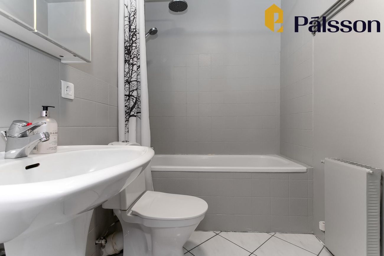 Baðherbergi: Flísar á gólfi og veggjum, hvít innrétting, baðkar með sturtuaðstöðu, salerni. Tengi fyrir þvottavél og þurrkara.