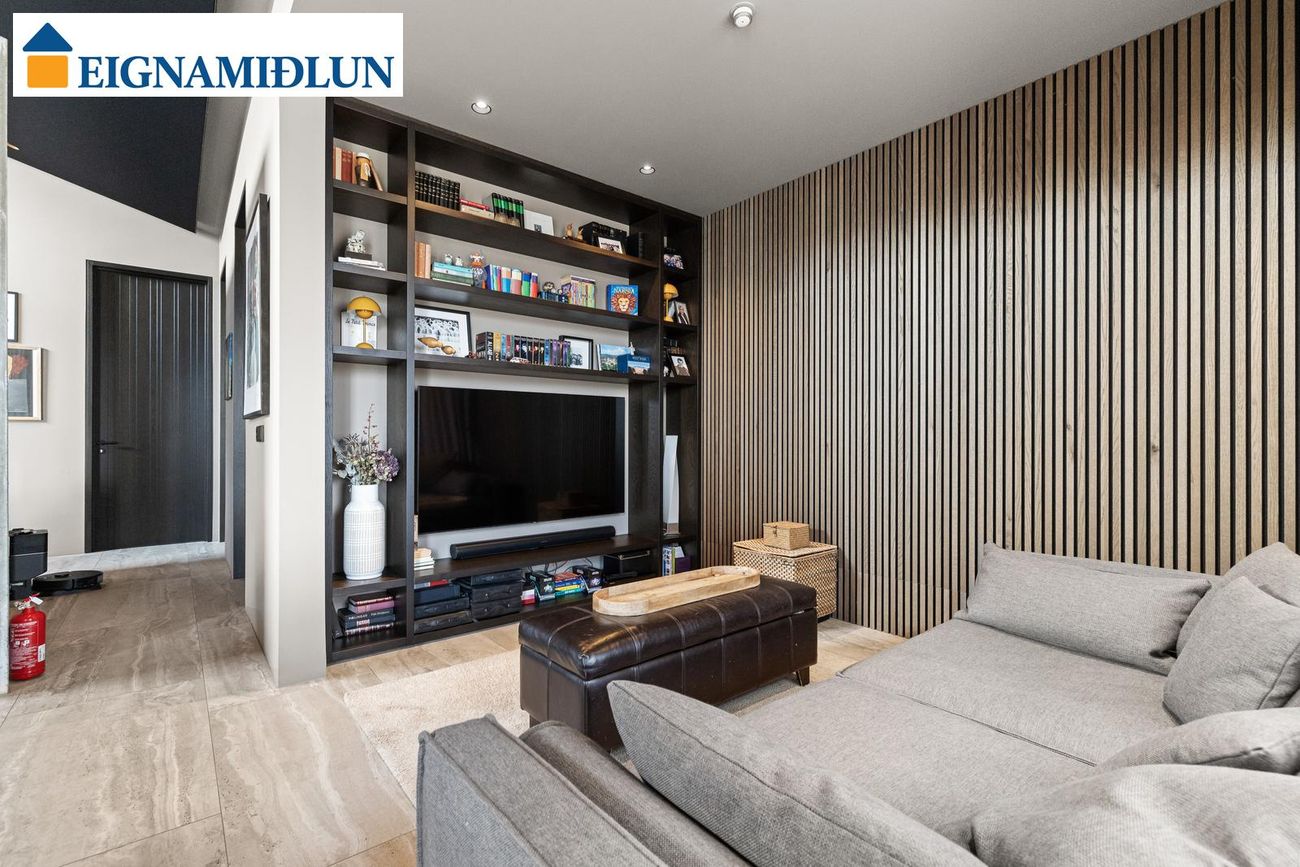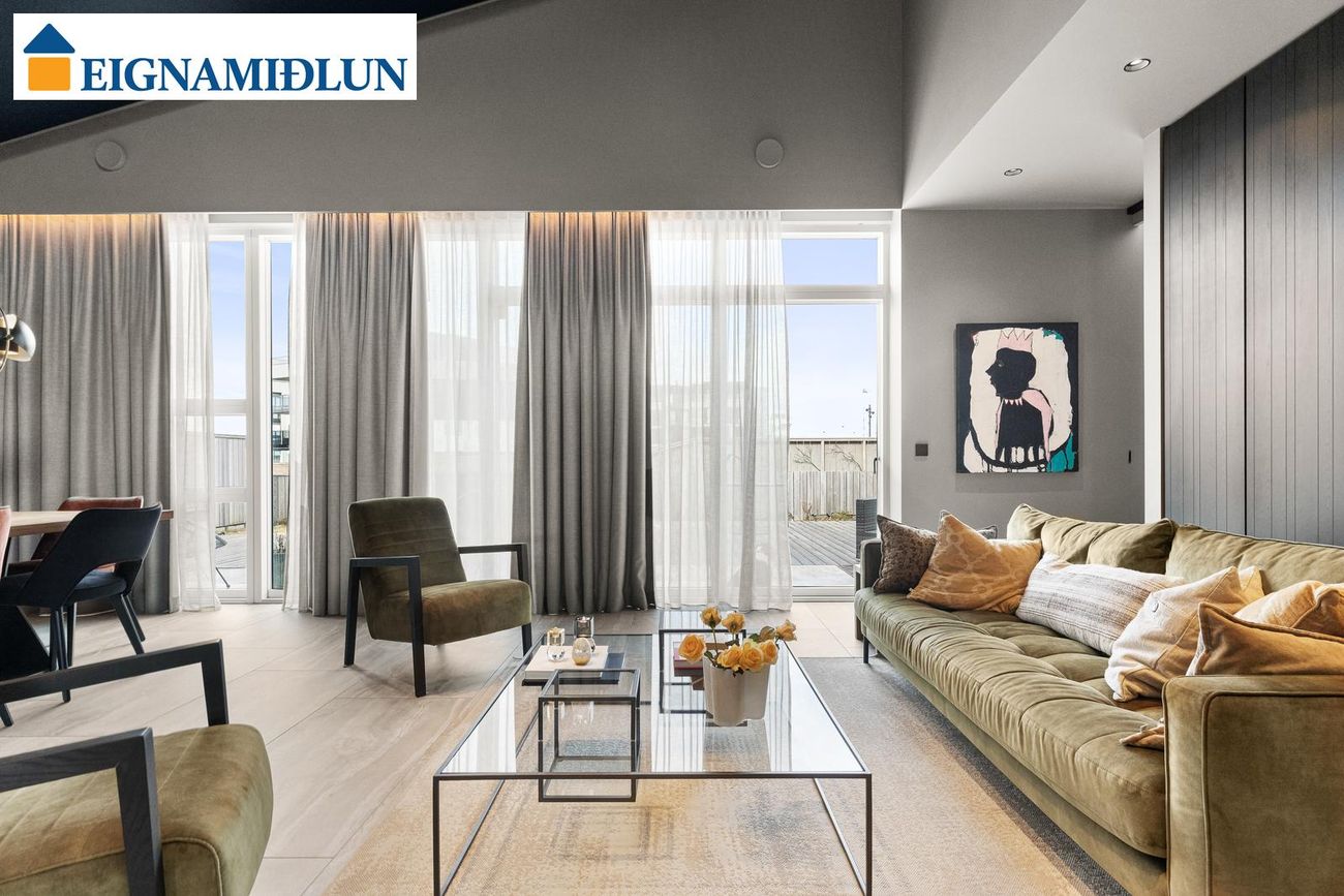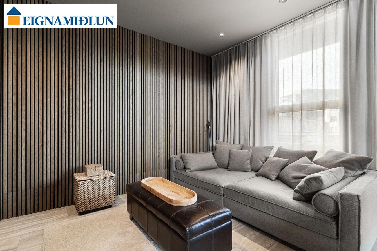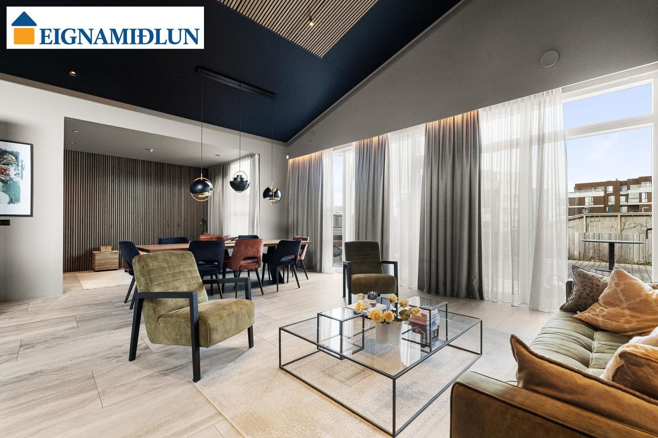 Stofa: Björt og falleg stofa með gólfssíðum gluggum, innbyggðar innréttingar, mikil lofthæð og útgengt er út á verönd. Hljóðloft er í stofu og eldhúsi. Flísar á gólfi.