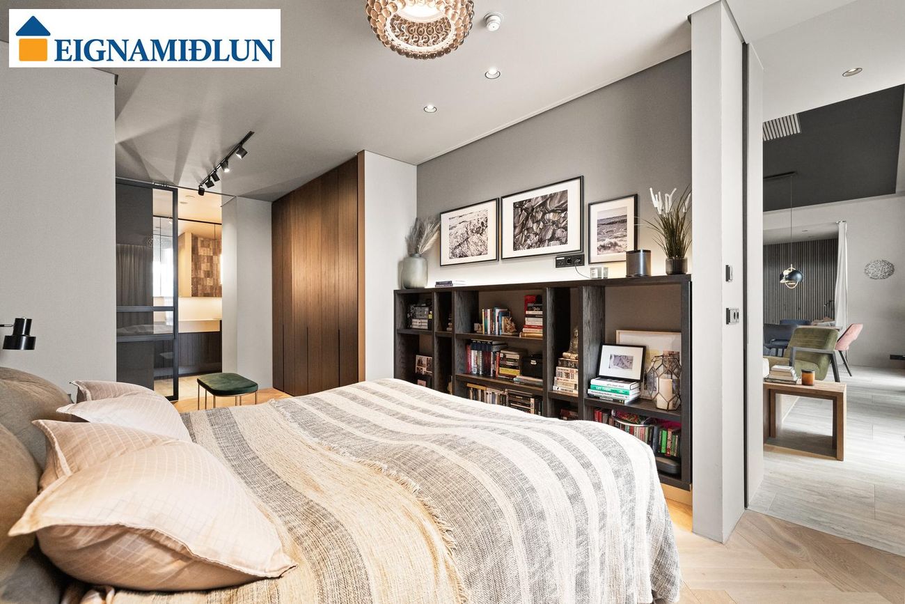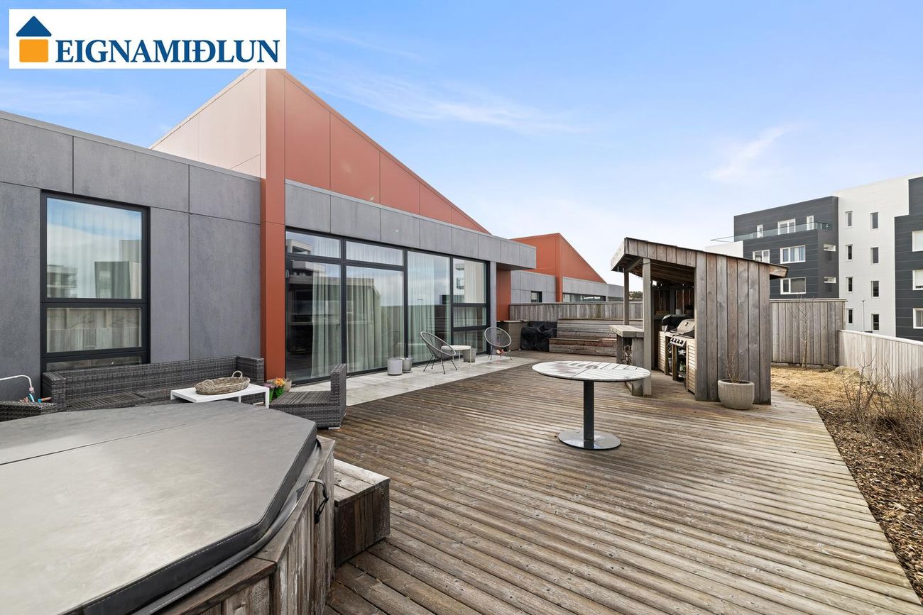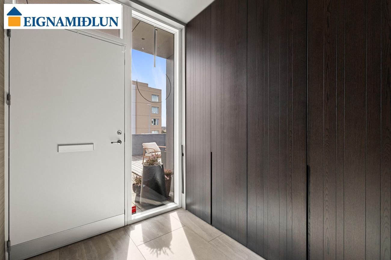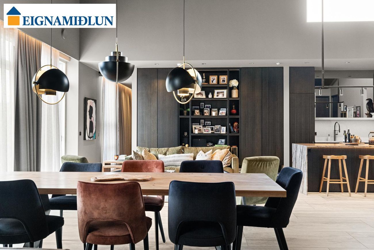 Stofa: Björt og falleg stofa með gólfssíðum gluggum, innbyggðar innréttingar, mikil lofthæð og útgengt er út á verönd. Hljóðloft er í stofu og eldhúsi. Flísar á gólfi.