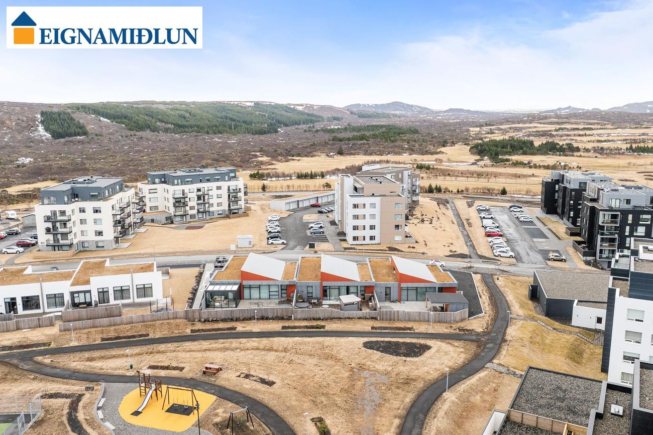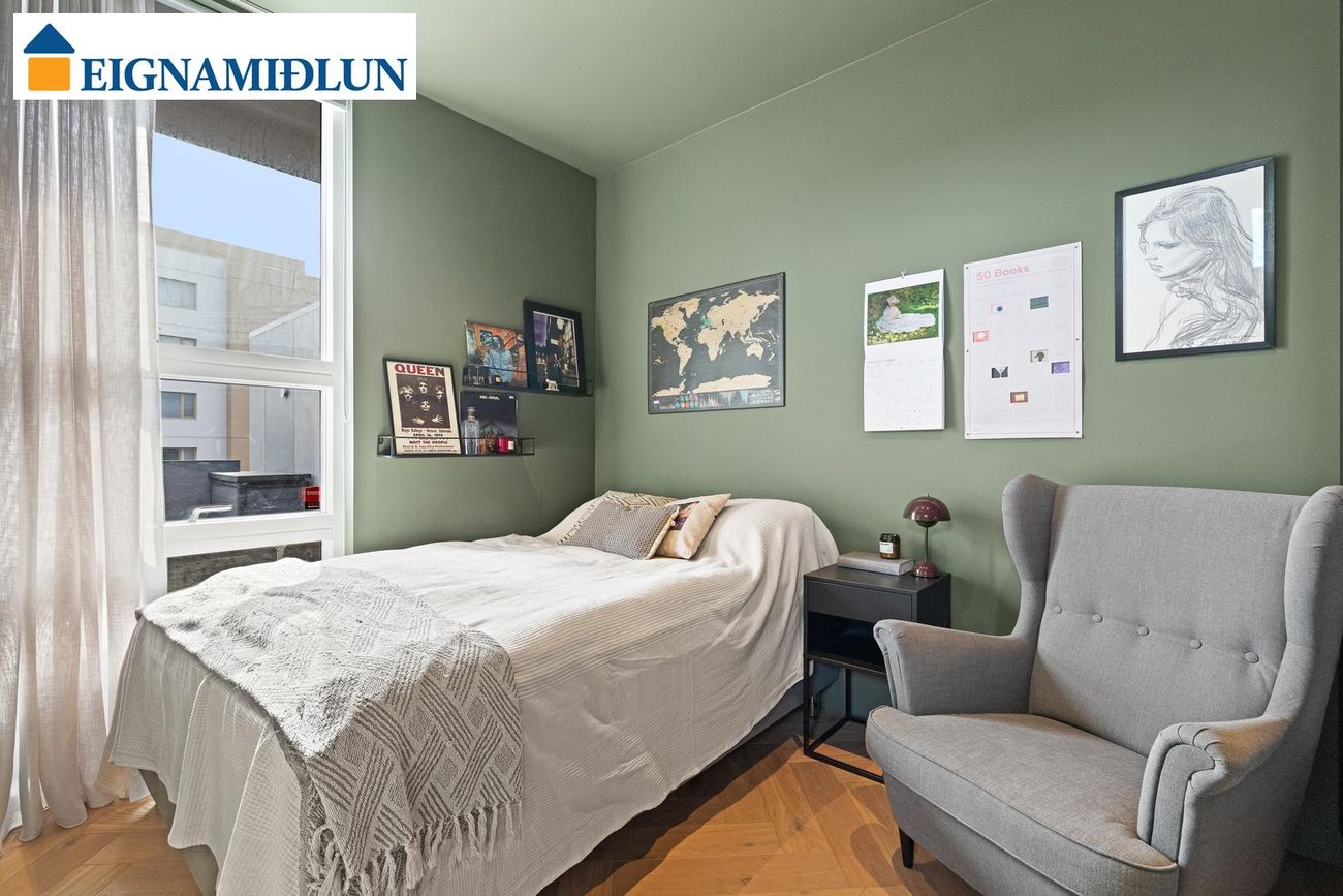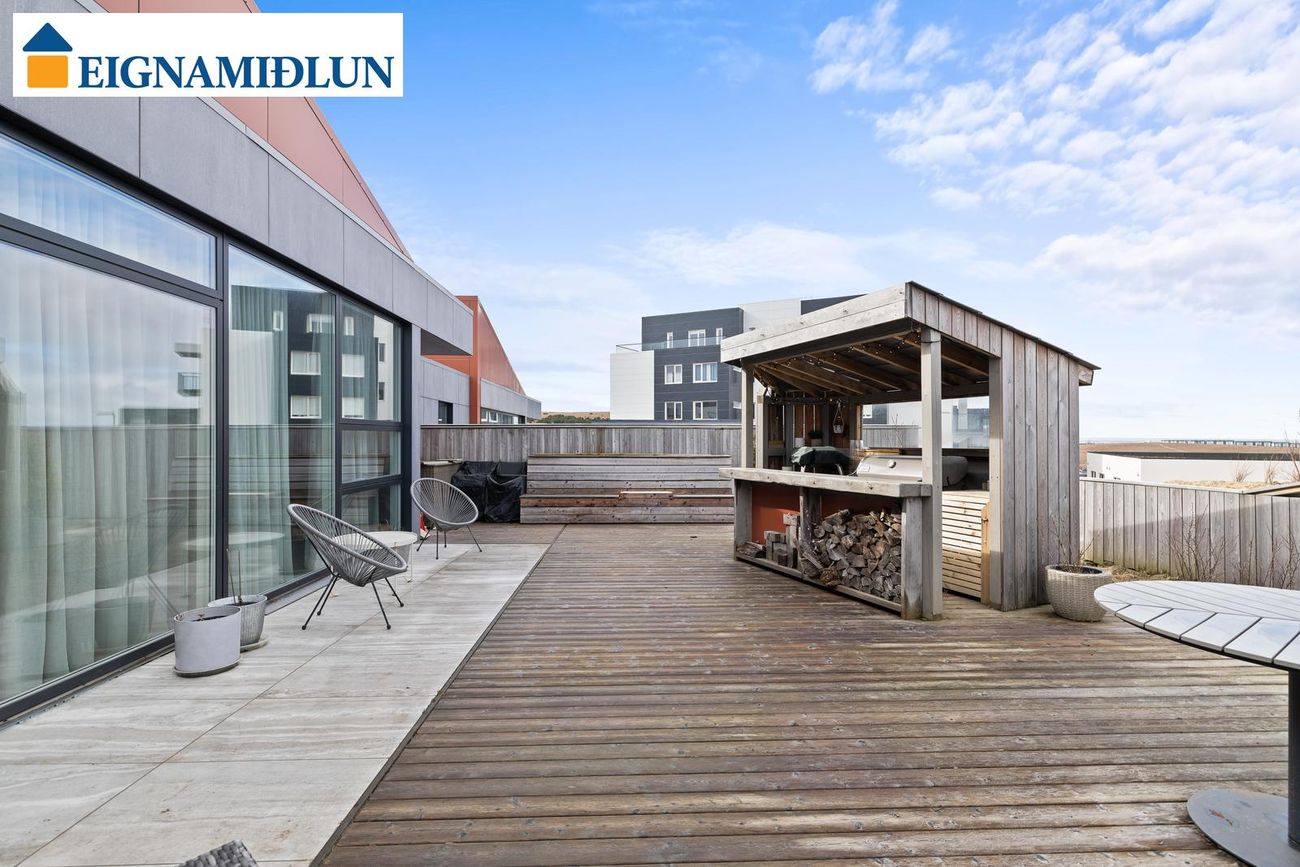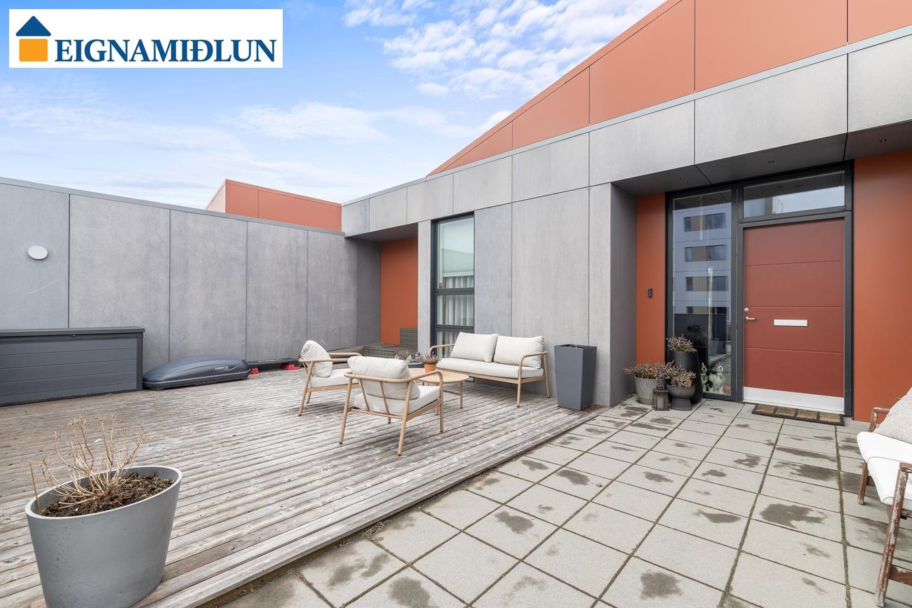 Stofa: Björt og falleg stofa með gólfssíðum gluggum, innbyggðar innréttingar, mikil lofthæð og útgengt er út á verönd. Hljóðloft er í stofu og eldhúsi. Flísar á gólfi.