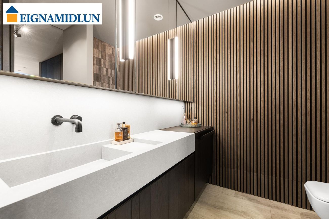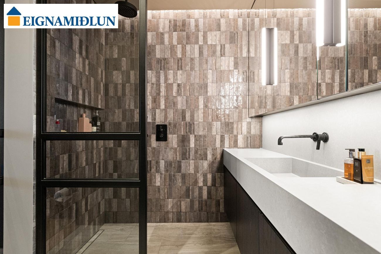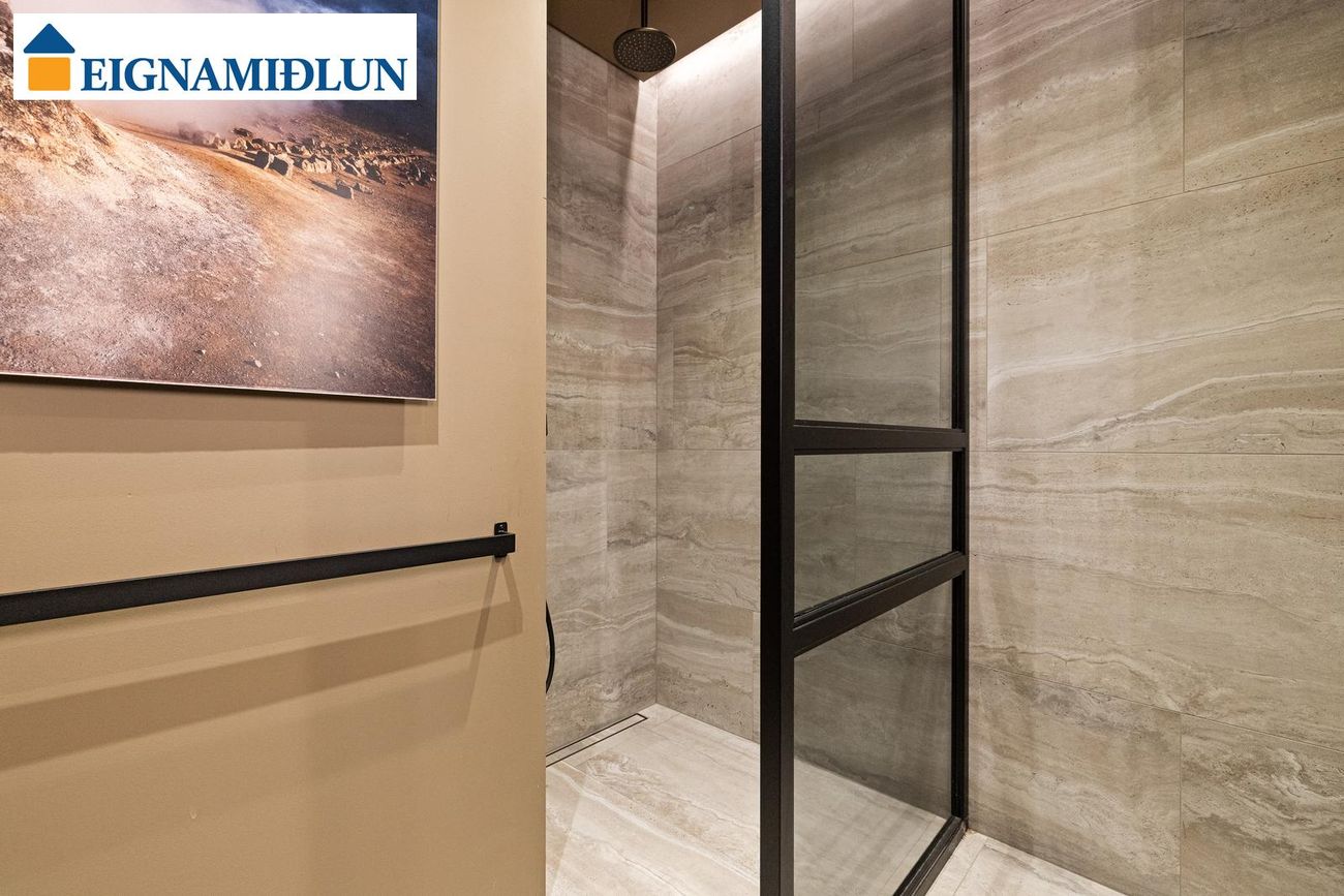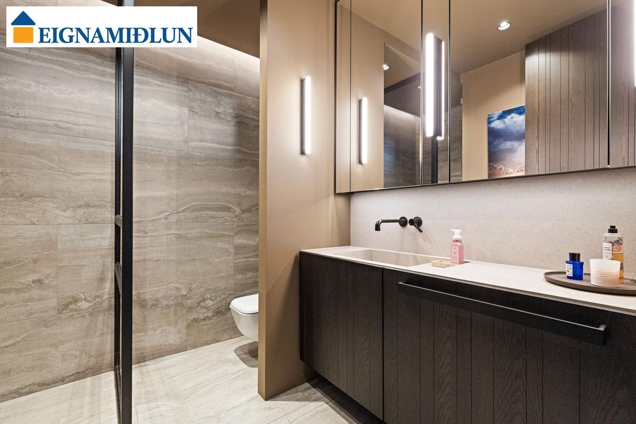 Baðherbergi: Eru tvö. Bæði baðherbergi eru með sturtu og glerskilrúmi. Innréttingar frá Beyki með stein á borðum og vaskar smíðaðir úr sama efni. Flísar eru á gólfi og veggjum að hluta.