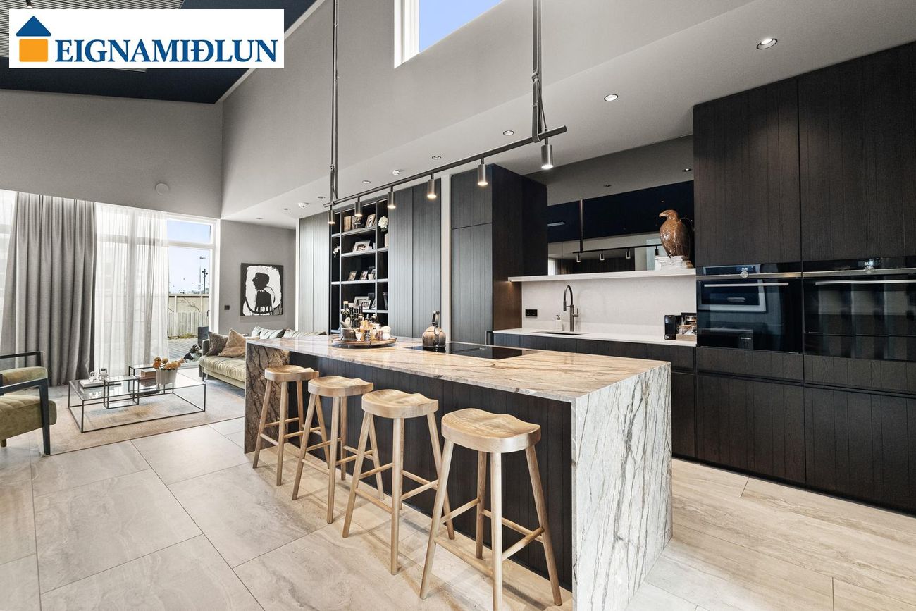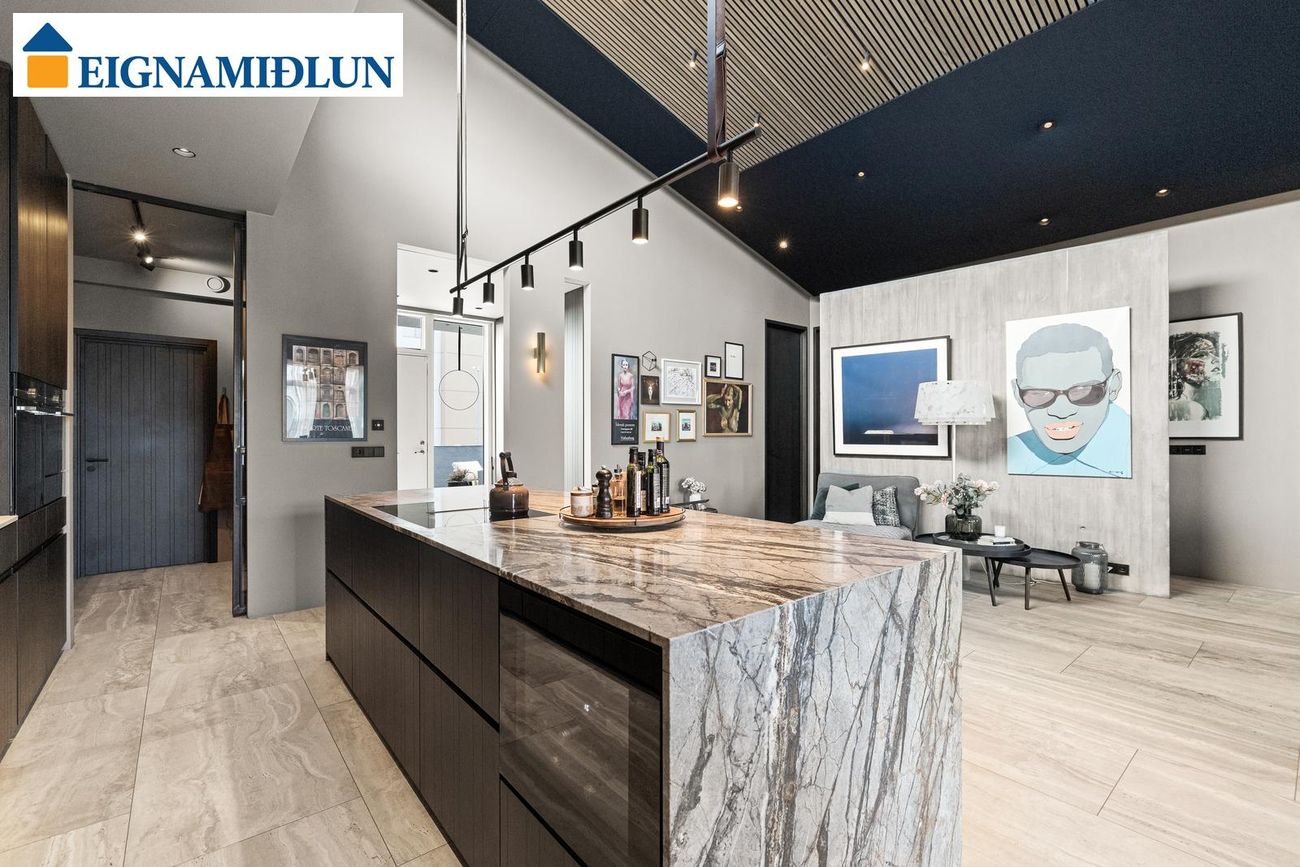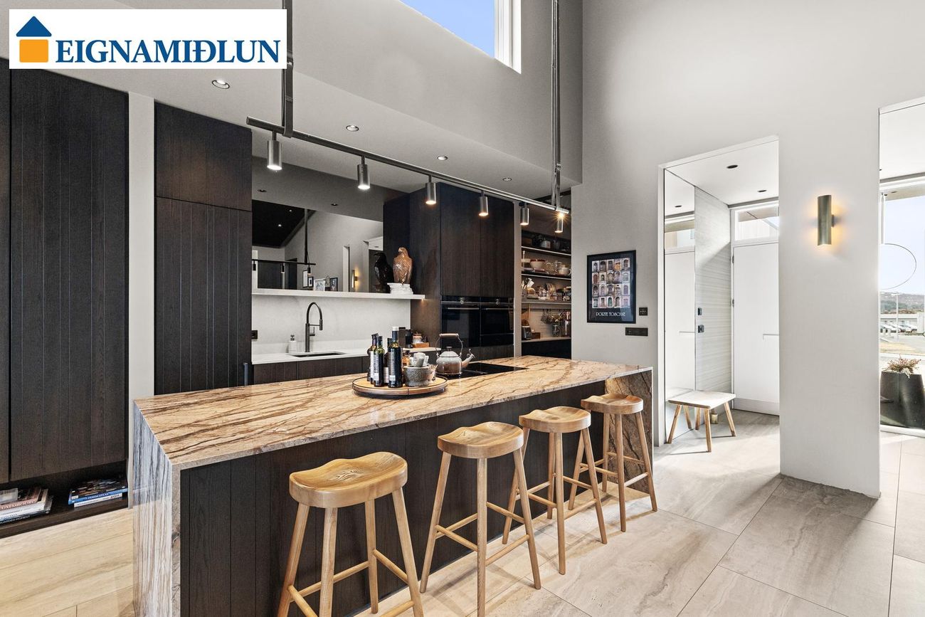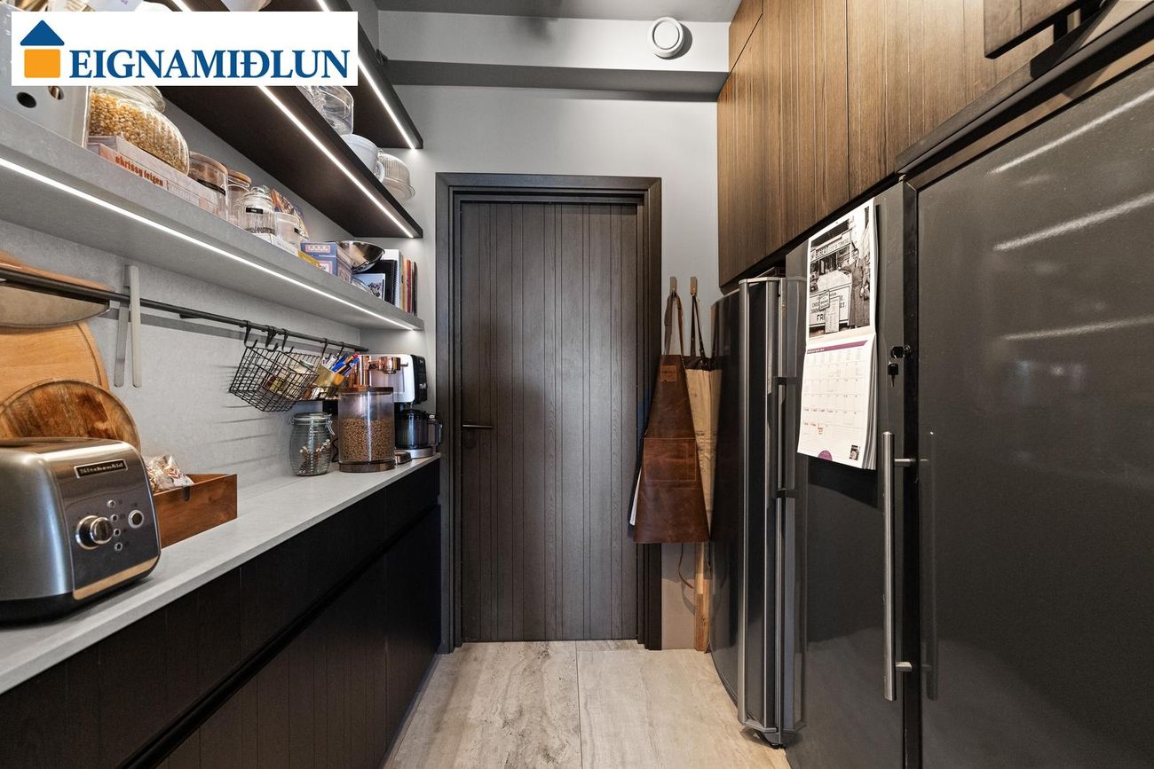 Eldhús: Falleg innrétting frá Beyki með marmara á borði, innfellt span hellurborð með innbyggðum gufugleypi, innbyggð uppþvottavél, tveir ofnar í vinnuhæð, vínkælir og innbyggður ísskápur. Innaf eldhúsi er búreldhús sem hægt er að loka með rennihurð. Þar er innrétting og aðstaða fyrir auka ísskápa.