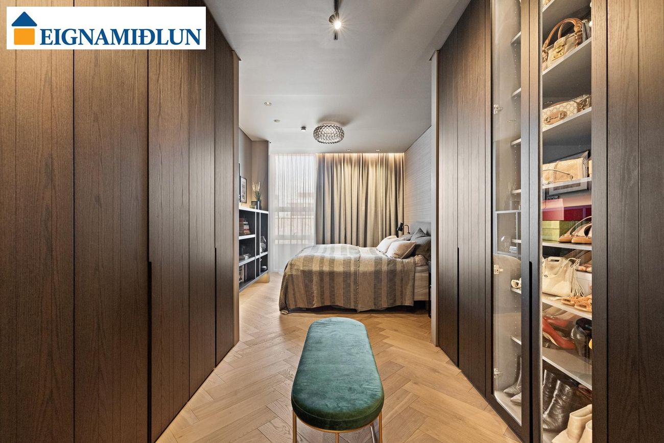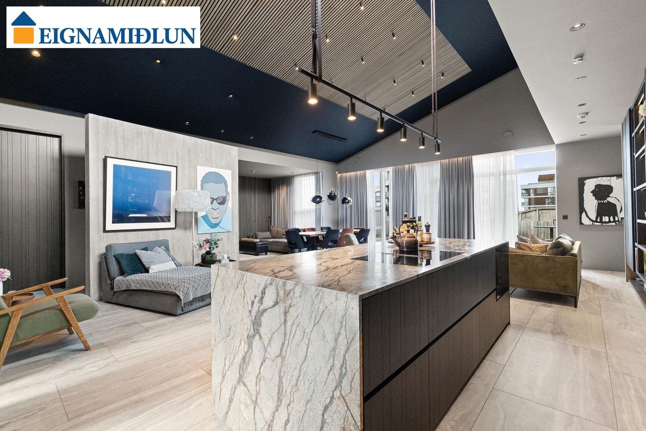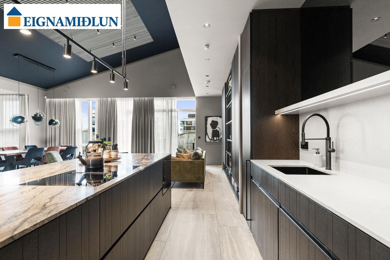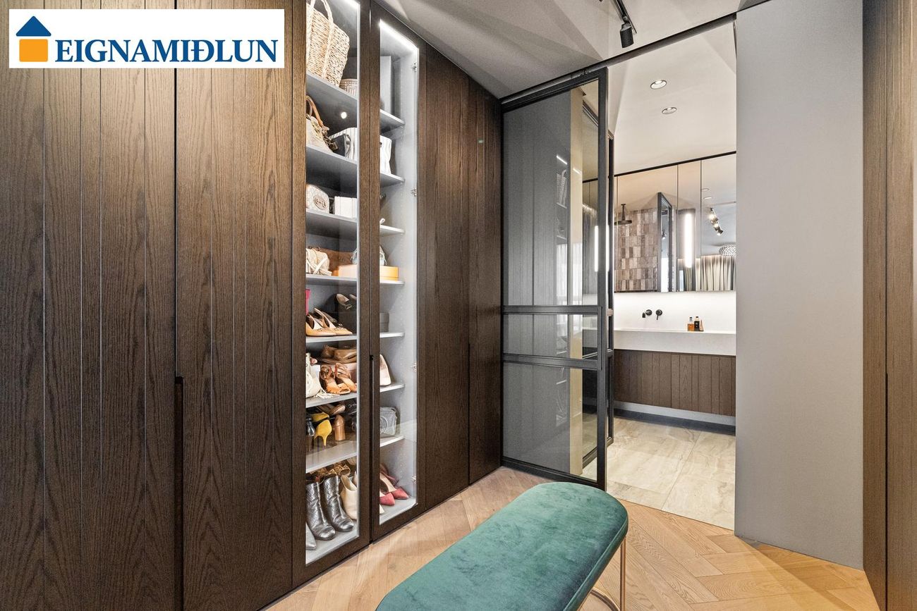 Eldhús: Falleg innrétting frá Beyki með marmara á borði, innfellt span hellurborð með innbyggðum gufugleypi, innbyggð uppþvottavél, tveir ofnar í vinnuhæð, vínkælir og innbyggður ísskápur. Innaf eldhúsi er búreldhús sem hægt er að loka með rennihurð. Þar er innrétting og aðstaða fyrir auka ísskápa.