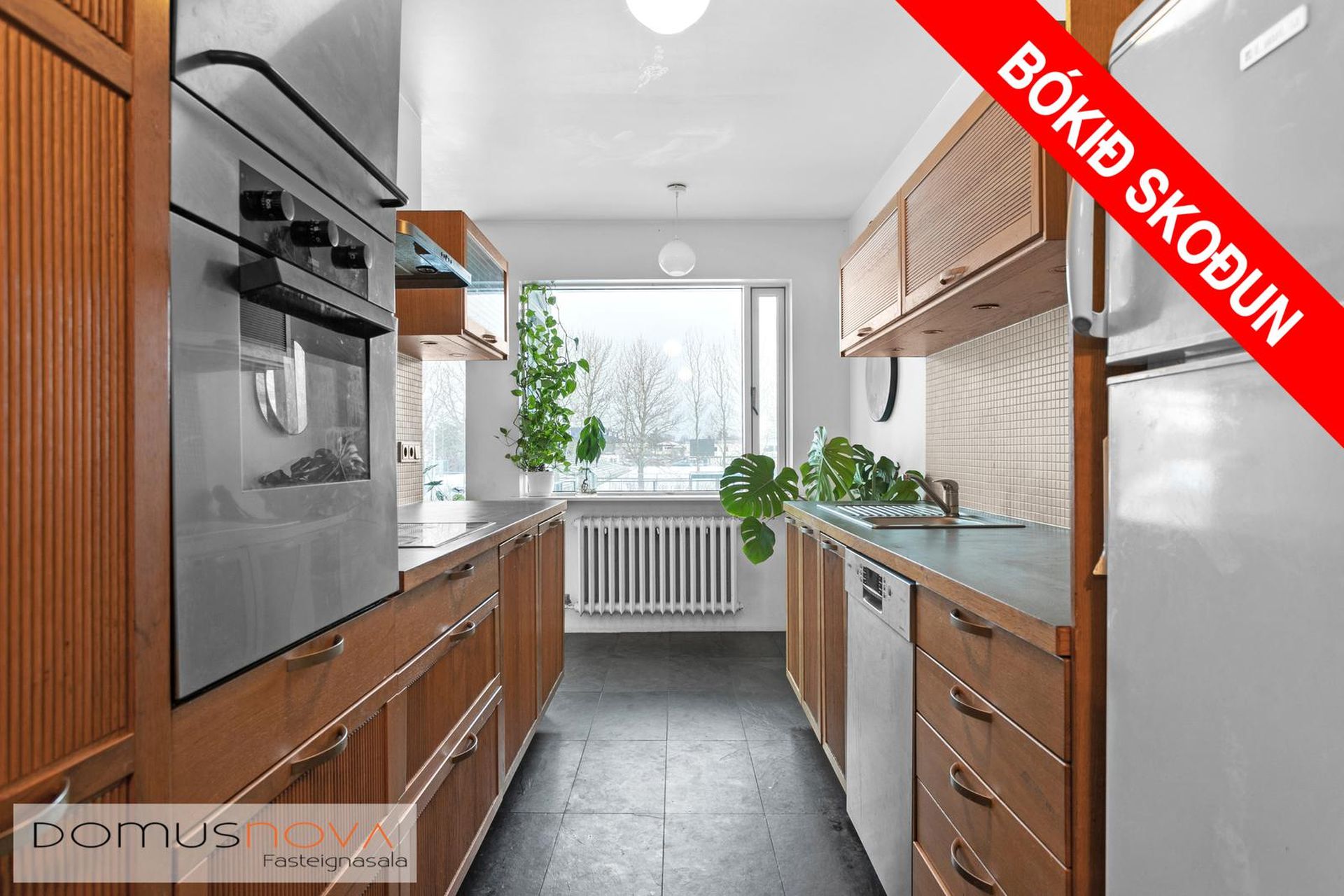 Eldhús rúmgott og bjart með filmaðri hvítri innréttingu tækjum frá Bosch og helluborð er með spansuðu. Borðkrókur við glugga ef vilji er fyrir því, harðparket á gólfi.