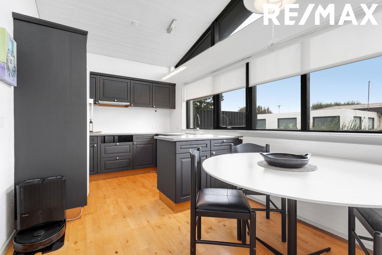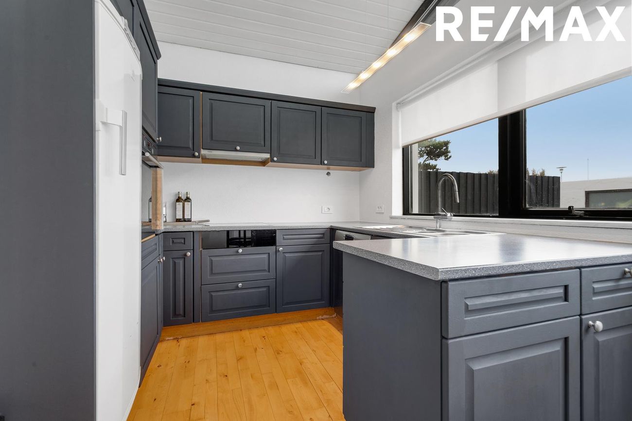 Parket á gólfi, gott skápa- og borðpláss, tengi fyrir uppþvottavél, helluborð og gufugleypir, ofn í vinnuhæð, góður borðkrókur.