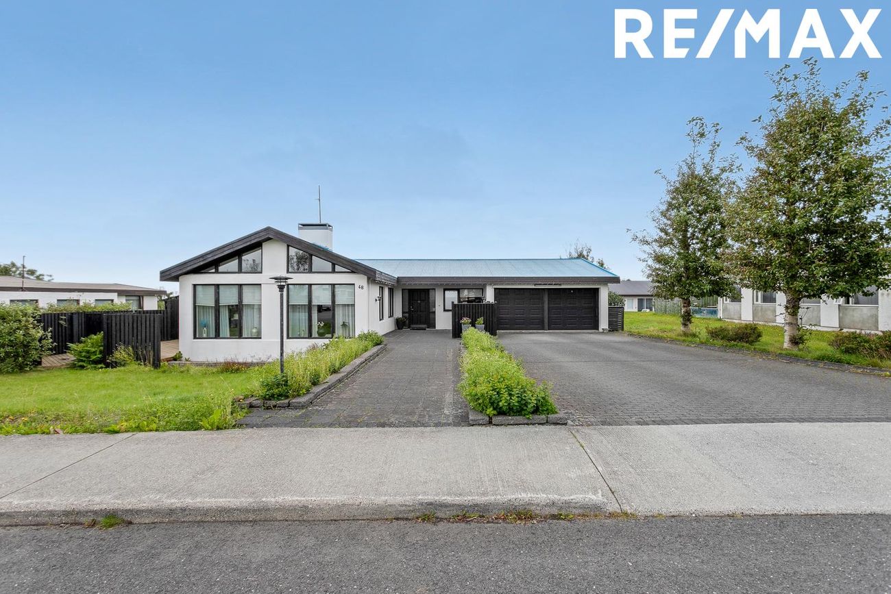 Bílskúr með flísar á gólfi, 2 innkeyrsluhurðar, góð lofthæð, heitt og kalt vatn, skolvaskur, gluggar.