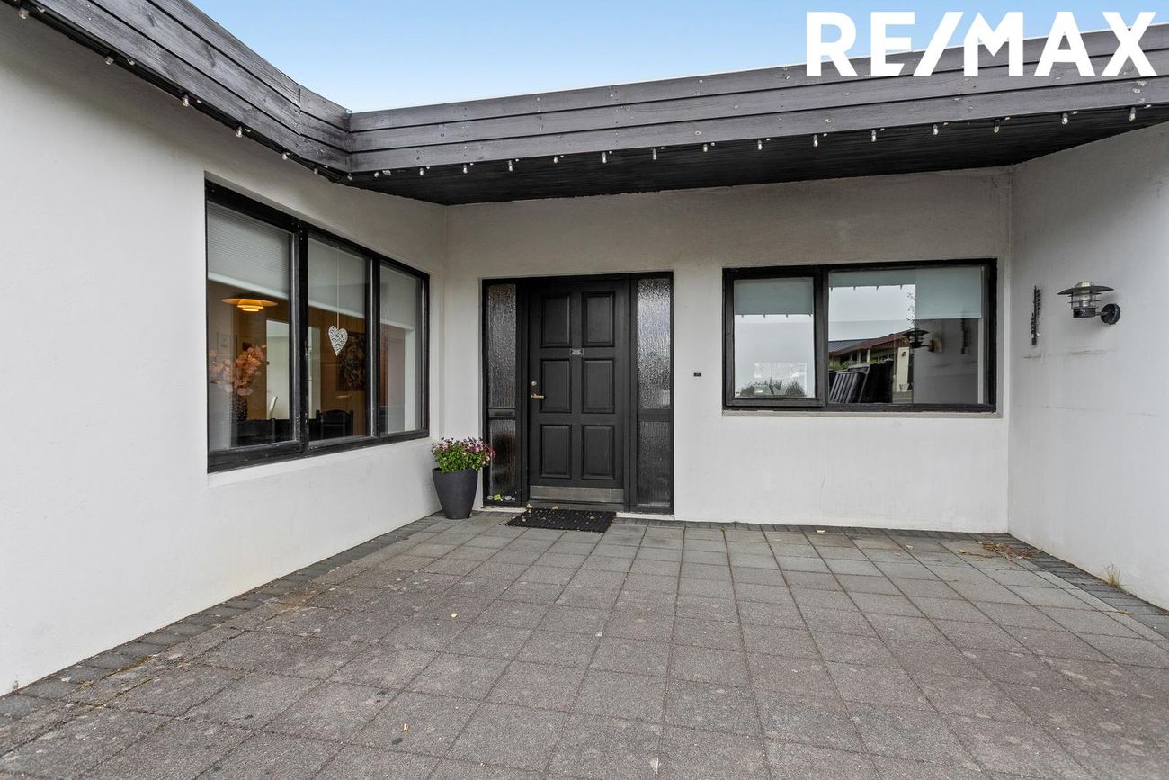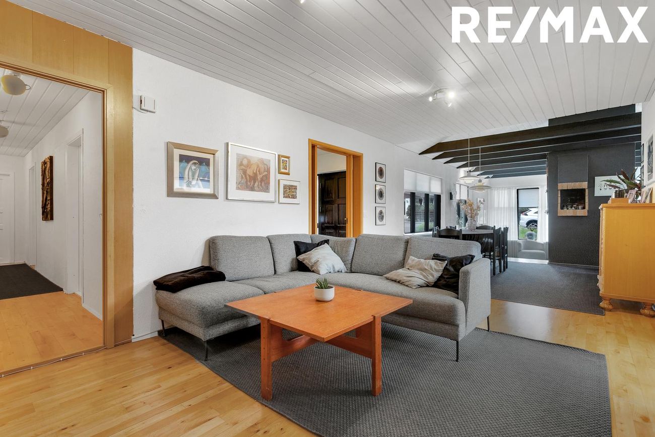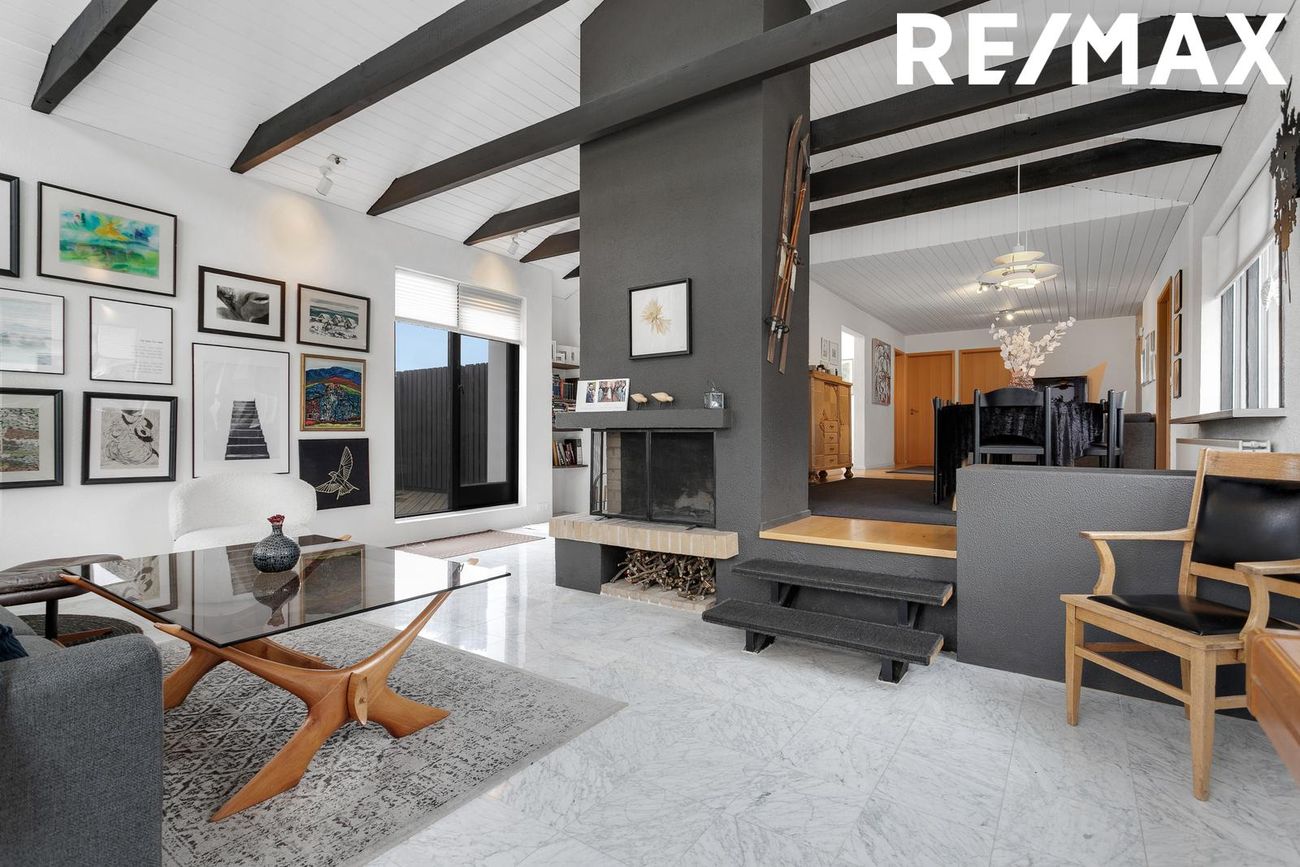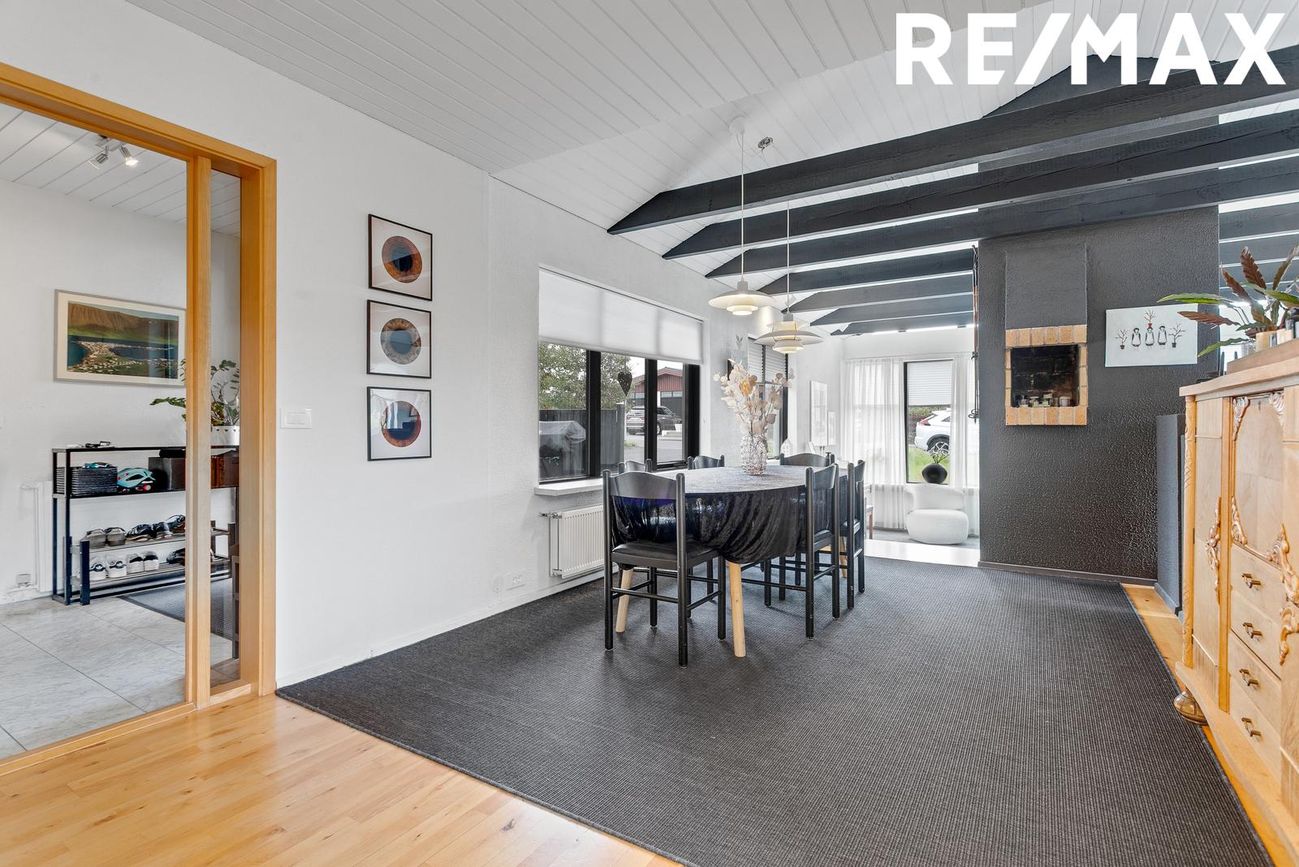 Flísar á gólfi, opin og björt, góð lofthæð, fallegir bitar í lofti, fallegur arinn, útgengt út á timburverönd með skjólveggjum.