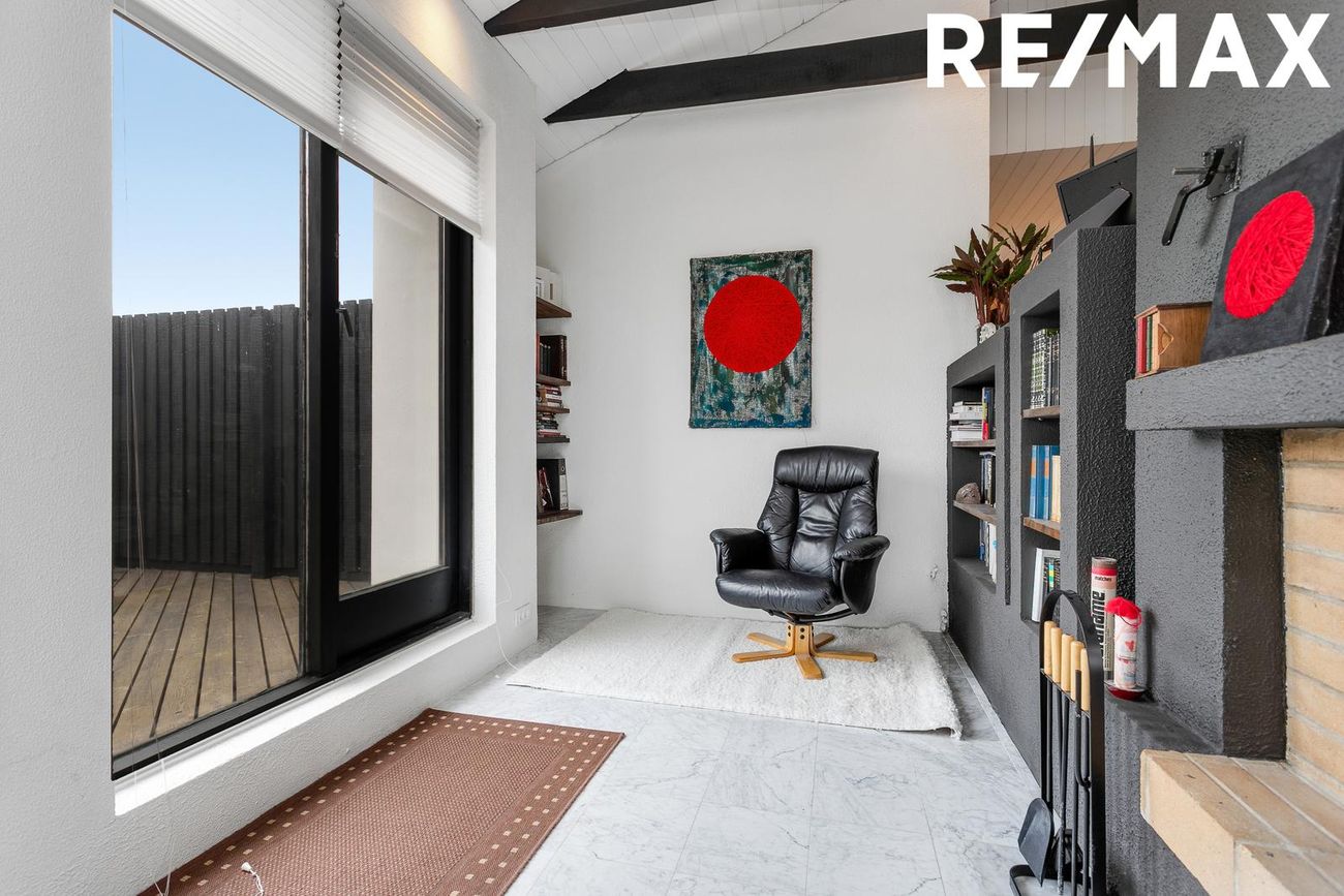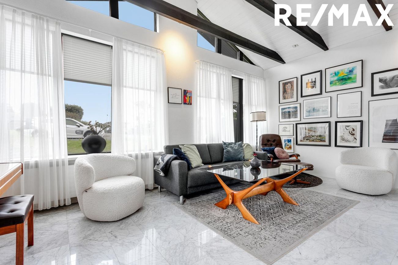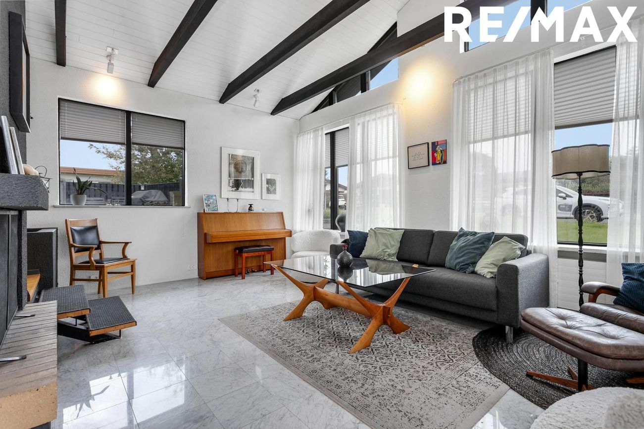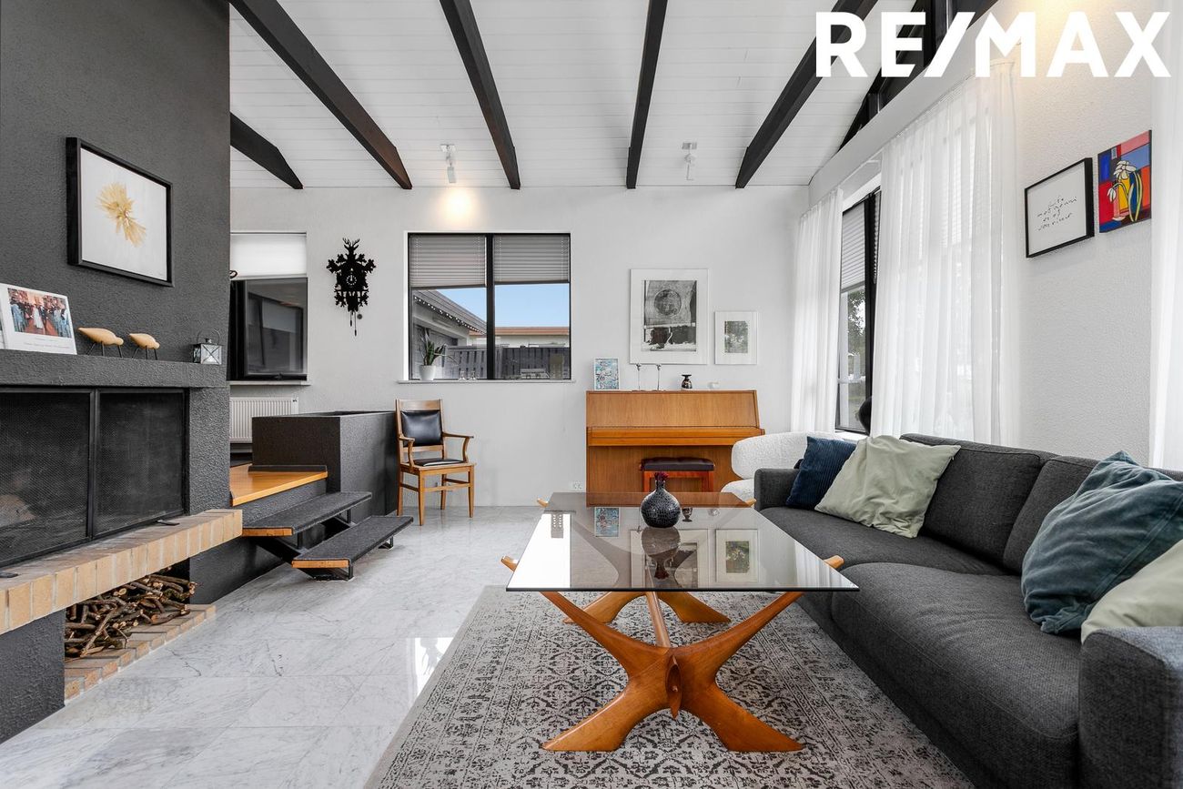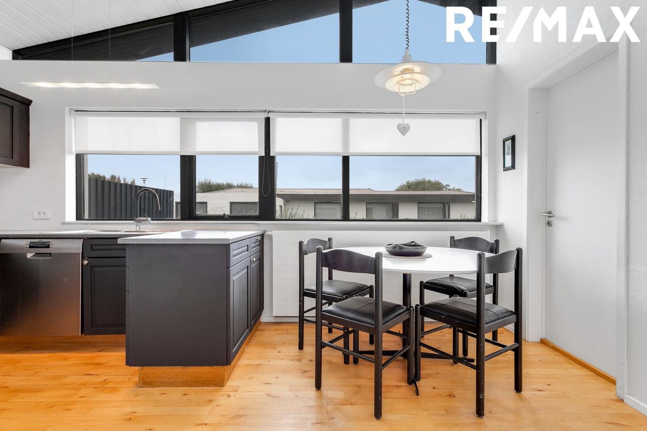 Flísar á gólfi, opin og björt, góð lofthæð, fallegir bitar í lofti, fallegur arinn, útgengt út á timburverönd með skjólveggjum.