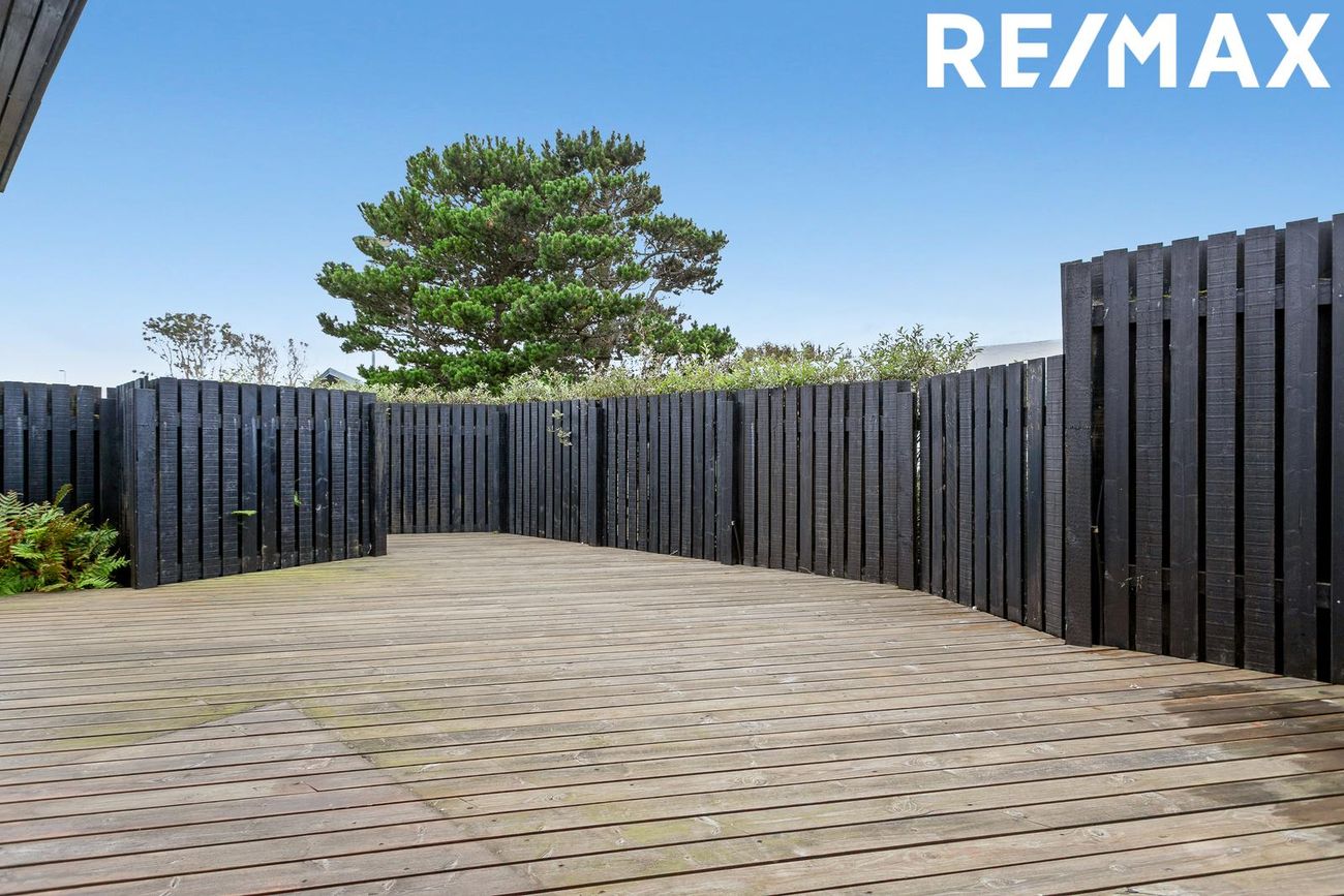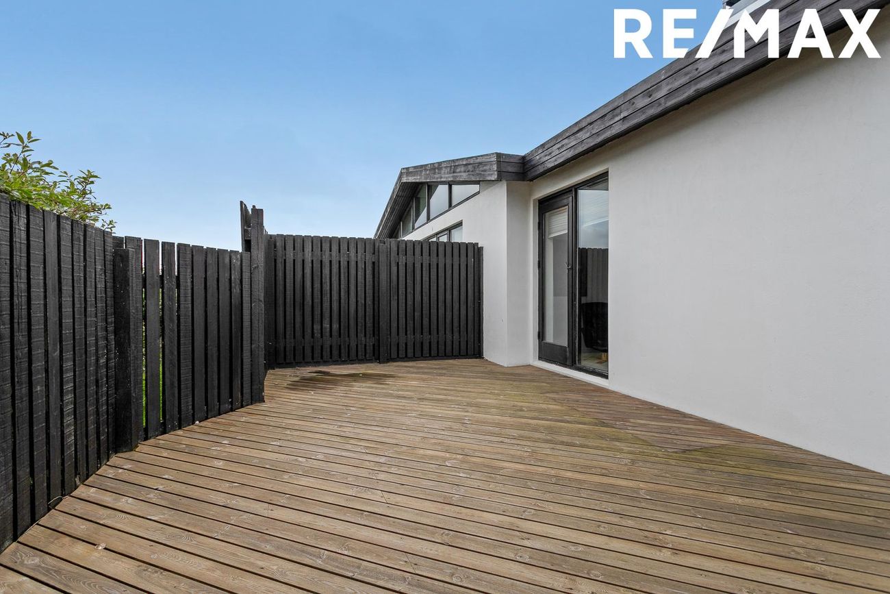 Timburverönd á vesturhlið hússins útgengt frá stofu með skjólveggjum.