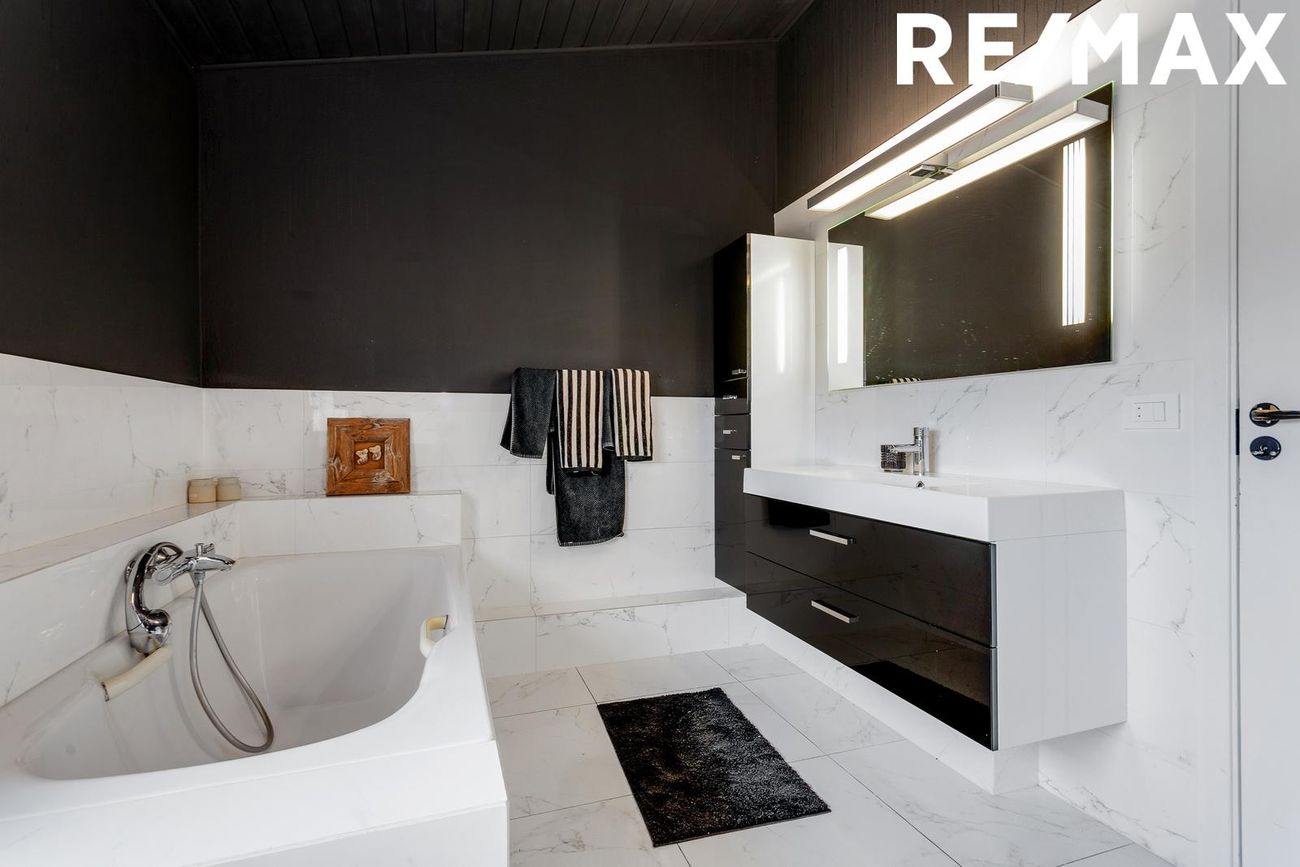 Flísar á gólfi og veggjum að hluta, góð innrétting undir og við handlaug ásamt spegli með innfeldri lýsingu, baðkar, upphengt salerni, sturtuklefi.