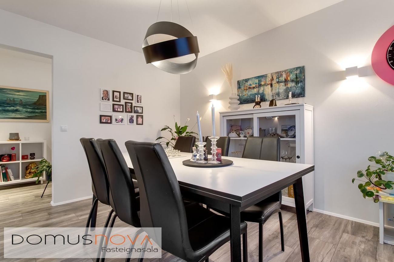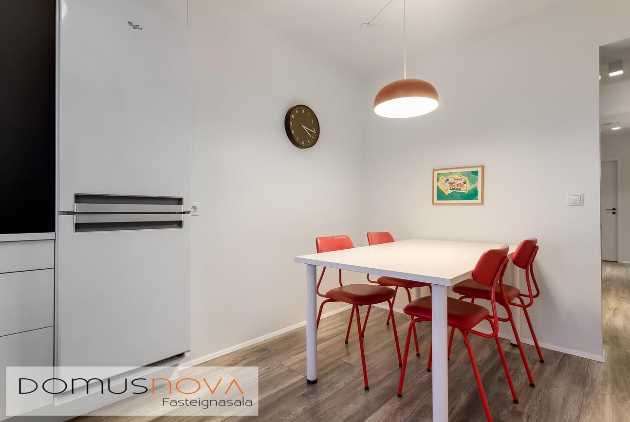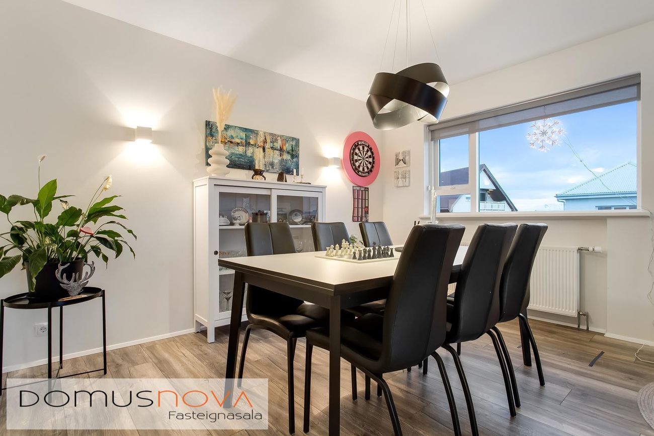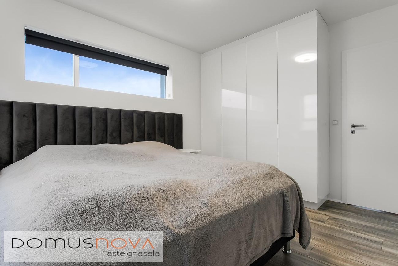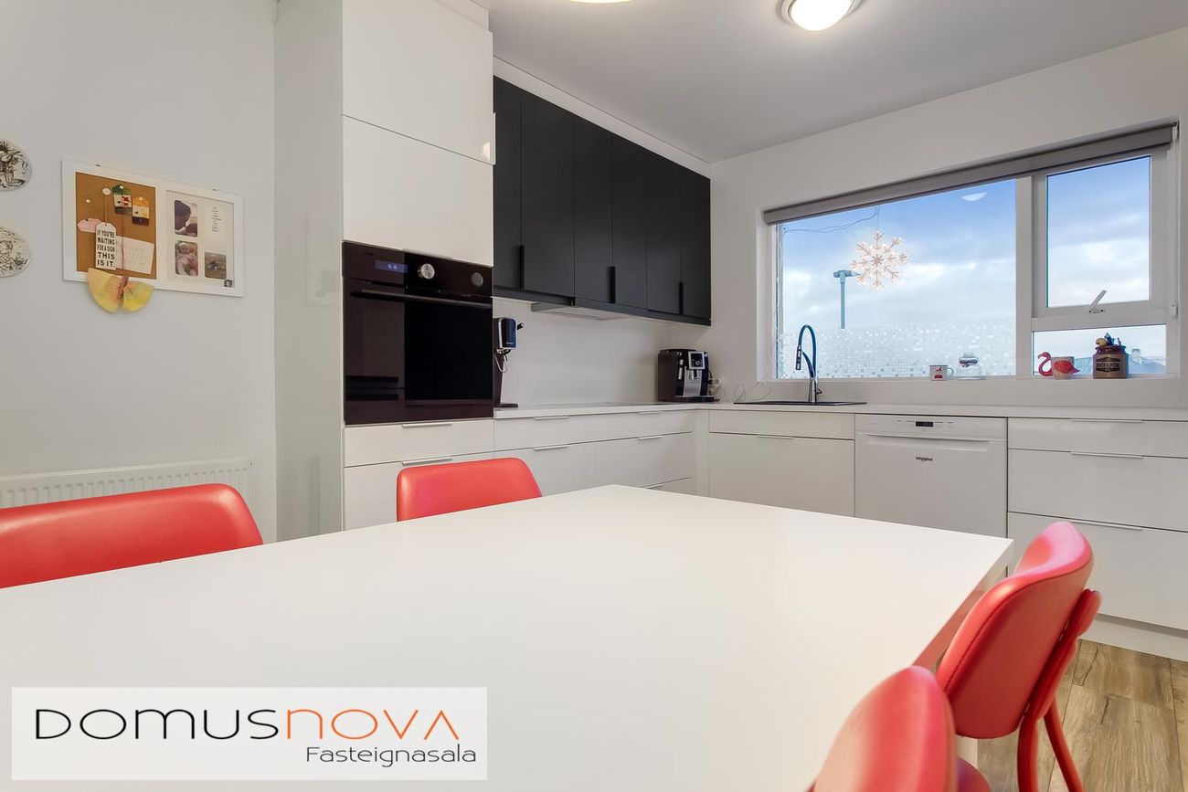 Parket á gólfi, mikrosement í baðherbergi og þvottaherbergi, keramik helluborð í eldhúsi, timburinnréttingar.