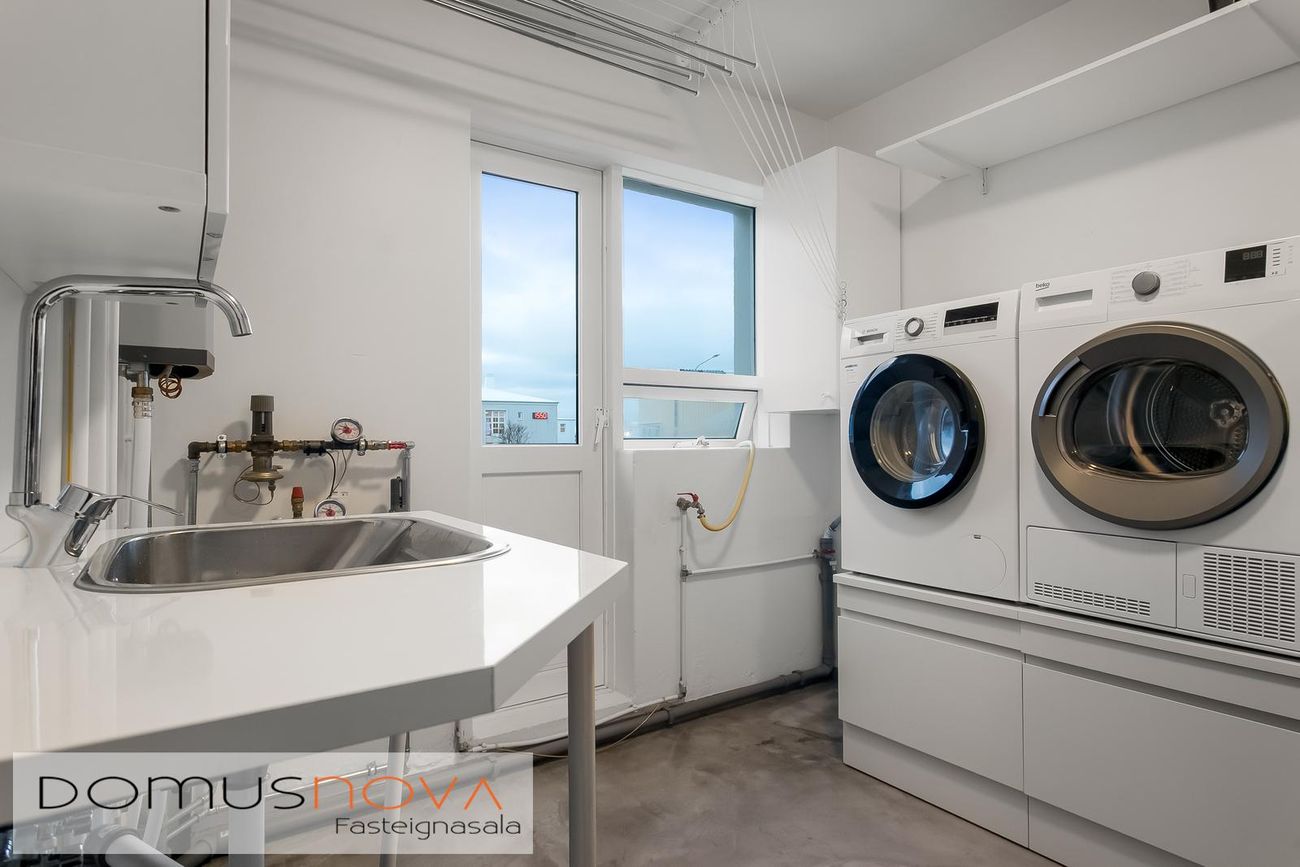 Þvottaherbergi með míkrosementi á gólfi, varmaskiptum, vaski og geymslulofti. Aðgengilegt frá sölum.