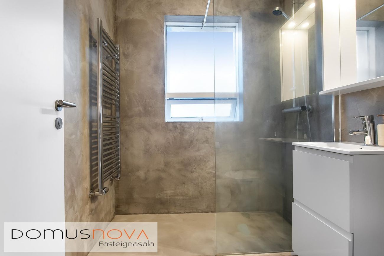 Baðherbergi með lakkaðu mikrosementi á gólfi og veggjum, skápum, handklæðaofn og sturtu afstúkuð með glervegg.