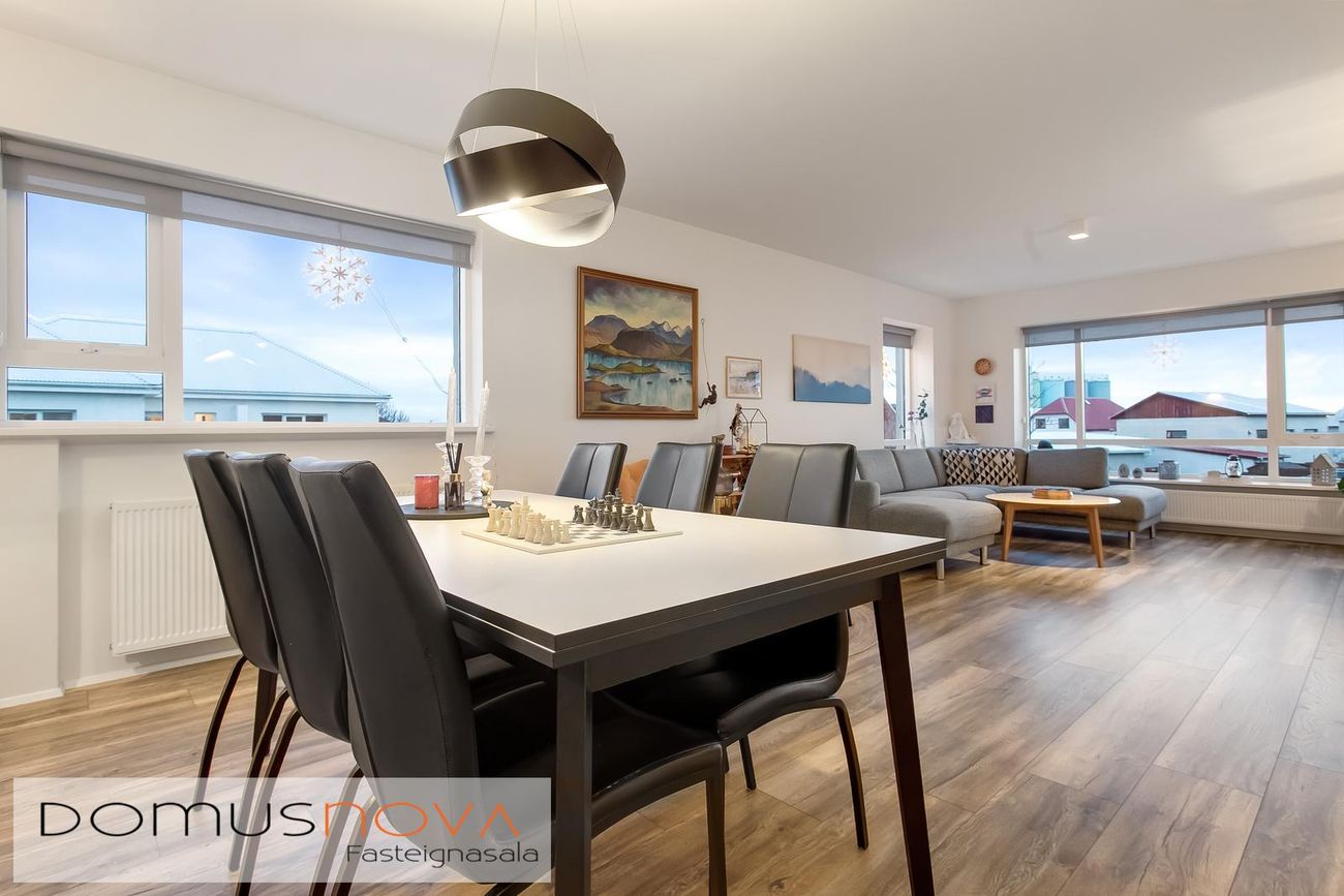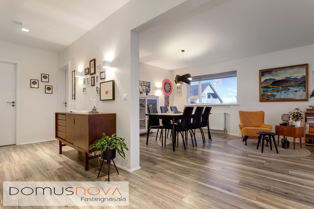 Efri sérhæð í tvíbýli, 126,6 fm. Samfellt parket á gólfi í eldhúsi, stofu, gangi og herbergjum. Hvítar innihurðir frá Birgisson. Allar innréttingar smíðaðar af Trésmiðju Akraness, nema þvottah. og baði.