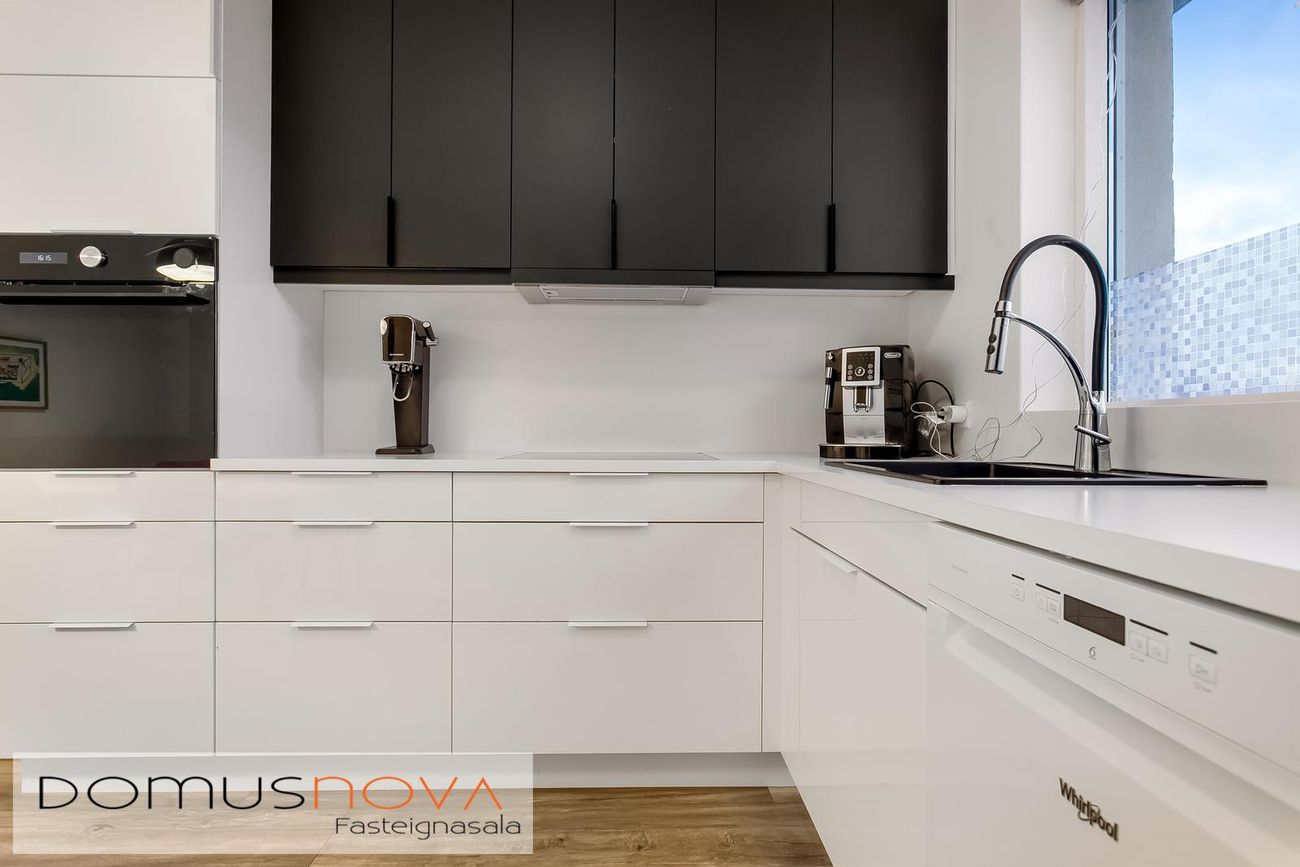 Eldhús með hvít/svörtri innréttingu, keramik helluborð, veggofn og parket á gólfi.