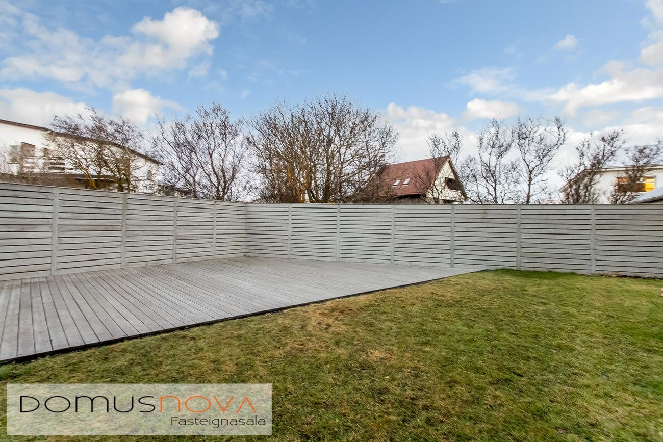 Timburverönd í bakgarði sameiginleg með nágrönnum.
