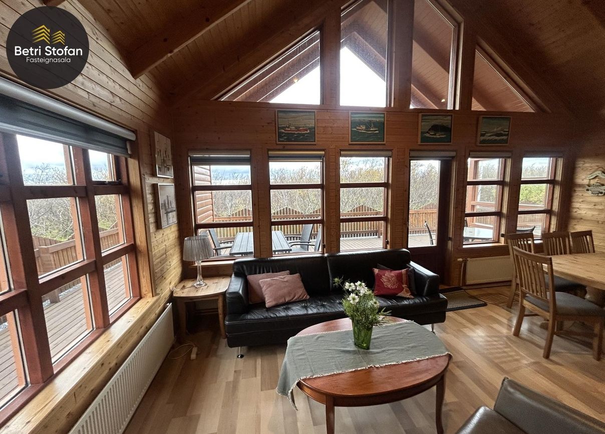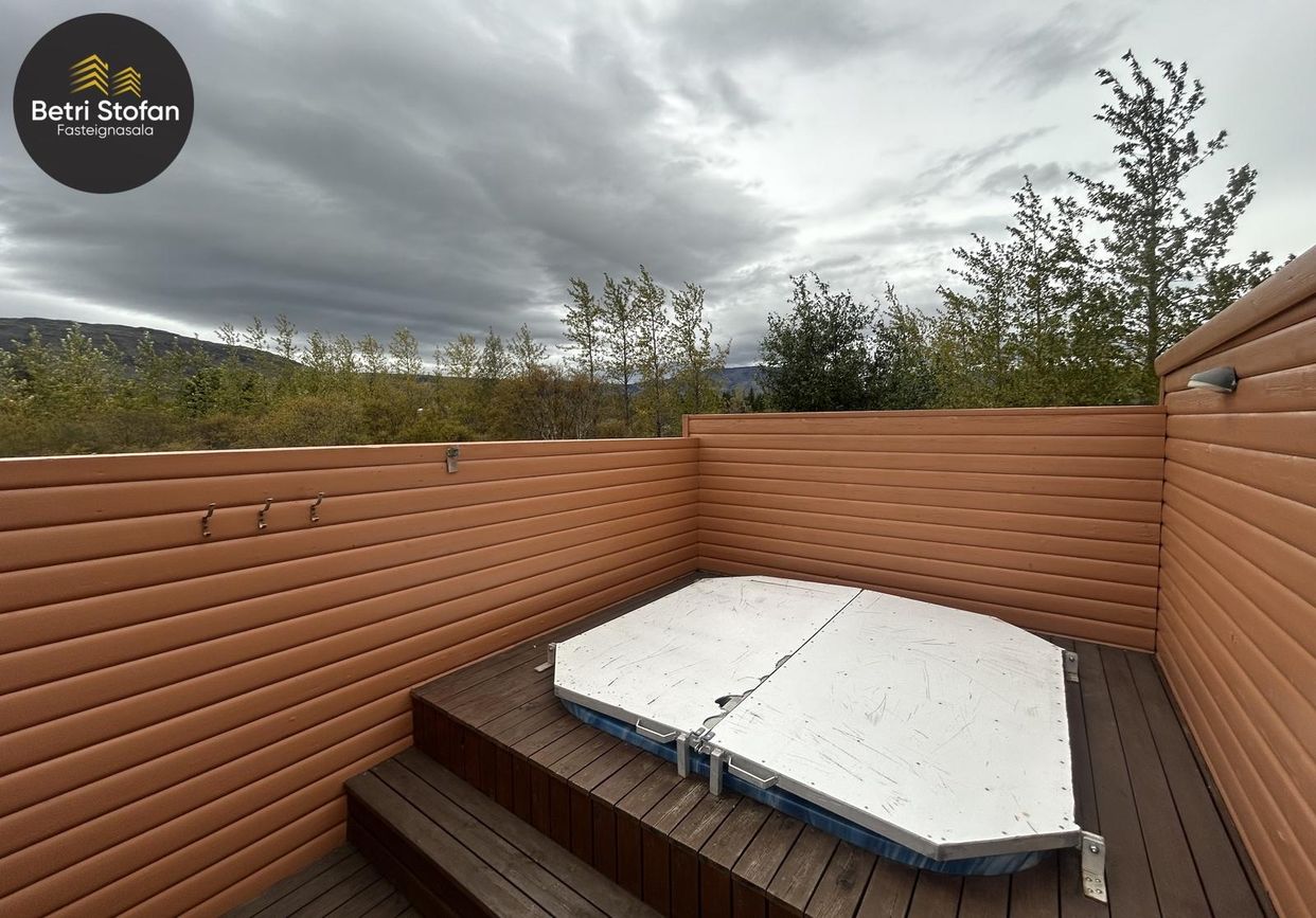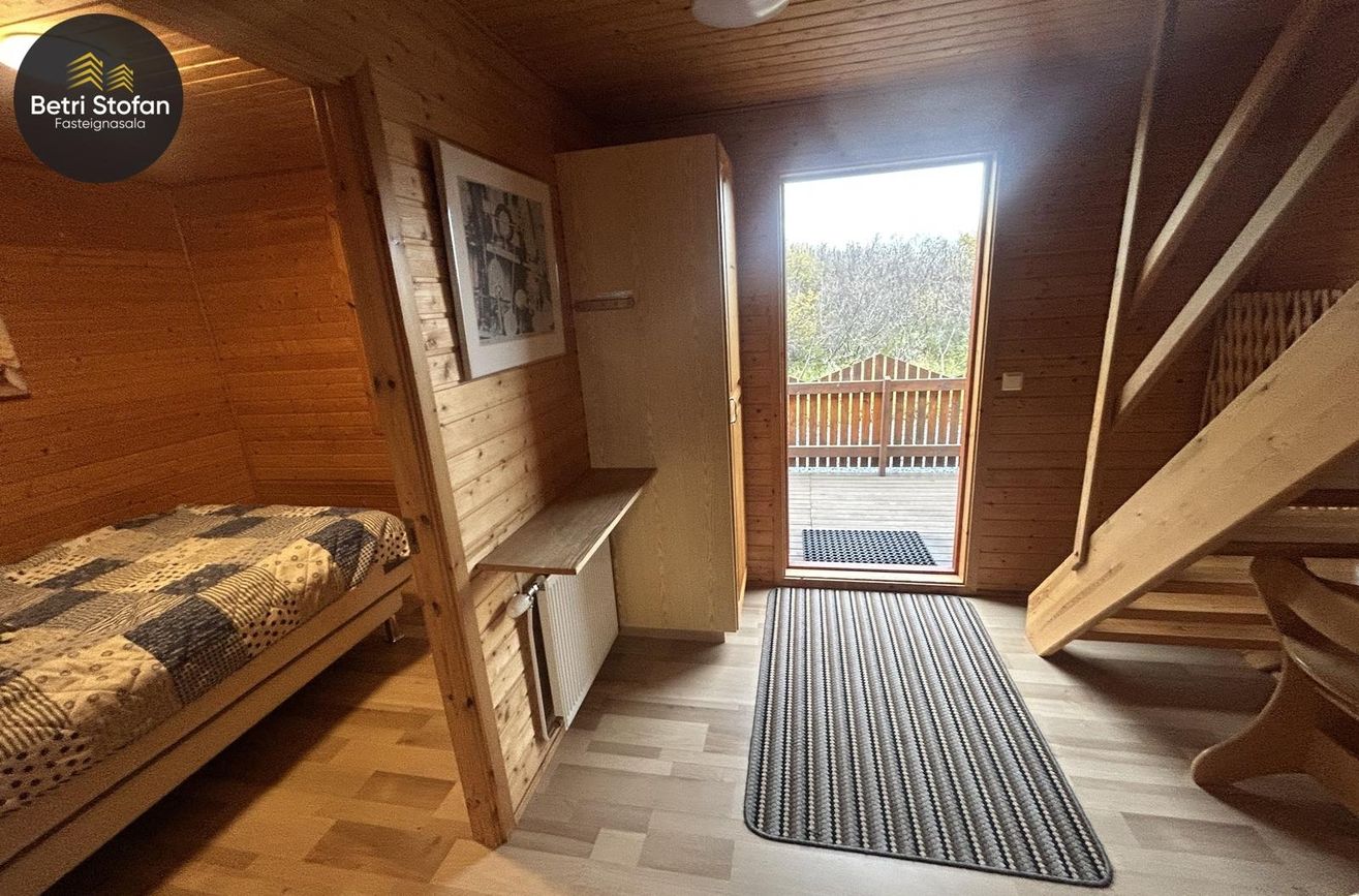 Eignin skiptist í tvö svefnherbergj, auk þriðja svefnrýmis sem er á risloftsi, eldhús og stofu í opnu rými með góða lofthæð, baðherbergi, geymslu og stóran pall með heitum potti.