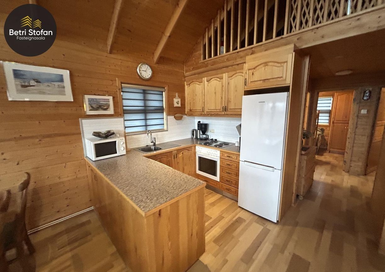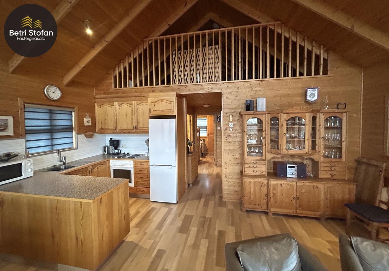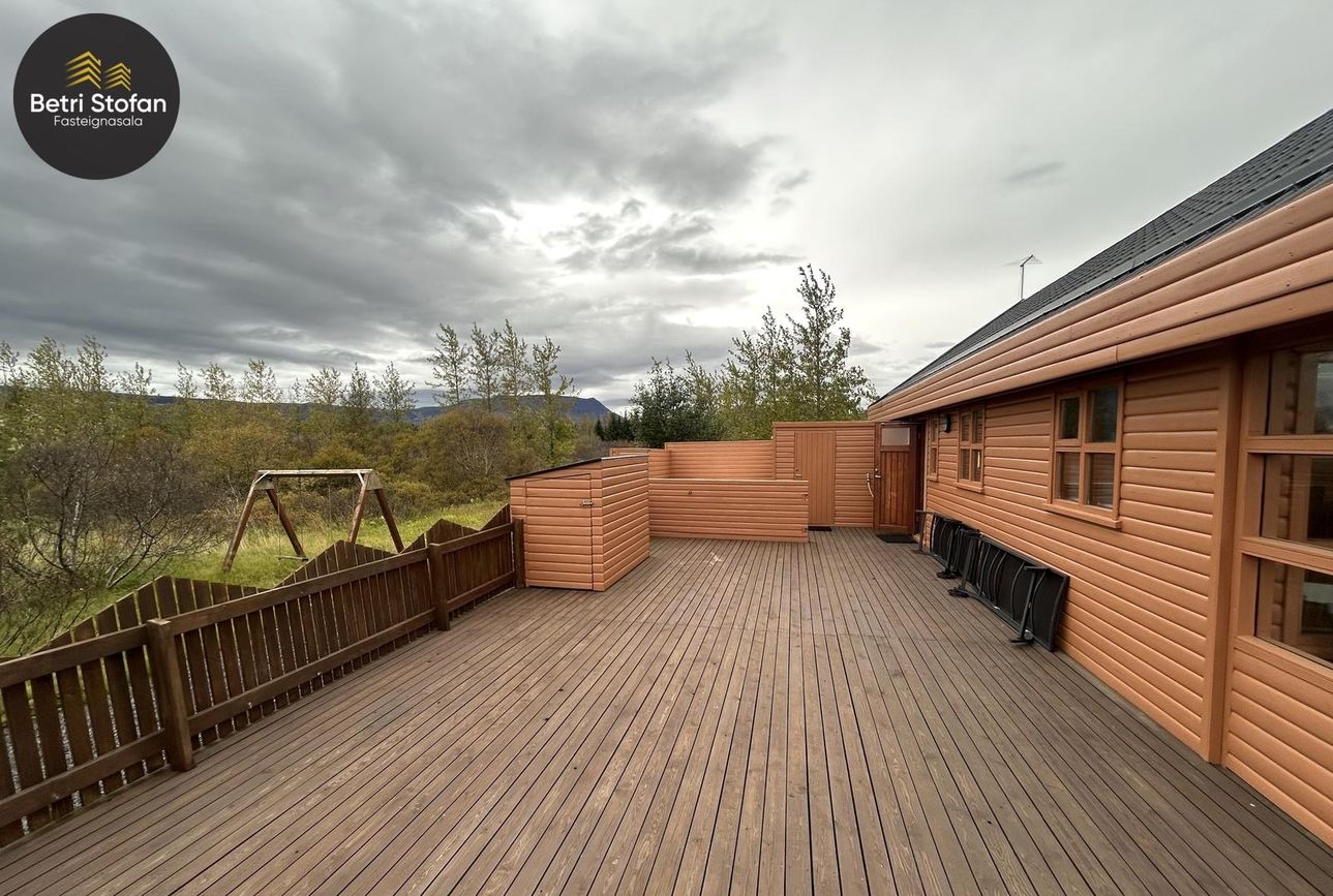 Eignin skiptist í tvö svefnherbergj, auk þriðja svefnrýmis sem er á risloftsi, eldhús og stofu í opnu rými með góða lofthæð, baðherbergi, geymslu og stóran pall með heitum potti.