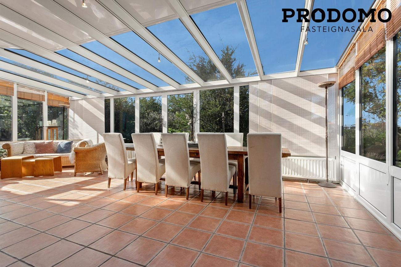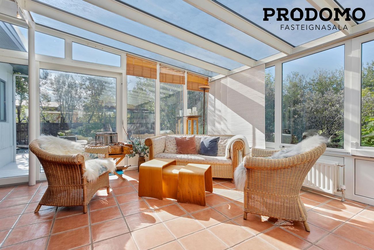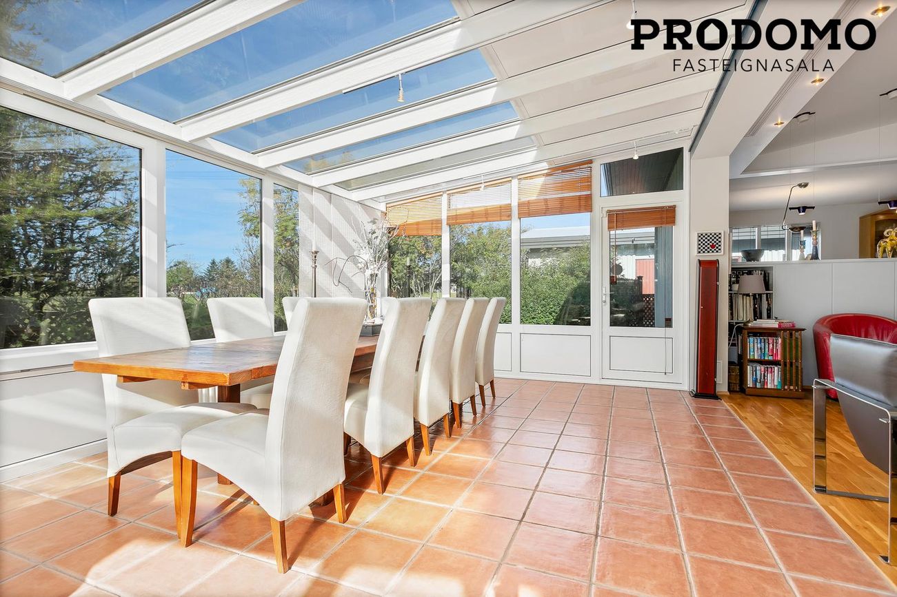 Stofa og borðstofa hafa parket á gólfi, út frá stofu kemur 42 fm sólstofa þar sem flísar eru á gólfi og gólfhiti, rennihurð er frá sólstofu út á verönd. Sólstofa var byggð við húsið 1999.