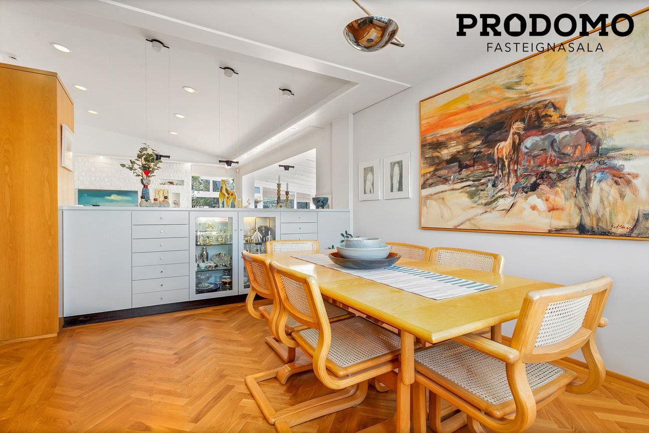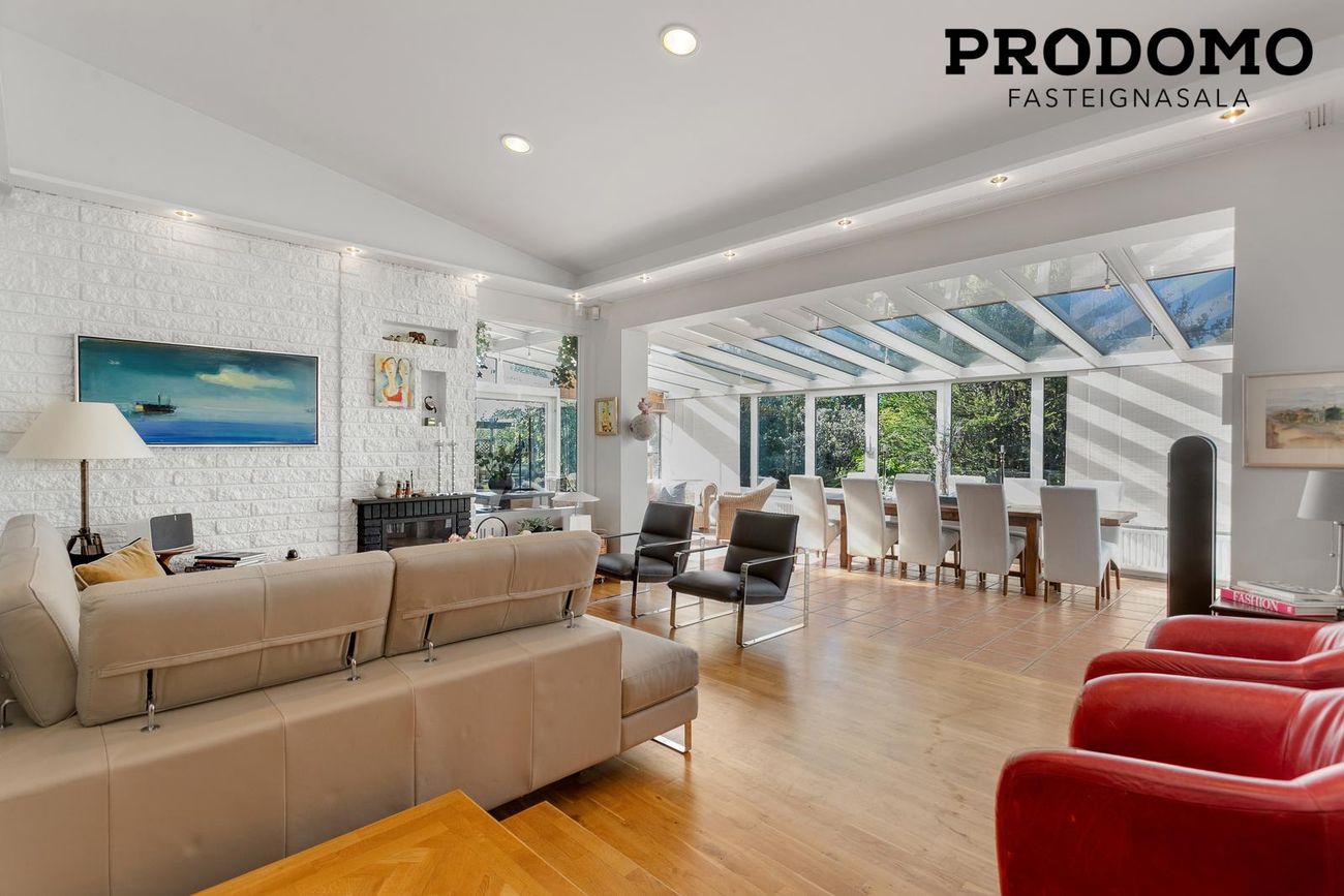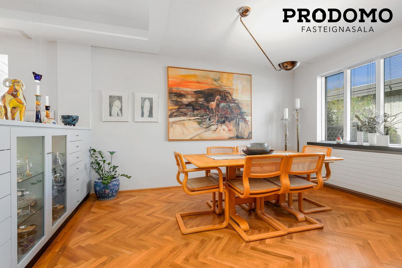 Stofa og borðstofa hafa parket á gólfi, út frá stofu kemur 42 fm sólstofa þar sem flísar eru á gólfi og gólfhiti, rennihurð er frá sólstofu út á verönd. Sólstofa var byggð við húsið 1999.