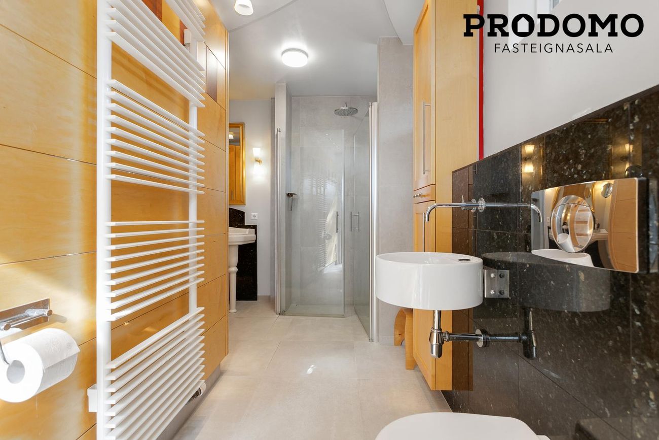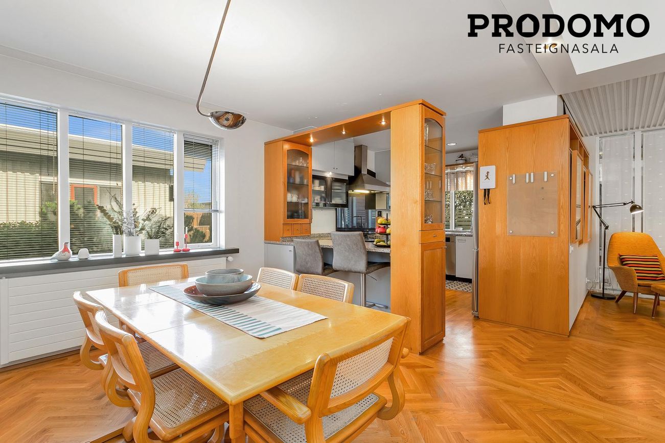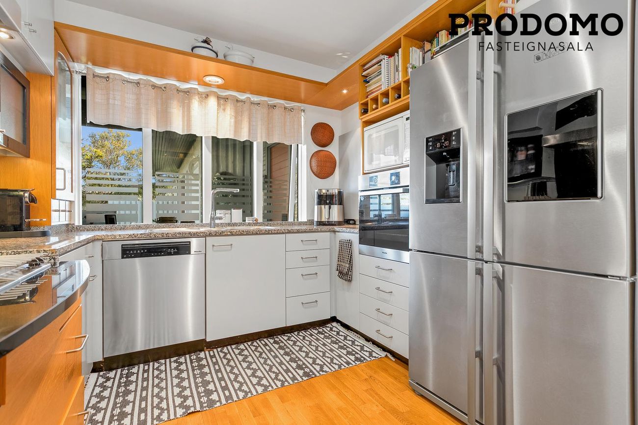 Eldhús hefur parket á gólfi, snyrtilega innréttingu með borðplötu úr steini og nýlegum eldhústækjum frá Miele, stór tvöfaldur ísskápur frá Bloomberg fylgir með.