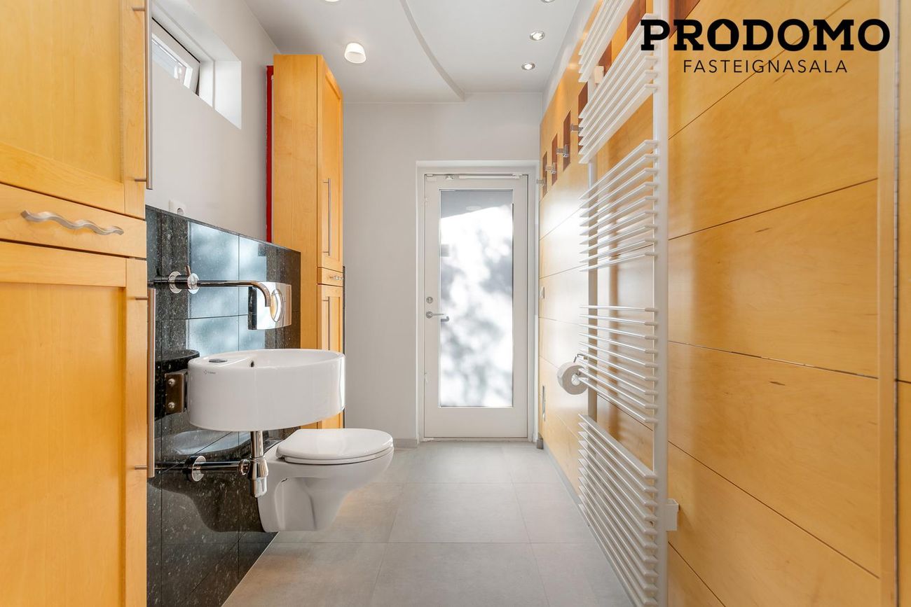 Þvottahús rúmgott og snyrtilegt með flísum og innréttingu með miklu skápa plássi þar sem gert er ráð fyrir tækjum í vinnu hæð. Frá þvottahúsi er útgengt á glæsilega verönd með skjólveggjum og heitum pott.