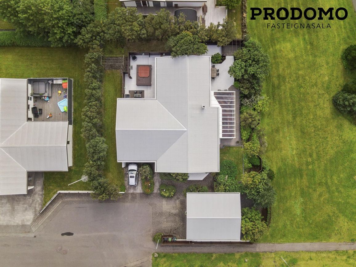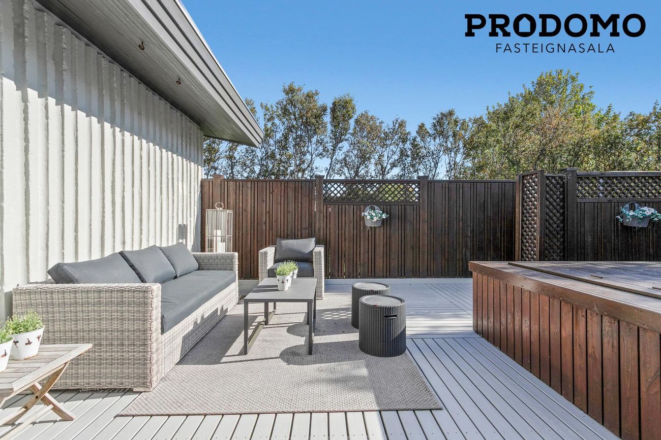 Lóð er mjög snyrtileg með miklum gróðri, verönd er beggja meginn við húsið þannig að sól næst frá morgni til kvölds, stéttar eru ýmist hellulagðar eða steyptar og er hitalögn í bílaplani en er ótengt í dag.