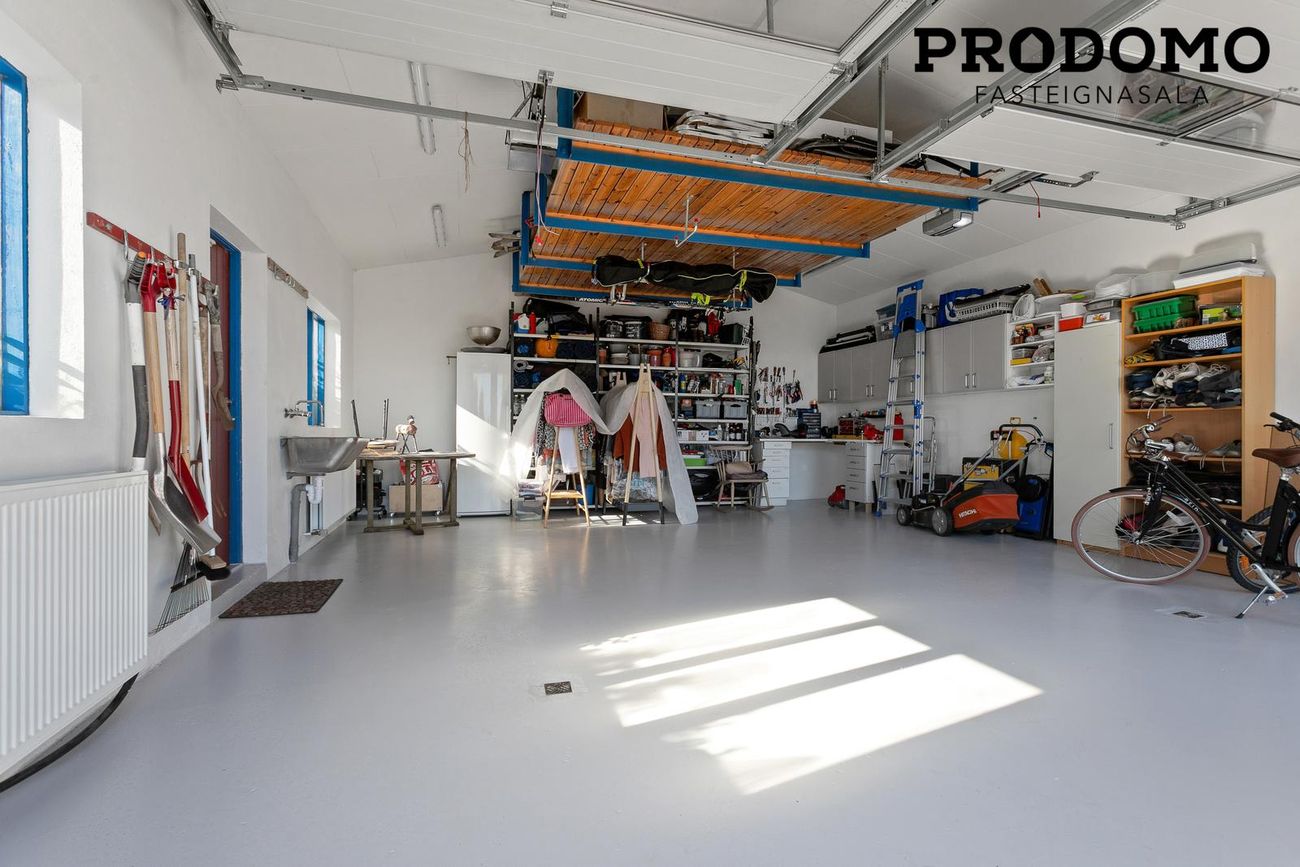 Bílskúr er tvöfaldur með tveimur aksturshurðum og báðar hafa rafmagnsopnun, gólf er málað og einnig er geymsluloft.