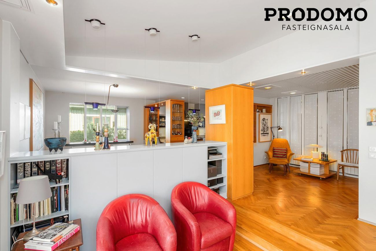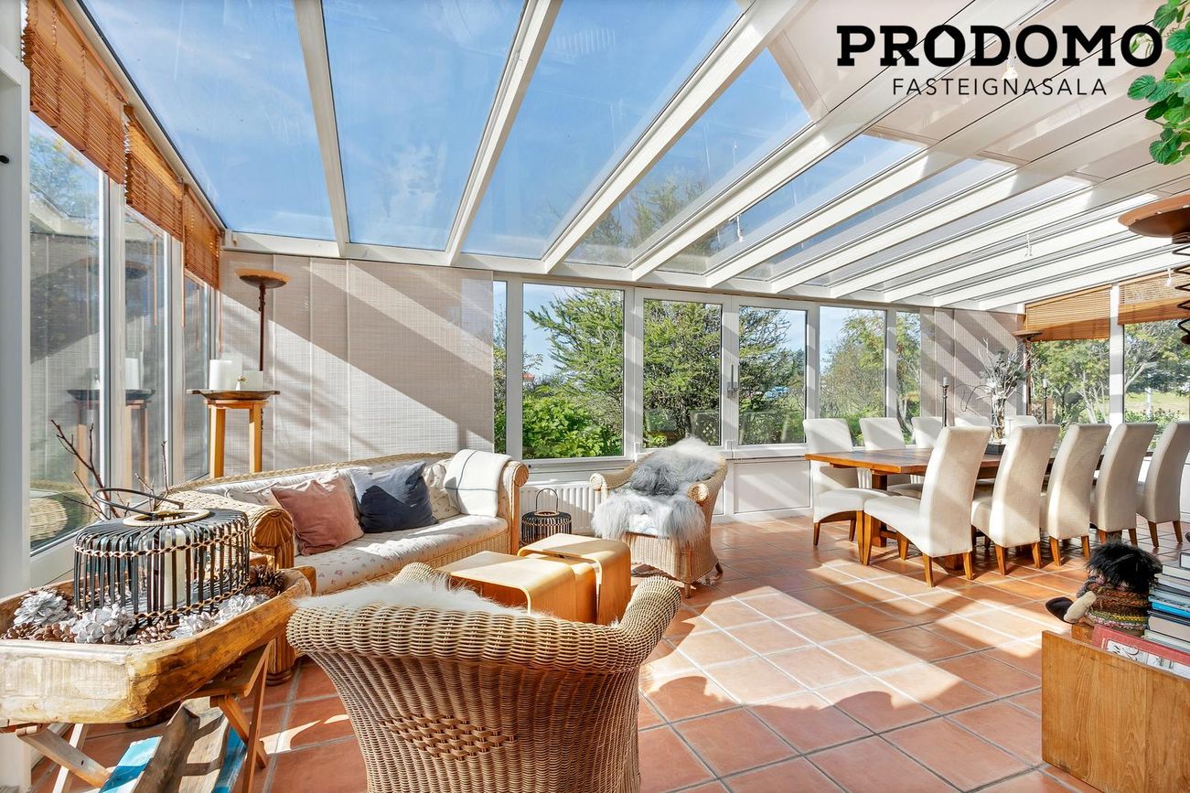 Stofa og borðstofa hafa parket á gólfi, út frá stofu kemur 42 fm sólstofa þar sem flísar eru á gólfi og gólfhiti, rennihurð er frá sólstofu út á verönd. Sólstofa var byggð við húsið 1999.