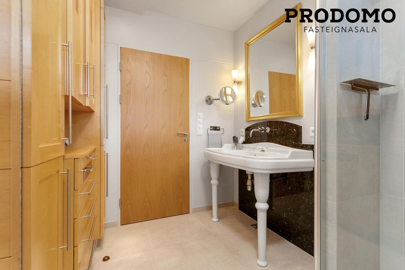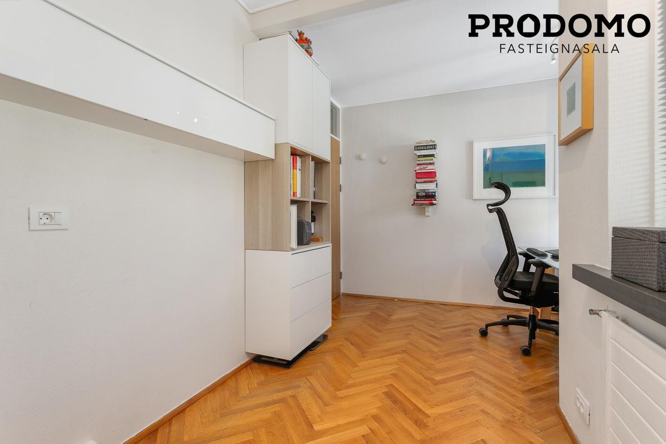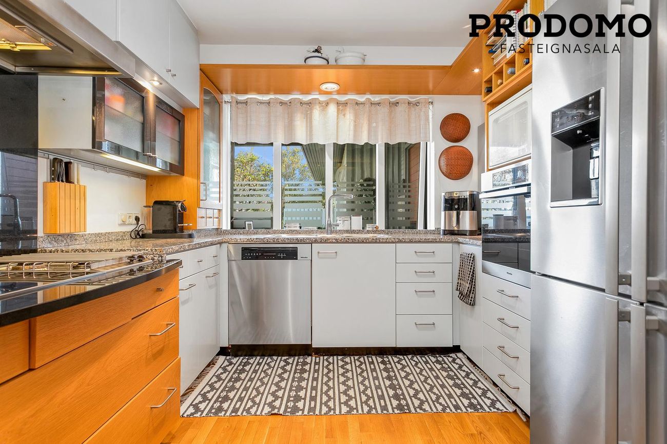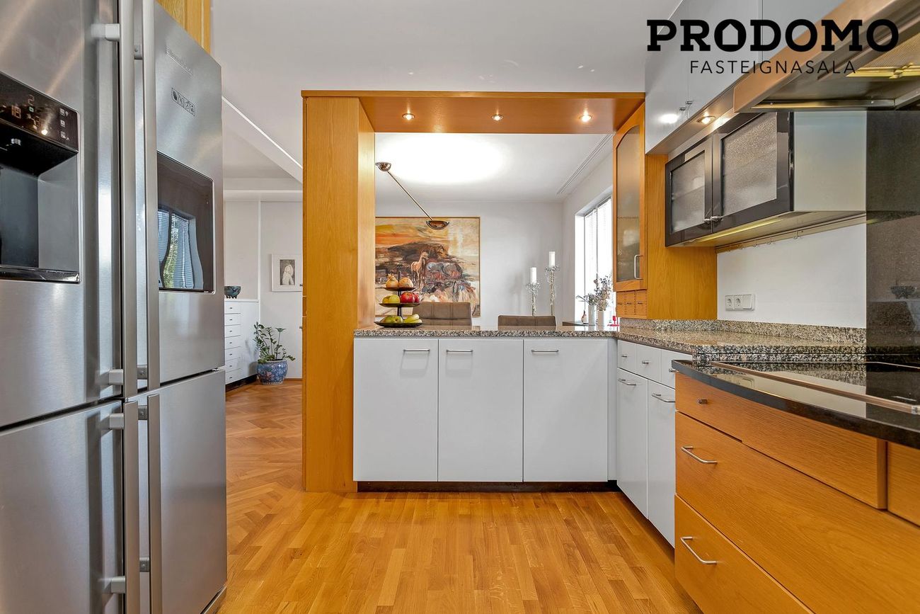 Eldhús hefur parket á gólfi, snyrtilega innréttingu með borðplötu úr steini og nýlegum eldhústækjum frá Miele, stór tvöfaldur ísskápur frá Bloomberg fylgir með.