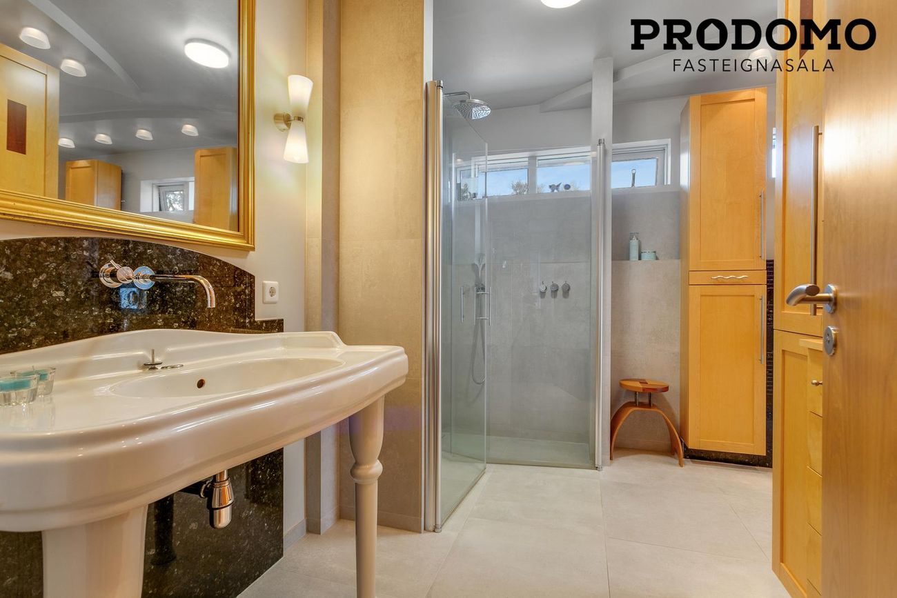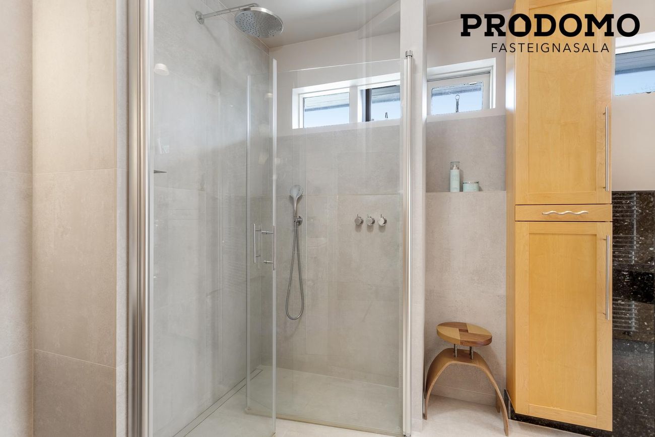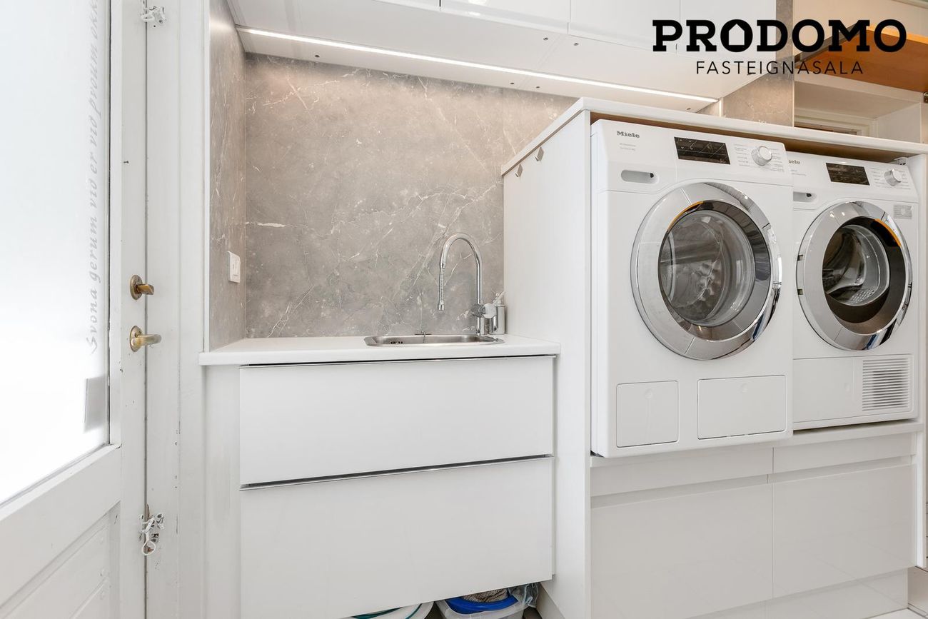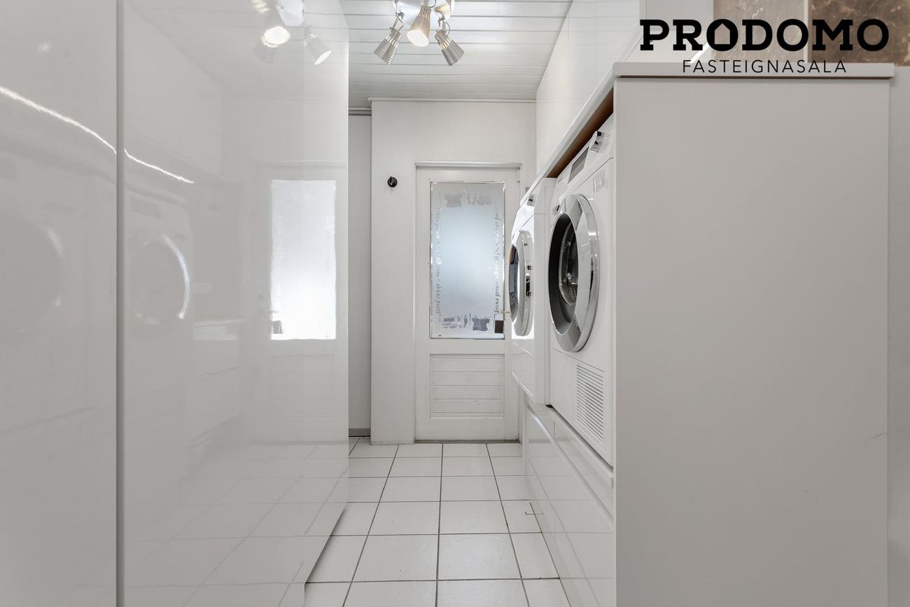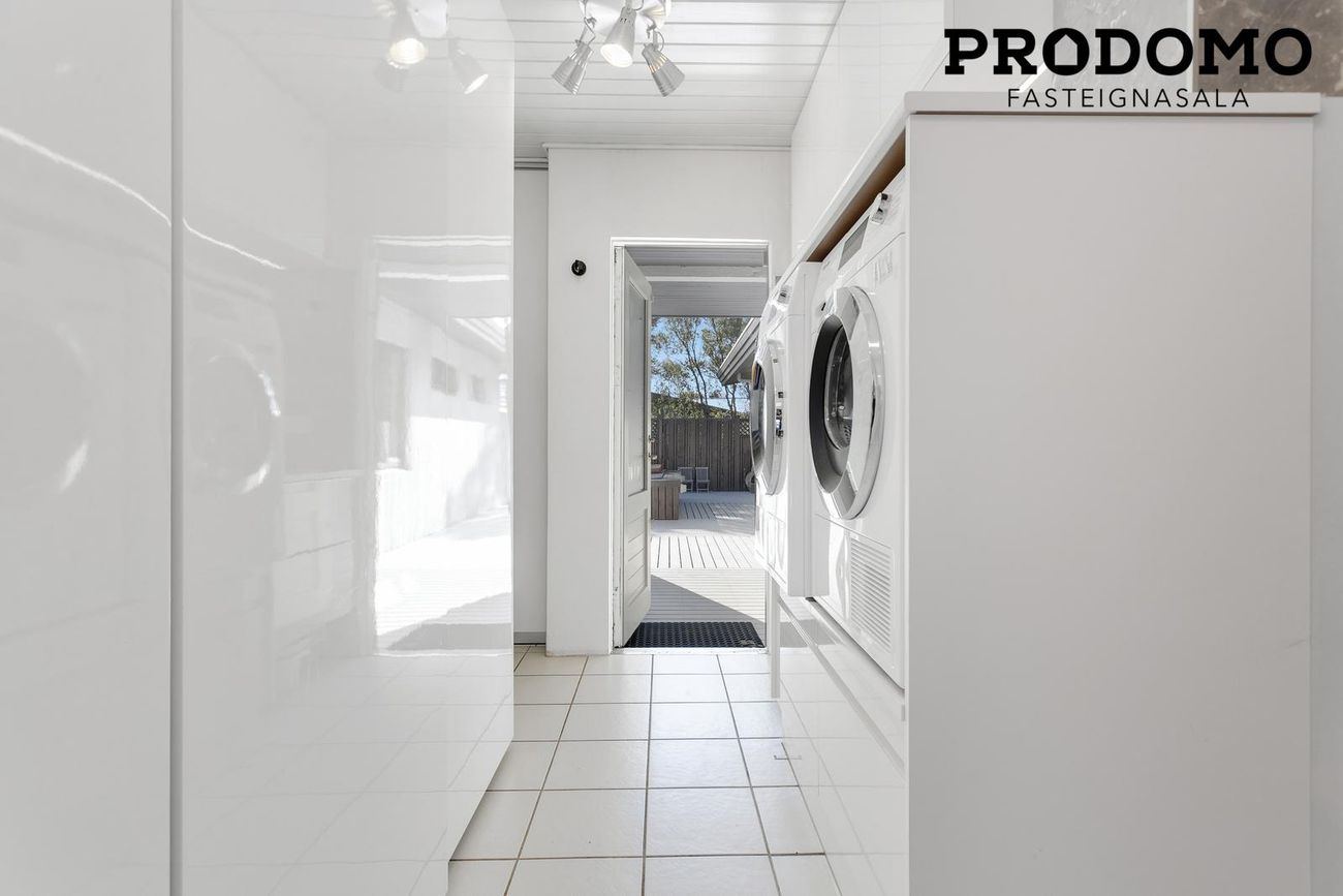 Þvottahús rúmgott og snyrtilegt með flísum og innréttingu með miklu skápa plássi þar sem gert er ráð fyrir tækjum í vinnu hæð. Frá þvottahúsi er útgengt á glæsilega verönd með skjólveggjum og heitum pott.