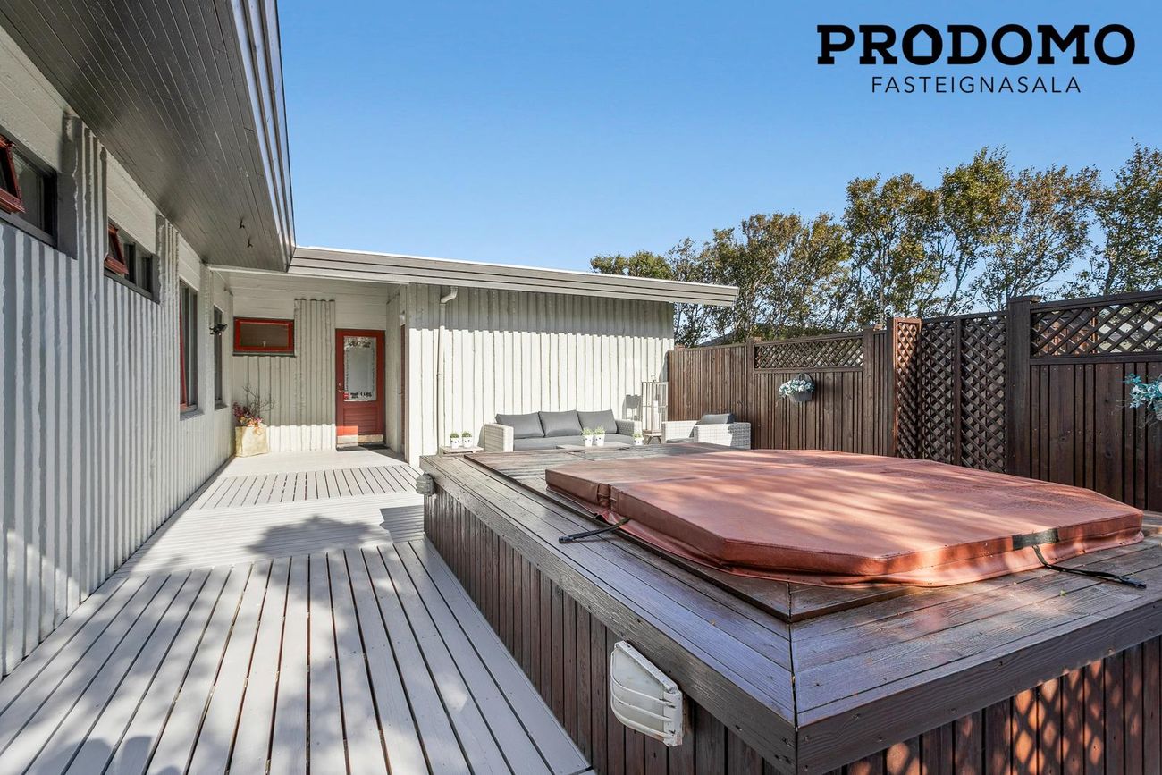 Lóð er mjög snyrtileg með miklum gróðri, verönd er beggja meginn við húsið þannig að sól næst frá morgni til kvölds, stéttar eru ýmist hellulagðar eða steyptar og er hitalögn í bílaplani en er ótengt í dag.