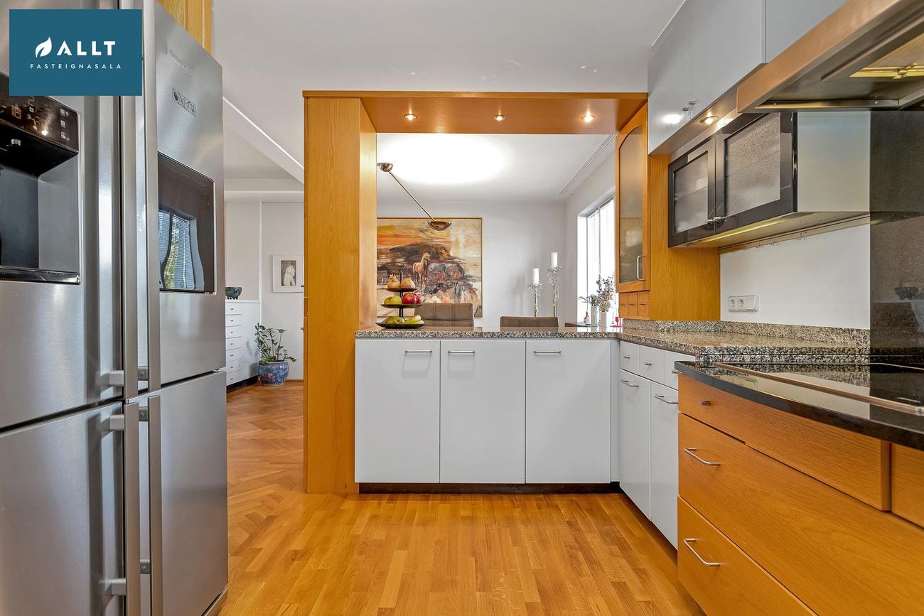 Stofan er mjög stór og í henni er arinn sem virkar vel. Eldhúsið er með borðplötu úr steini og hefur eldhústækjum, sem öll eru frá Miele, verið skipt út nýlega. Uppþvottavélin og span helluborðið eru um 1 árs og bökunarofninn er um 3 ára. Stór tvöfaldur ísskápur frá Bloomberg fylgir eigninni. Tvær gashellur eru við hlið helluborðsins.
