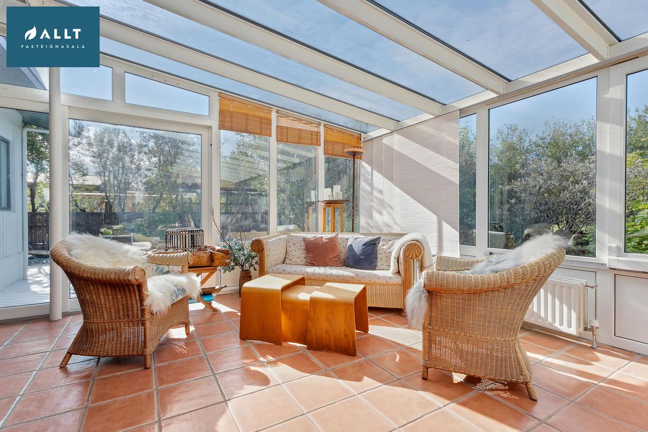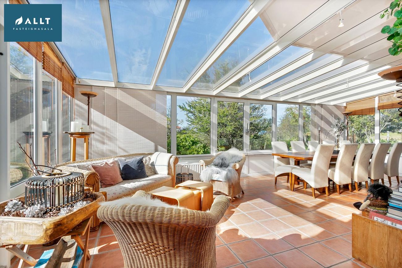 Í aðalrými hússins eru stofan, borðstofa, sólstofa og eldhúsið. Sólstofan er um 42 fm og er með hita í gólfi. Hún var byggð við húsið árið 1999 og er afar glæsileg. Rennihurð er á þeirri hlið sólstofunnar sem snýr út á pall og gönguhurð er á hinum enda hennar.