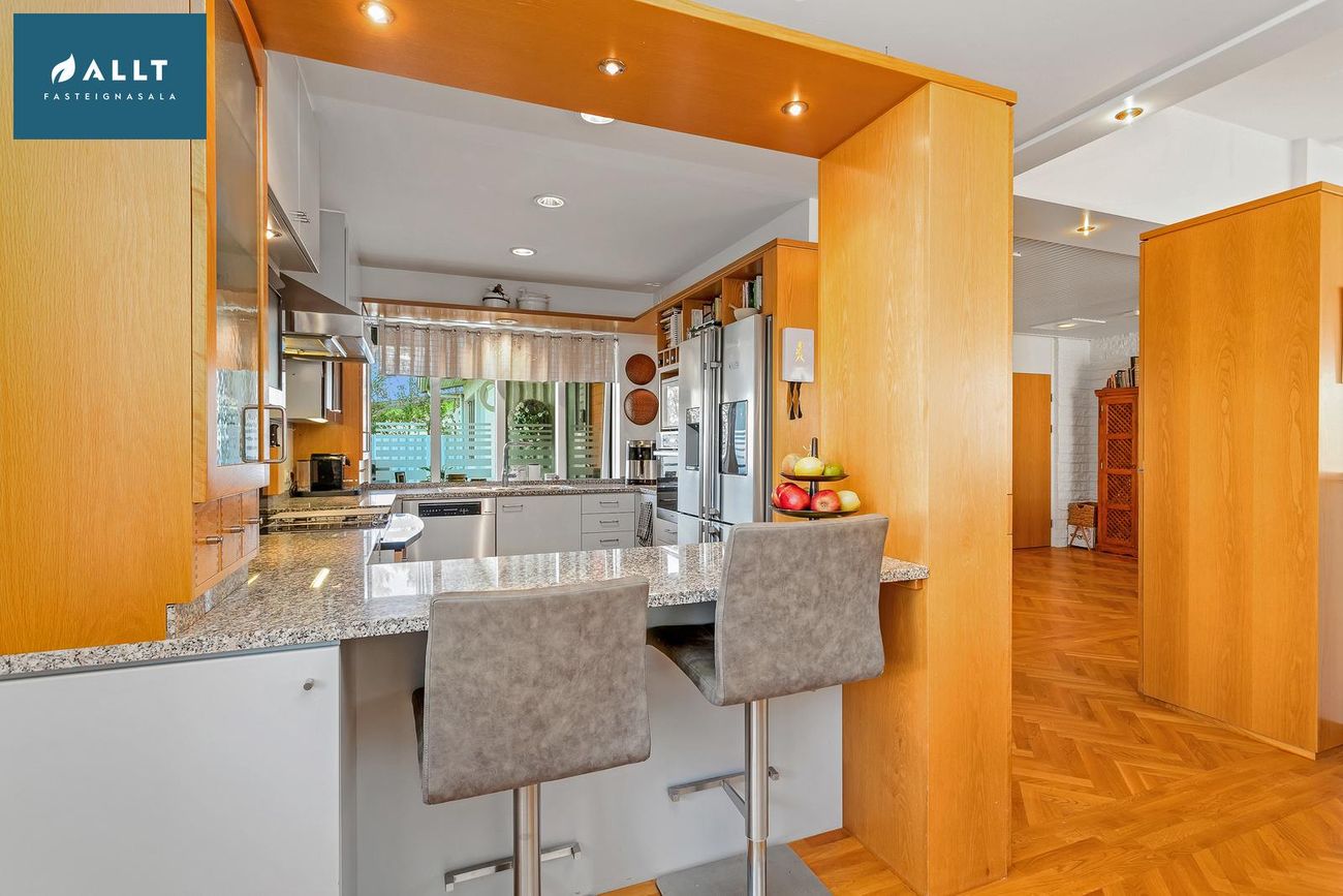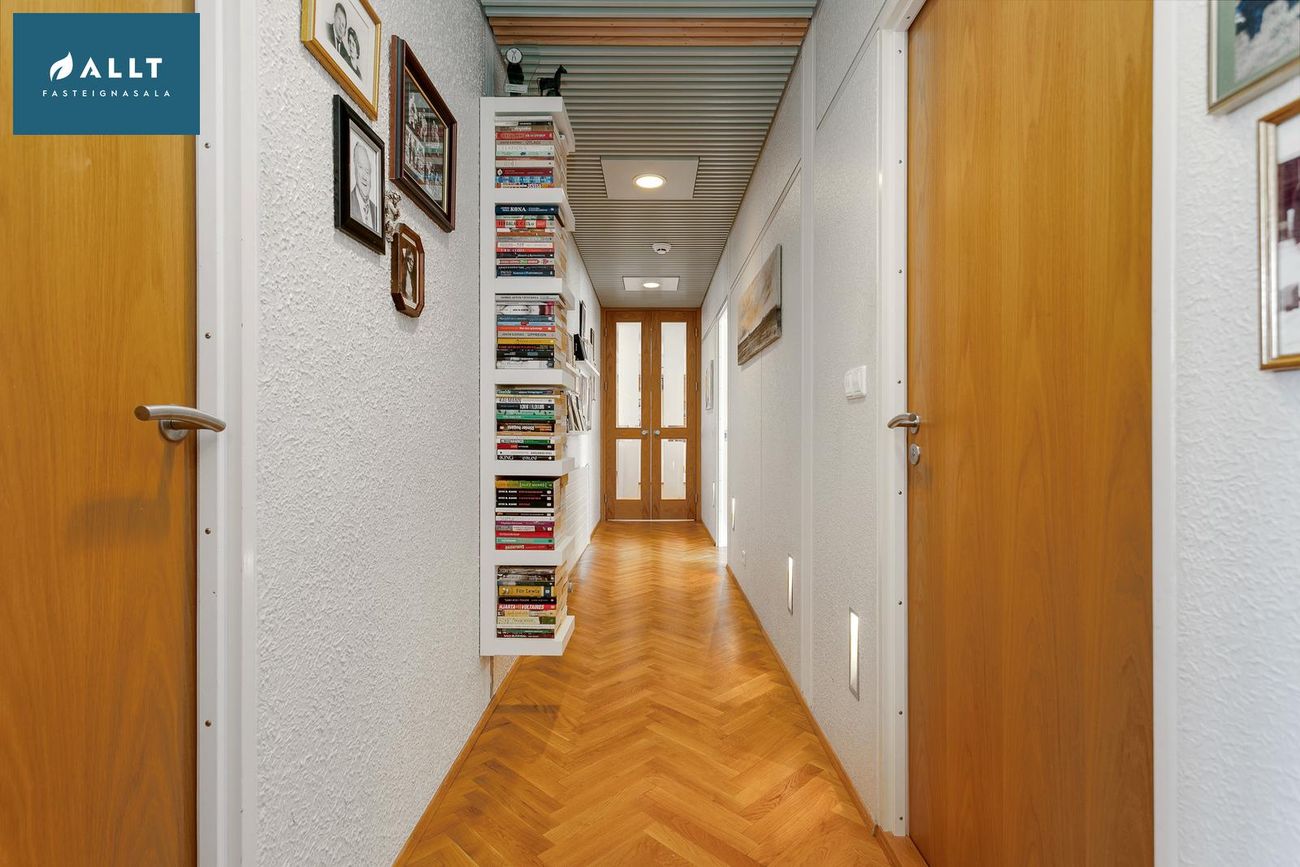 Eignin telur alls 304 fm. Húsið sjálft er 194,8 fm, bílskúrinn sem er sambyggður húsinu er 53,5 og stakstæði bílskúrinn er 56 fm.Nánari lýsing:Komið er inn í mjög rúmgóða forstofu með góðu skápaplássi. Gestasnyrting er þar á vinstri hönd en hún var endurnýjuð fyrr á þessu ári. Innangengt er í bílskúrinn úr forstofu en hann er í dag notaður sem vinnustofa. Innst í honum er stúkað af tæplega 8 fm herbergi með léttum vegg. Nú notað sem fataherbergi en auðvelt væri að breyta þessu rými í 3 rúmgóð herbergi. Alls er bílskúrinn um 53,5 fm.