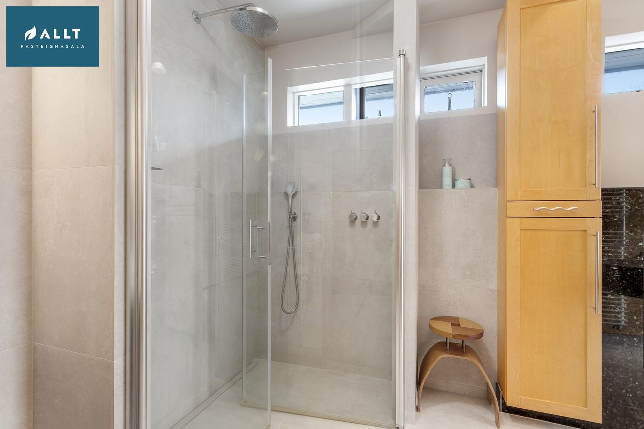 Mjög rúmgott baðherbergi er í þessum hluta hússins en það er með stórum sturtuklefa og er afar glæsilegt. Baðherbergið var endurnýjað árið 2023. Opið er út á sólpallinn frá baðherberginu.