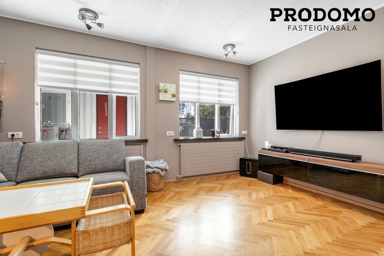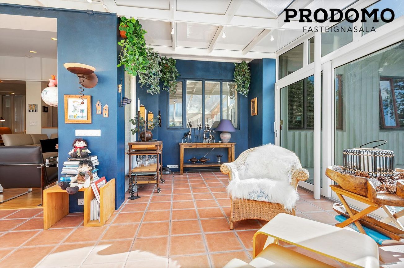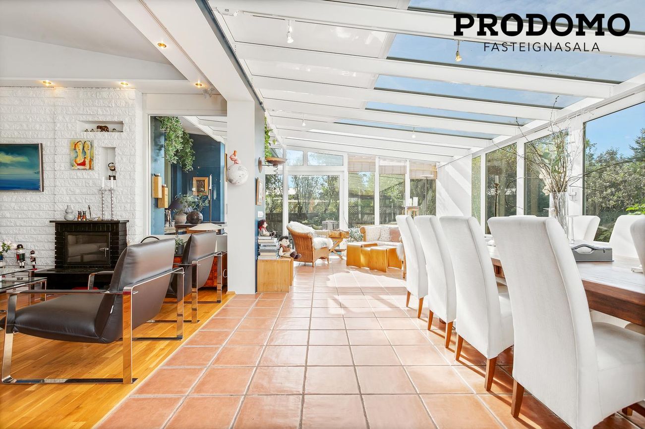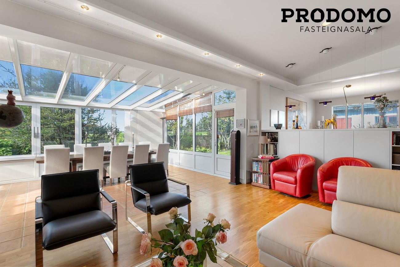 Stofa og borðstofa hafa parket á gólfi, út frá stofu kemur 42 fm sólstofa þar sem flísar eru á gólfi og gólfhiti, rennihurð er frá sólstofu út á verönd. Sólstofa var byggð við húsið 1999.