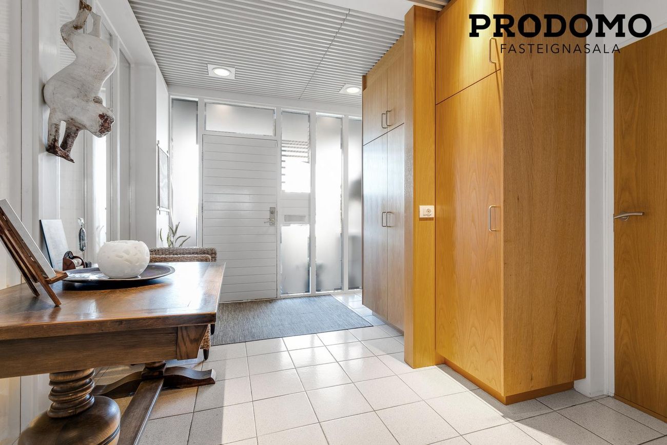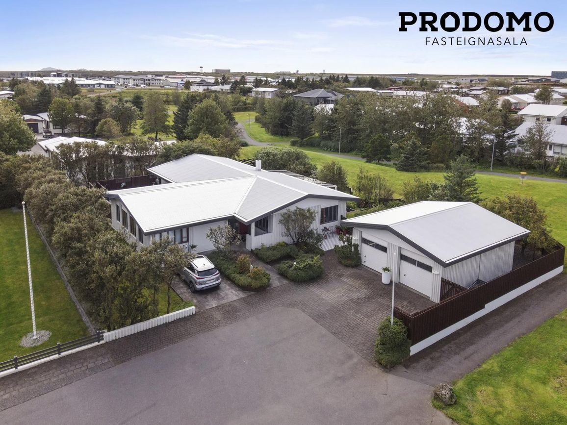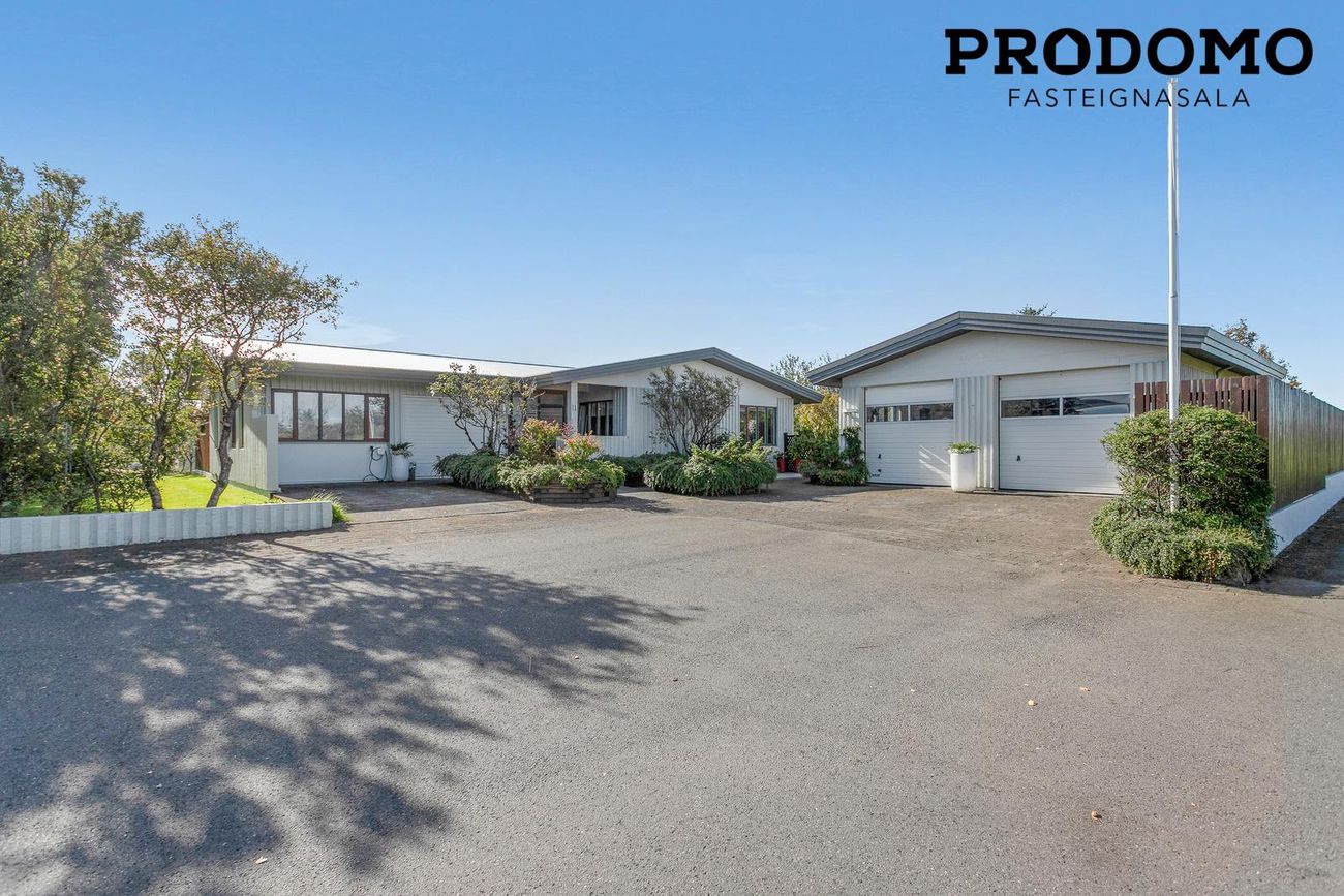 PRODOMO fasteignasala kynnir til sölu virkilega snyrtilegt og vel viðhaldið 304,3 fm einbýlishús til sölu á frábærum stað innst í botnlanga að Miðgarði 11.Um er að ræða flott hús á frábærum stað byggt árið 1974 og tvöfaldur bílskúr byggður 1993. Eignin er 304,3 fm, íbúðarhluti 194,8 fm, bílskúrinn sem er sambyggður húsinu er 53,5 en nýtist með íbúðarhluta og stakstæði bílskúrinn er 56 fm.Nánari lýsing:Forstofa með flísum á gólfi og góðum skápum