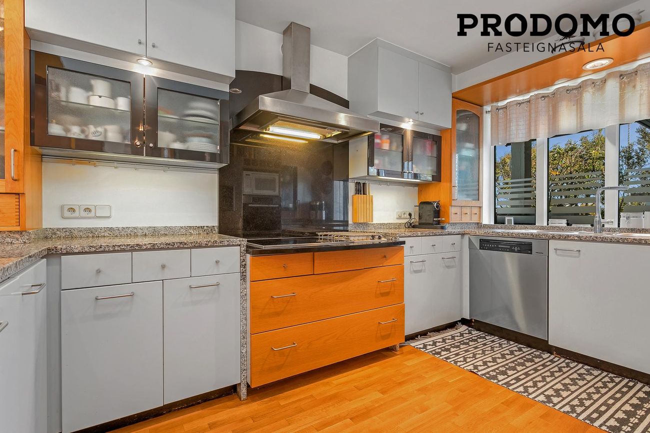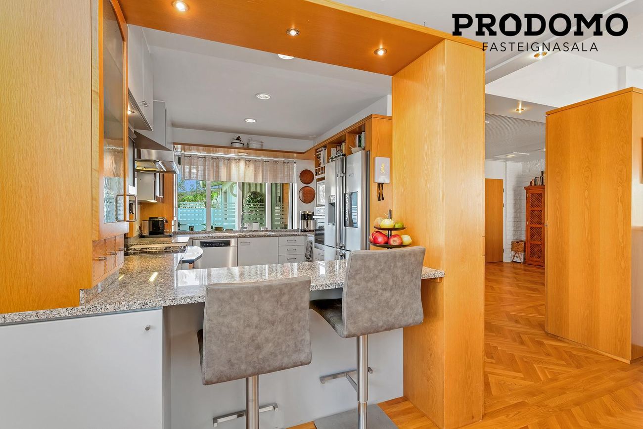 Eldhús hefur parket á gólfi, snyrtilega innréttingu með borðplötu úr steini og nýlegum eldhústækjum frá Miele, stór tvöfaldur ísskápur frá Bloomberg fylgir með.