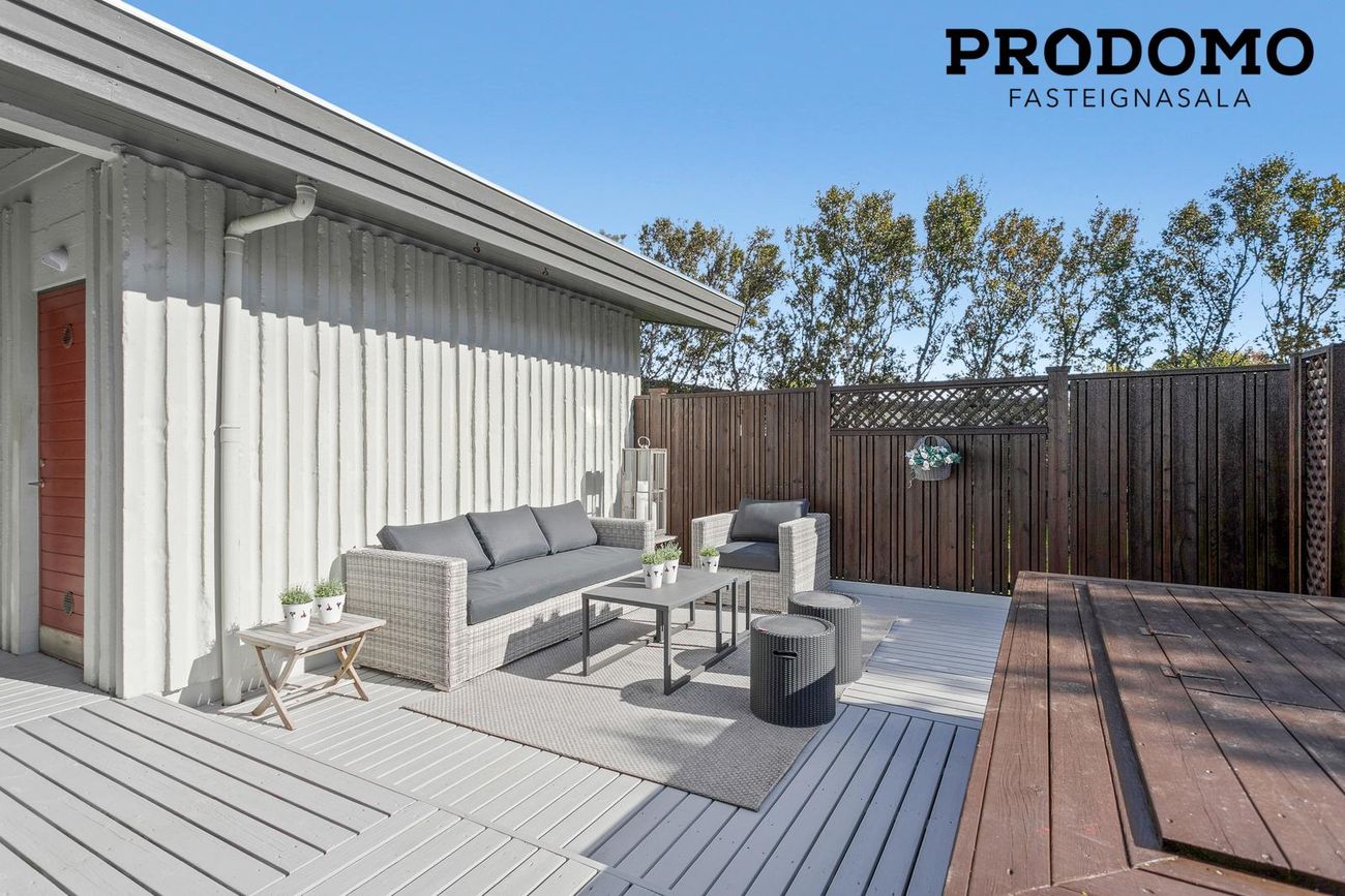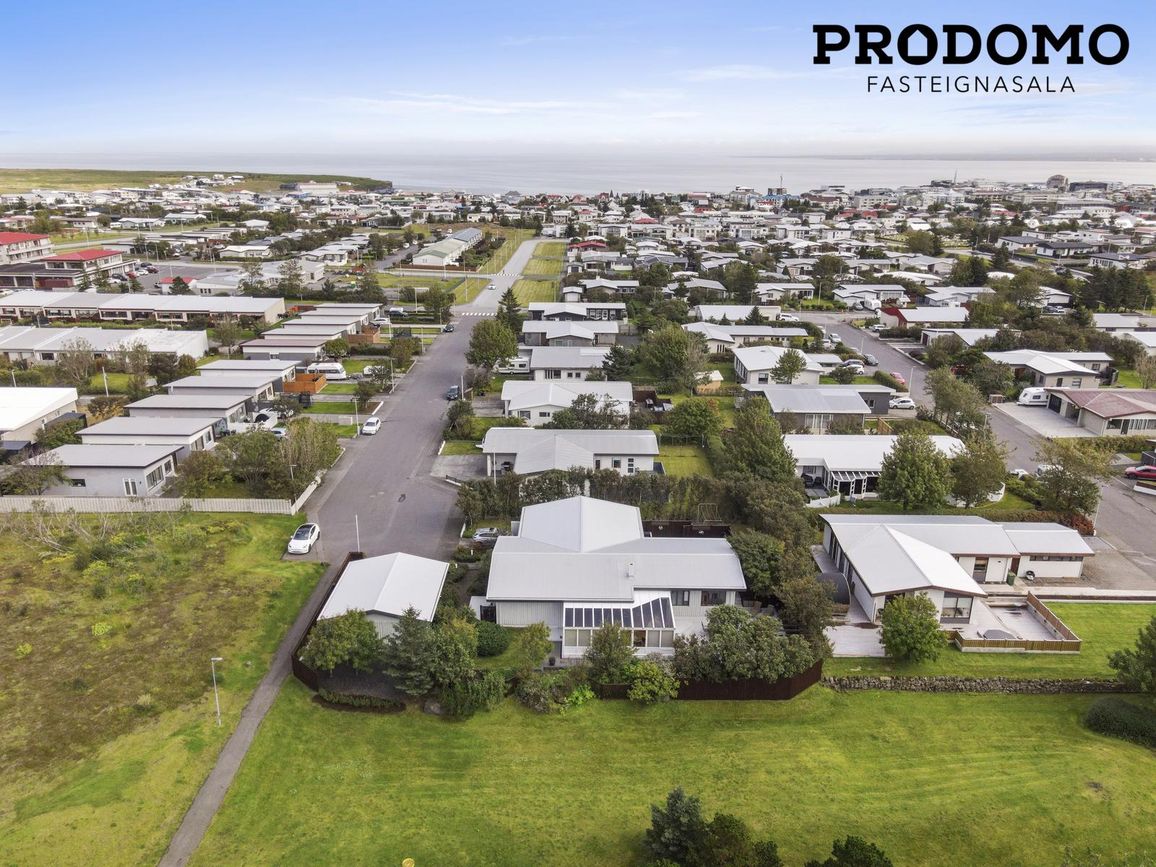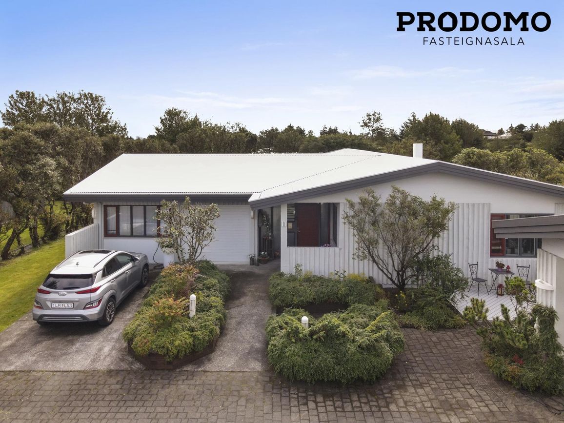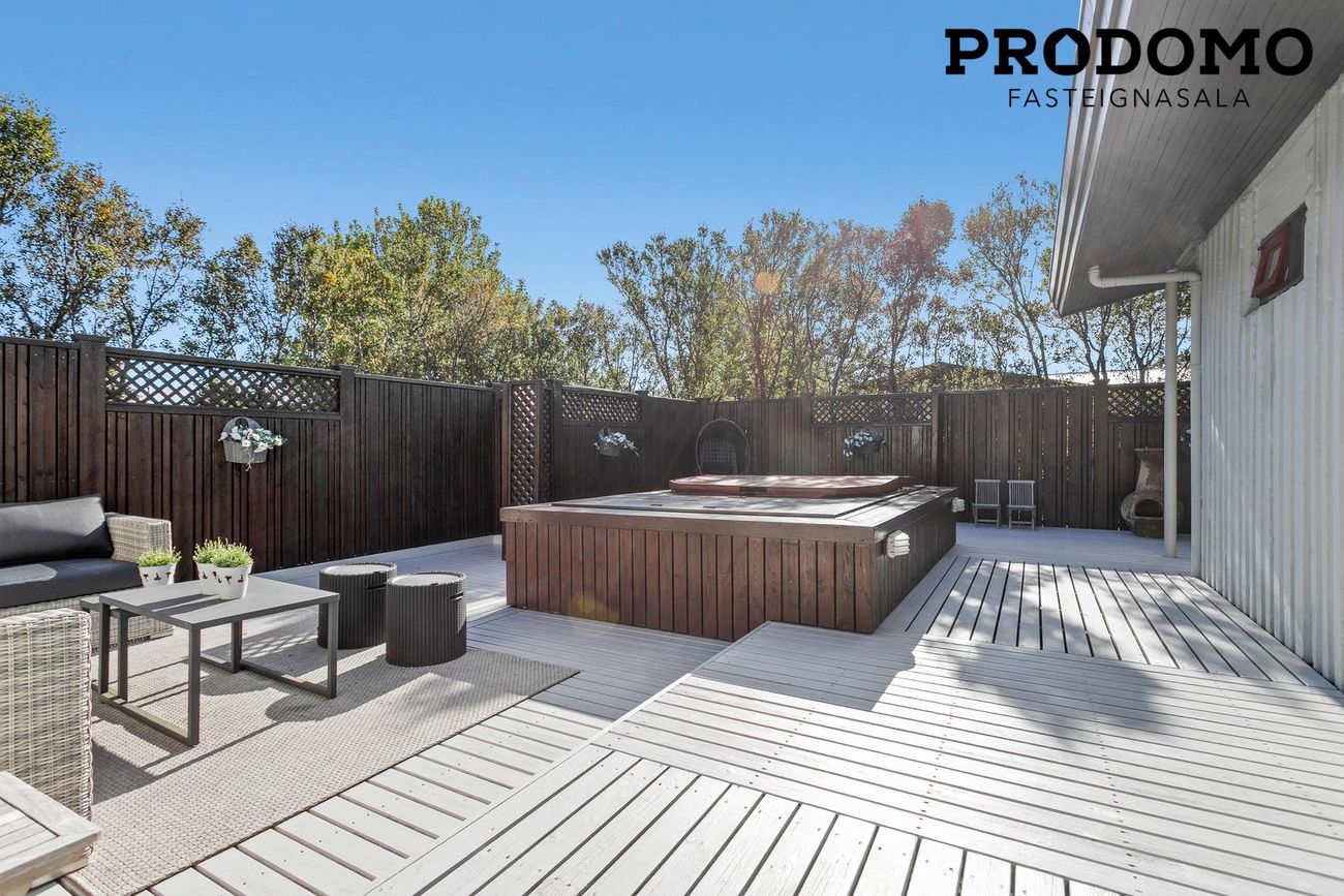 Lóð er mjög snyrtileg með miklum gróðri, verönd er beggja meginn við húsið þannig að sól næst frá morgni til kvölds, stéttar eru ýmist hellulagðar eða steyptar og er hitalögn í bílaplani en er ótengt í dag.