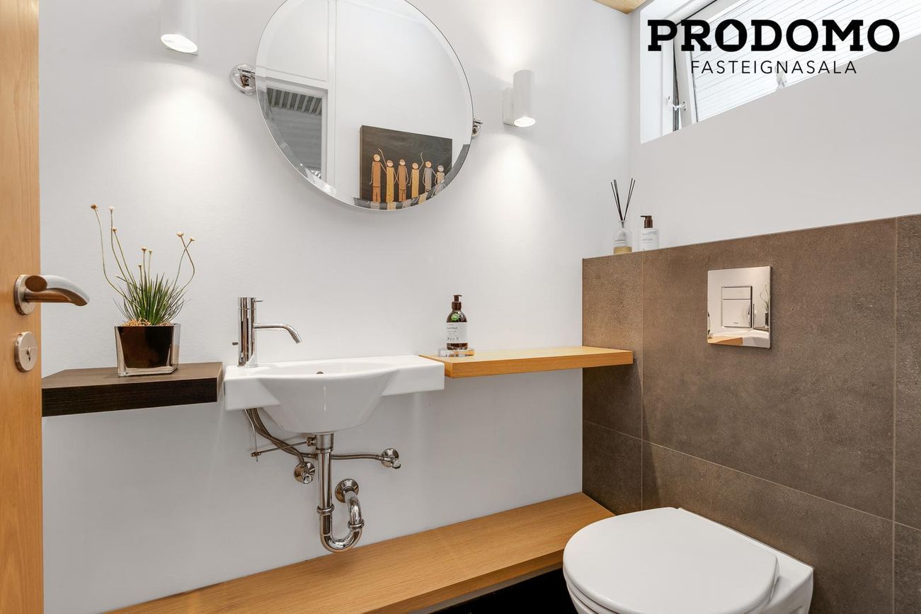 Gestasnyrting nýlega endurnýjuð með flísum á gólfi og veggjum að hluta, upphengt salerni og vaskur.