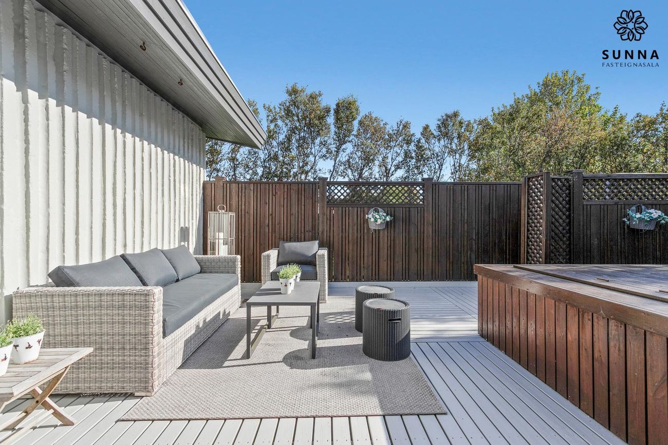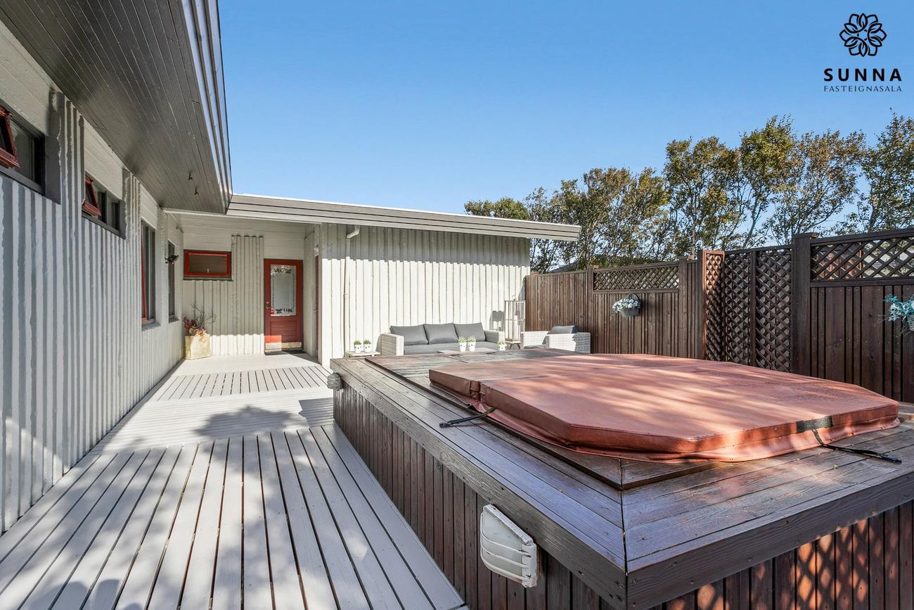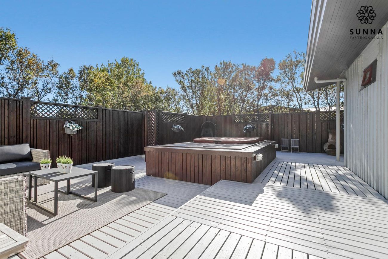Lokaður sólpallur með heitum potti. Sólin næst allan daginn (morgun-/dagsól öðru megin, síðdegis-/kvöldsól hinu megin).