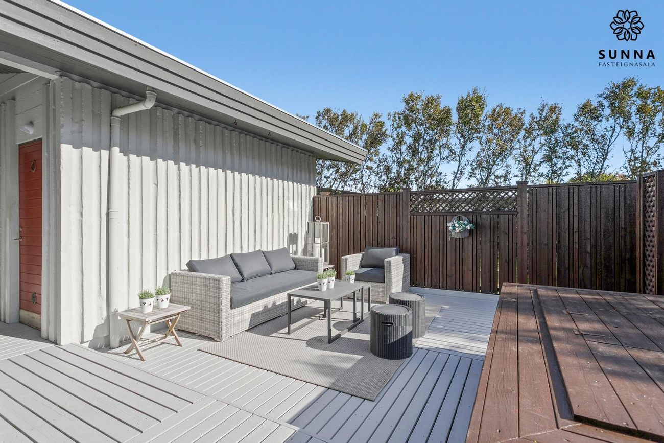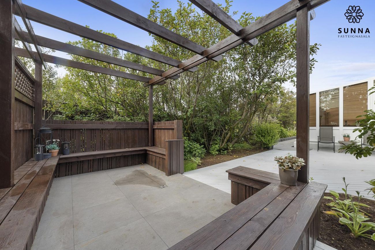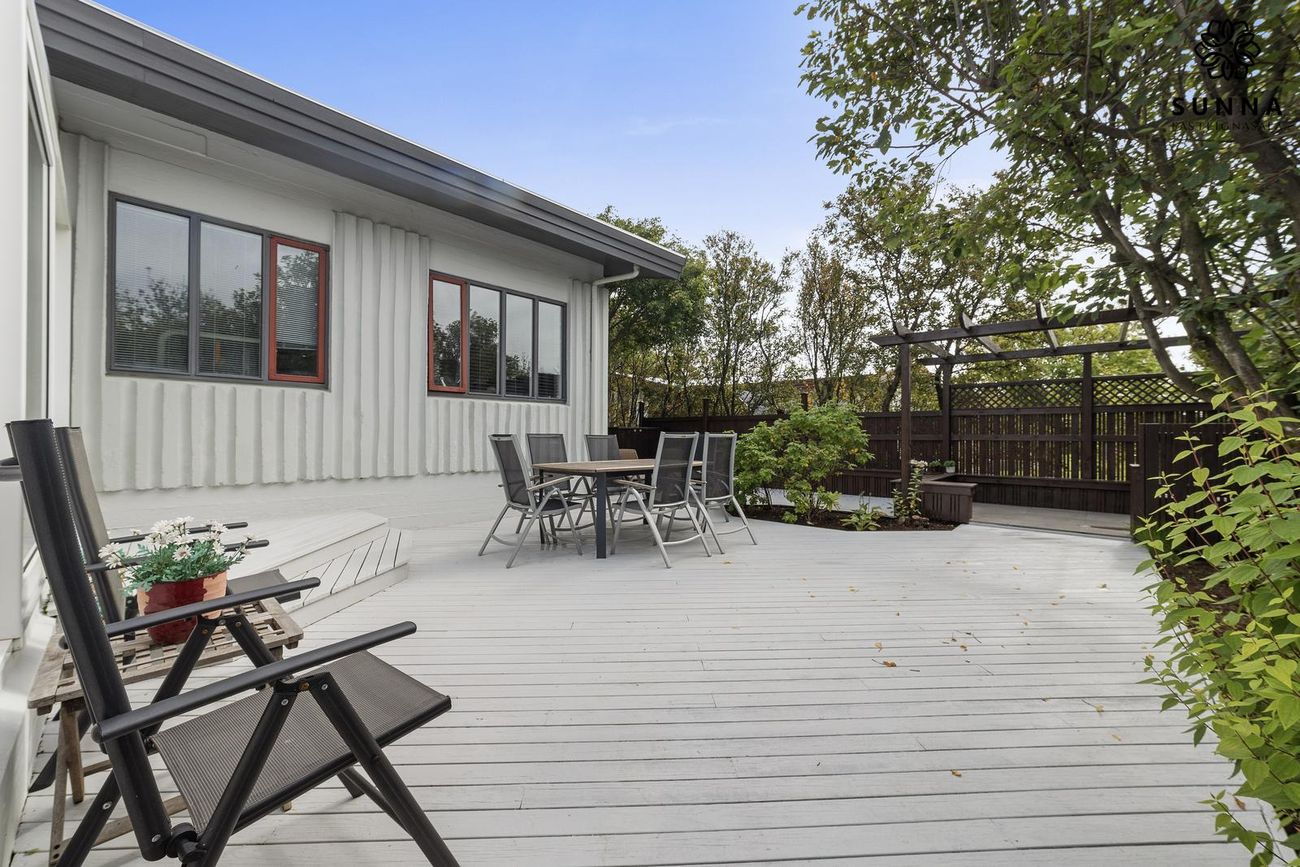 Lokaður sólpallur með heitum potti. Sólin næst allan daginn (morgun-/dagsól öðru megin, síðdegis-/kvöldsól hinu megin).
