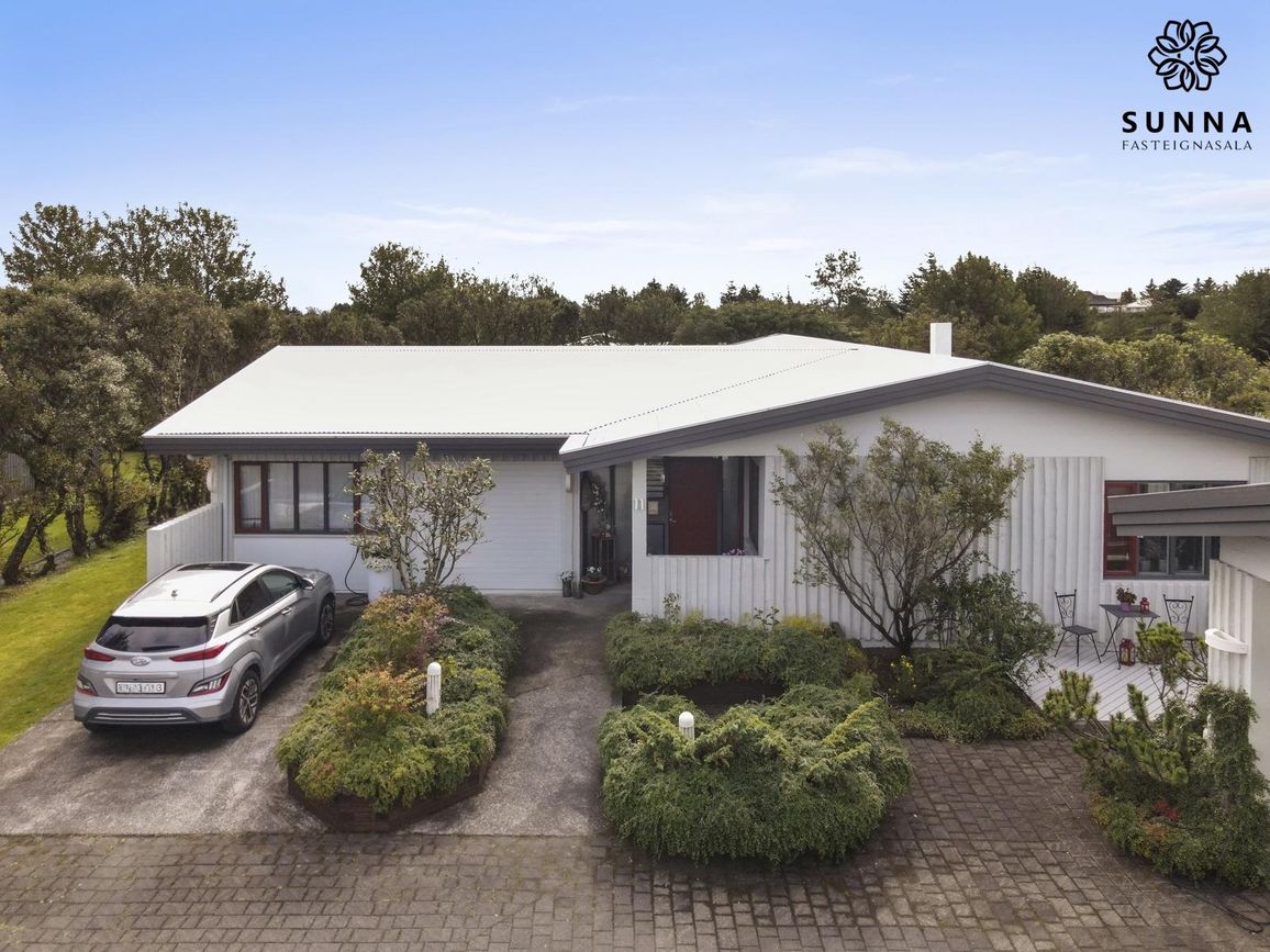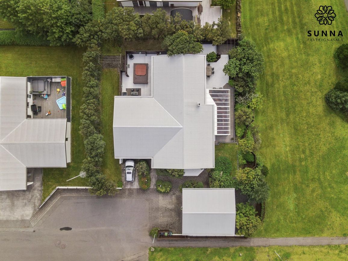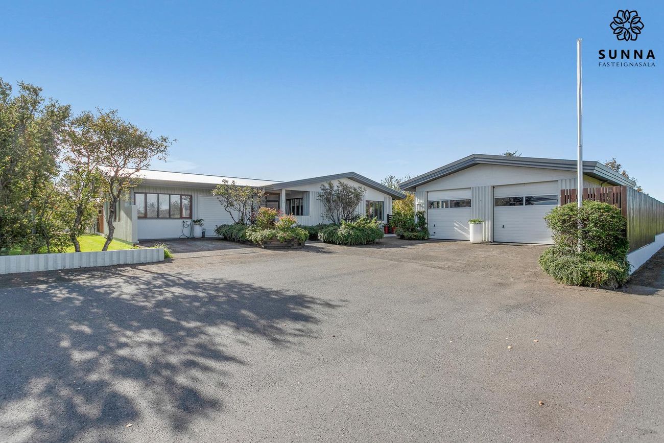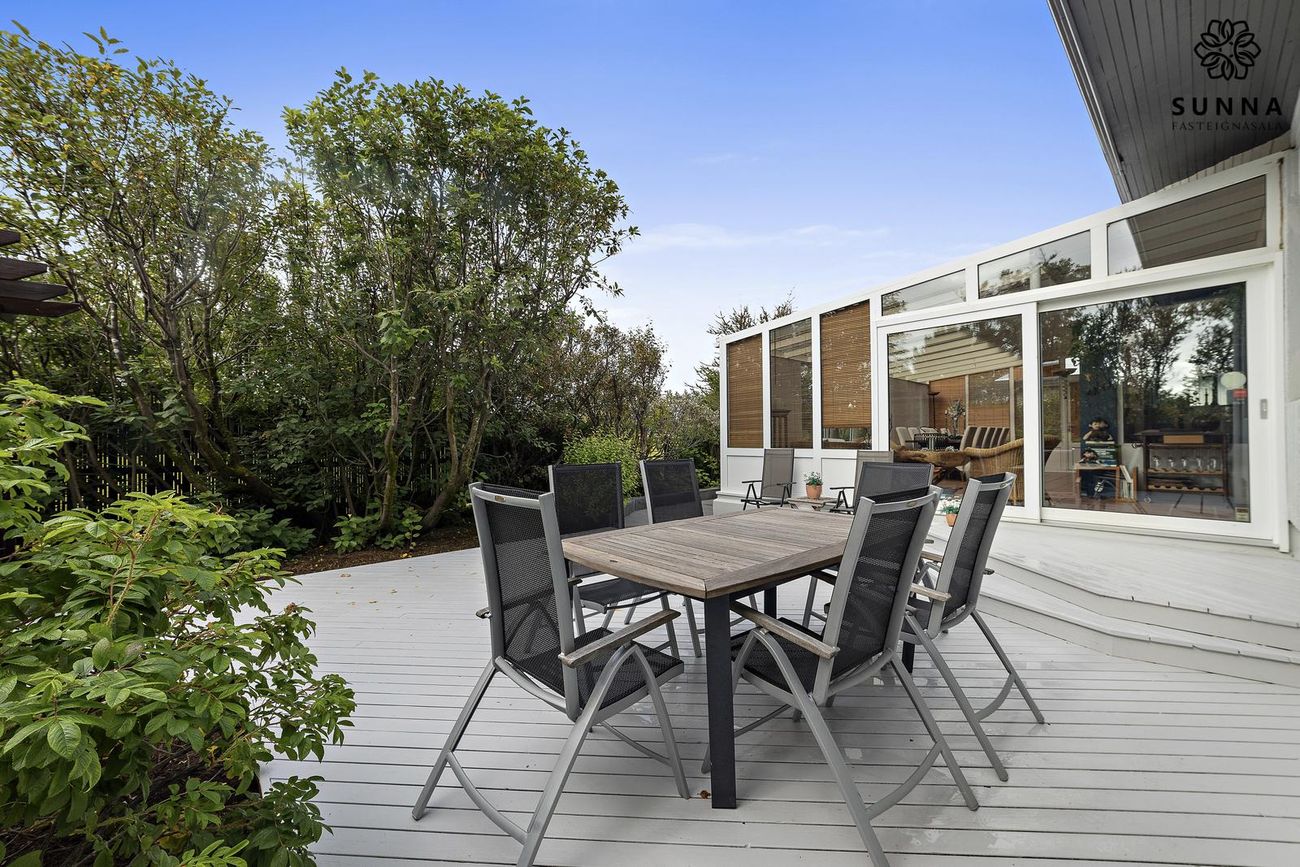 Byggt 1974. Forstofa með skápaplássi, gestasnyrting, innangöng í bílskúr/svissvæði (53,5 fm). Þvottahús með góðri innréttingu. Aðalrými með stofu, borðstofu, sólstofu (42 fm) og eldhúsi. Svefnherbergisgangur með 3 svefnherbergjum og fataherbergi. Baðherbergi með sturtuklefa.