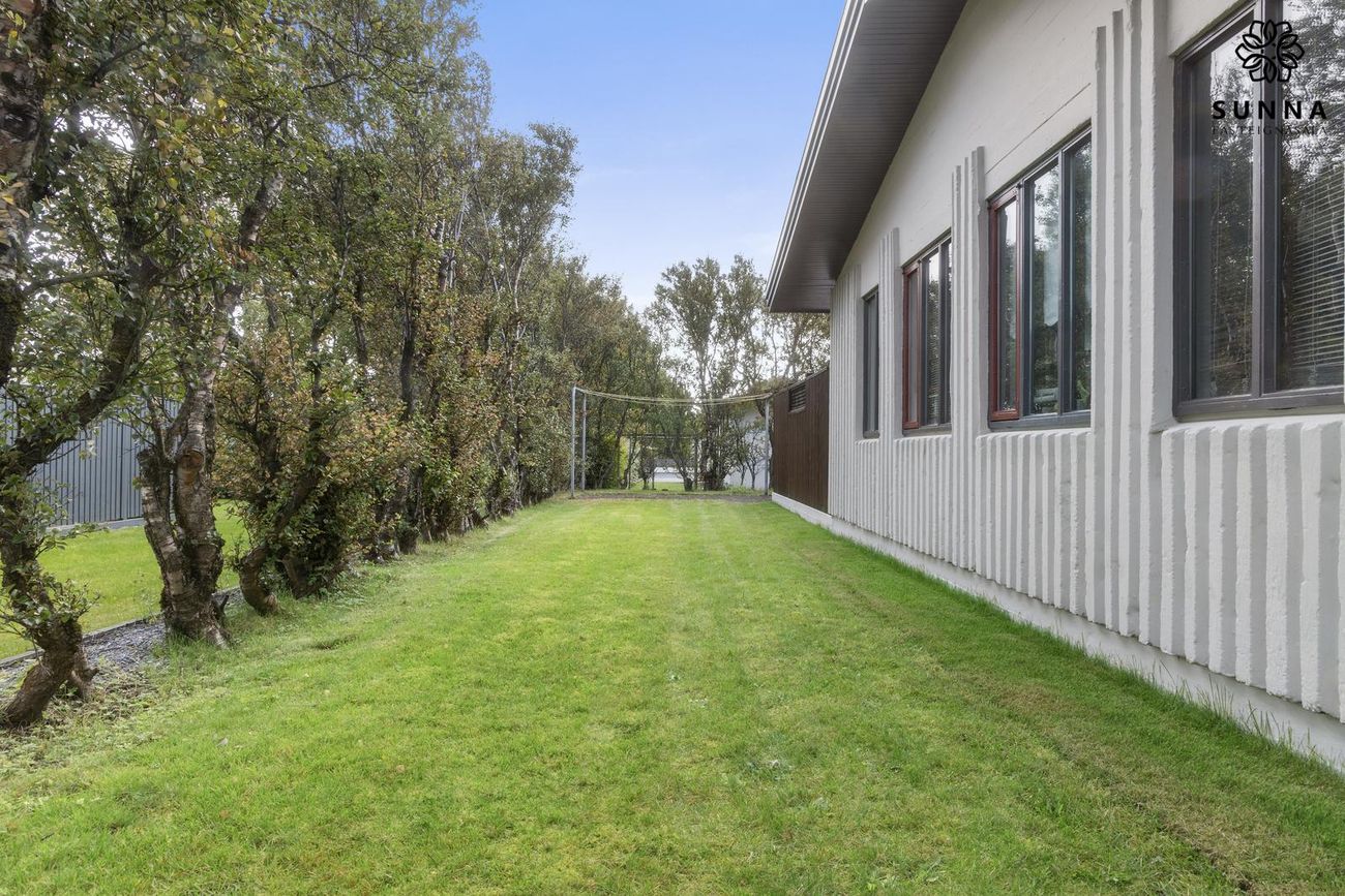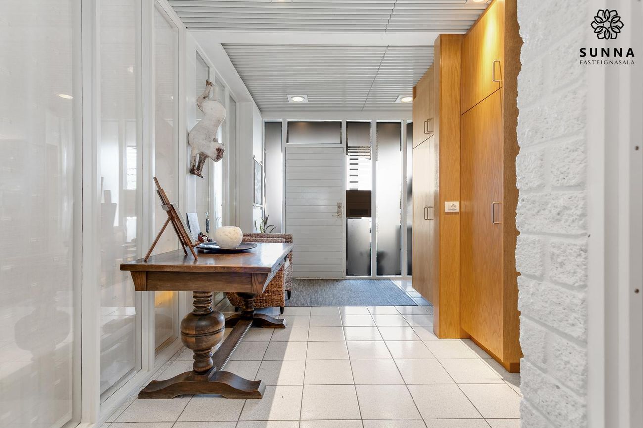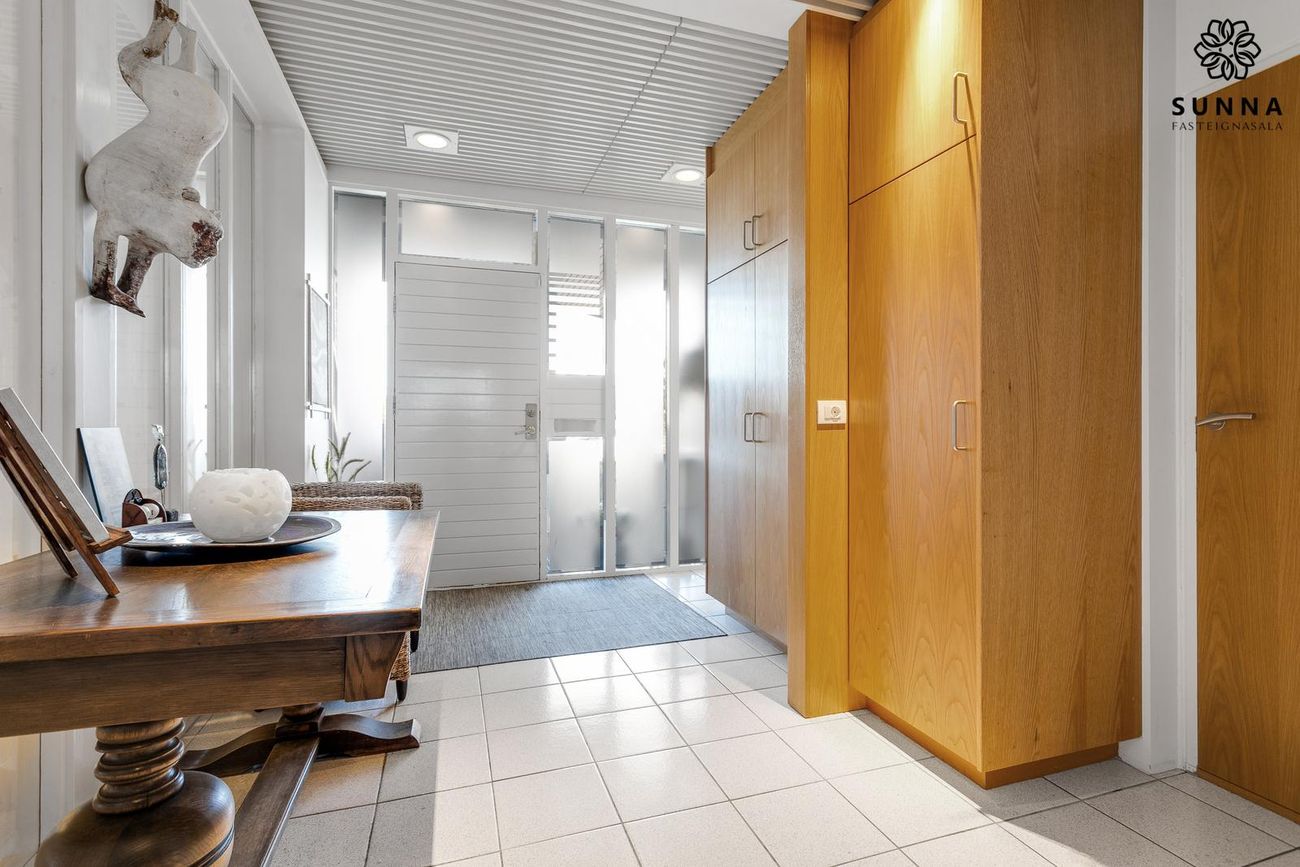 Byggt 1974. Forstofa með skápaplássi, gestasnyrting, innangöng í bílskúr/svissvæði (53,5 fm). Þvottahús með góðri innréttingu. Aðalrými með stofu, borðstofu, sólstofu (42 fm) og eldhúsi. Svefnherbergisgangur með 3 svefnherbergjum og fataherbergi. Baðherbergi með sturtuklefa.