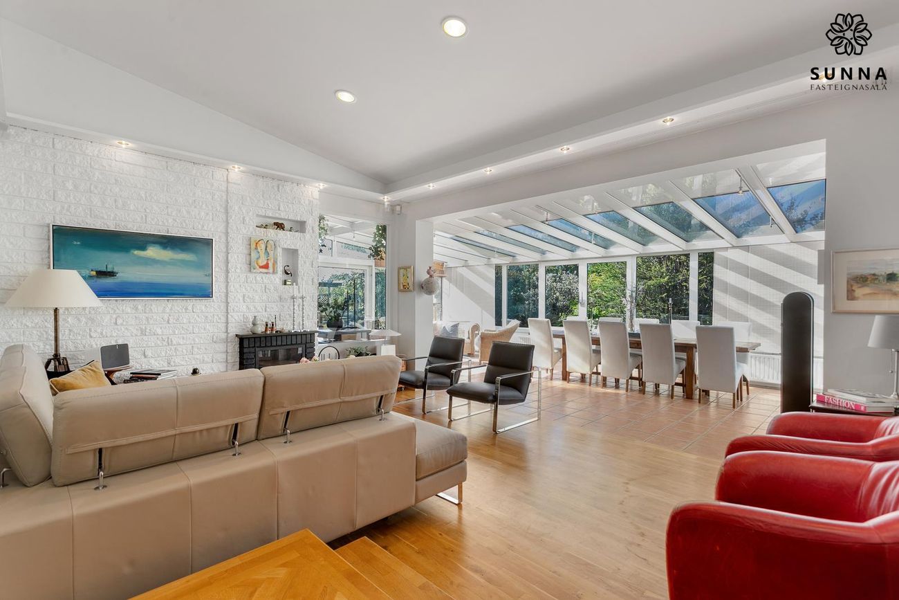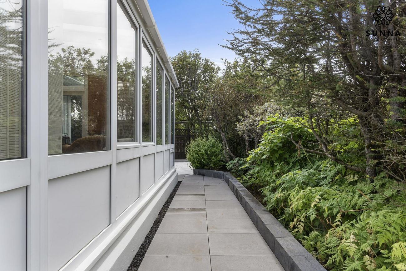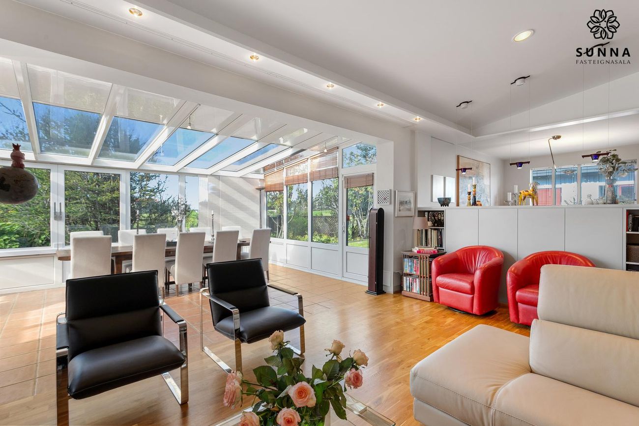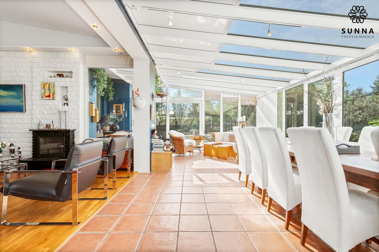 Einbýlishús, 304 fm samtals, 194,8 fm íbúðarrými. Fasteignamat kr. 130.850.000. 3 svefnherbergi, nýtt baðherbergi (2023), sólstofa með gólfhita, ný Miele-tæki í eldhúsi.