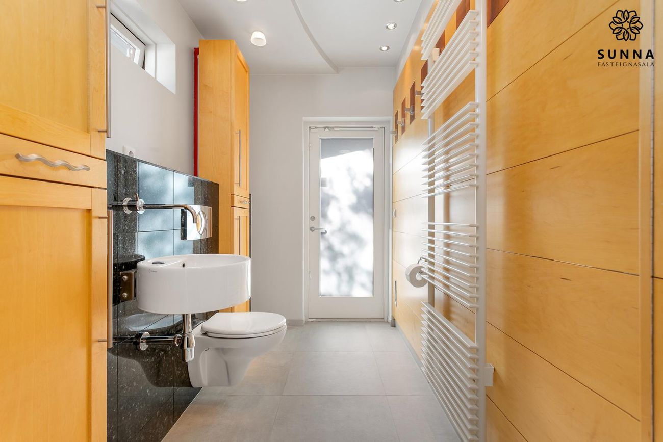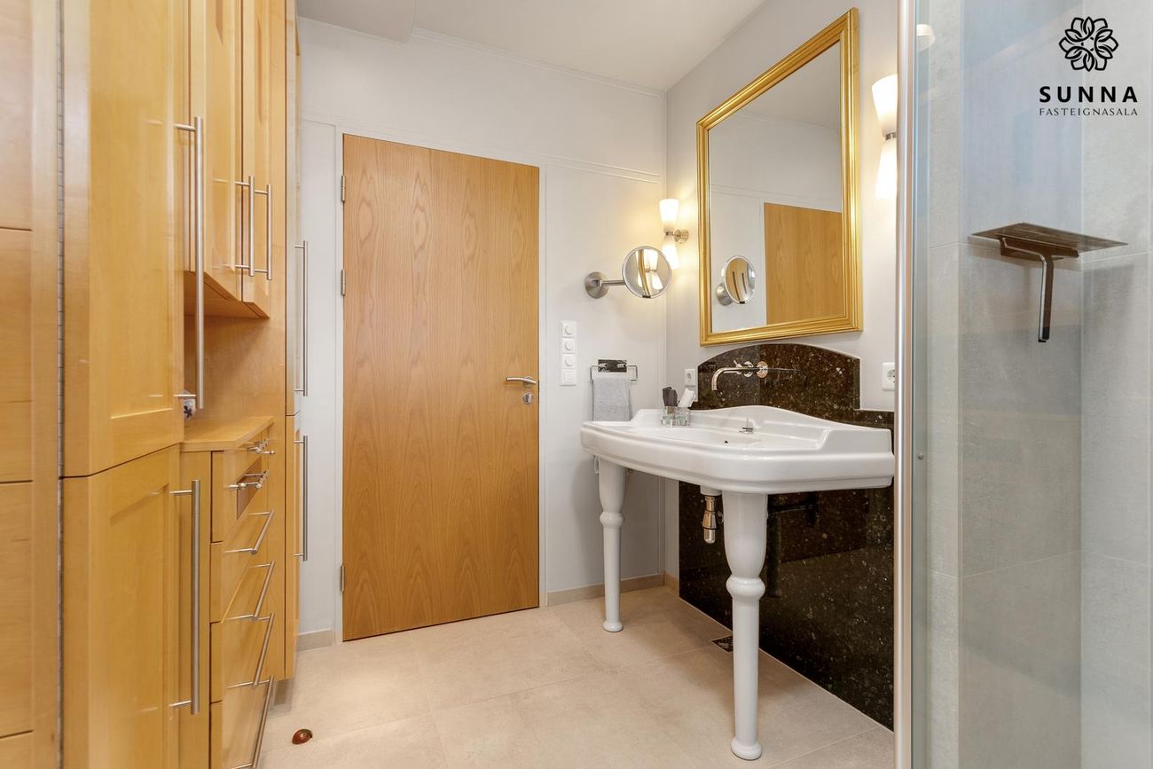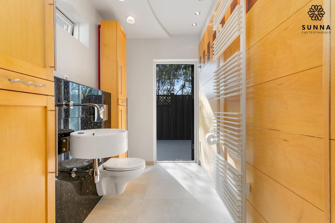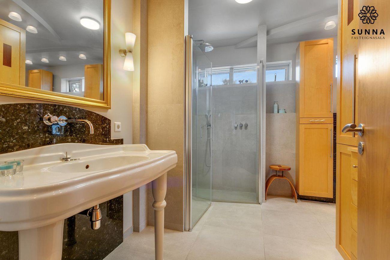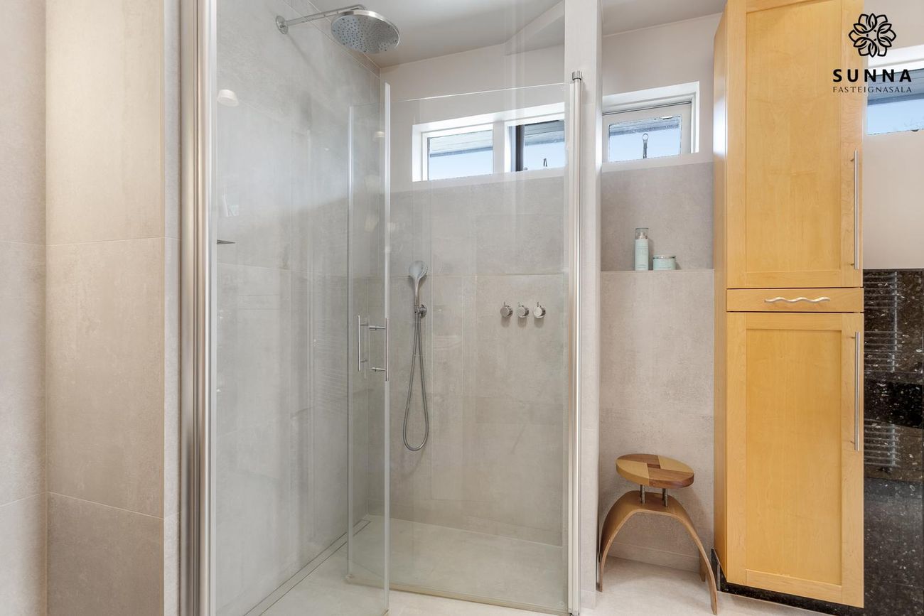 Mjög rúmgott baðherbergi með stórum sturtuklefa, endurnýjað 2023. Op á sólpall.