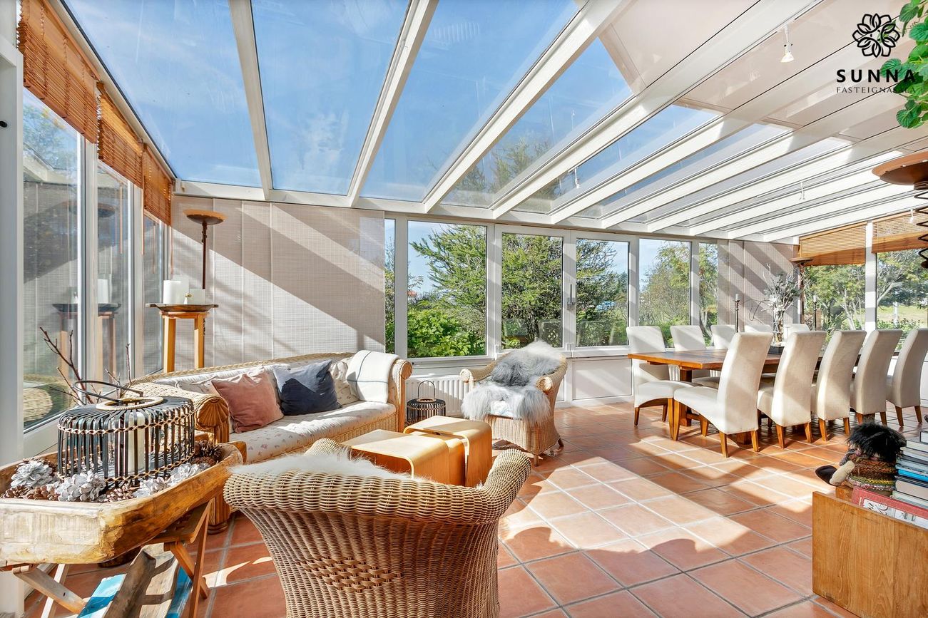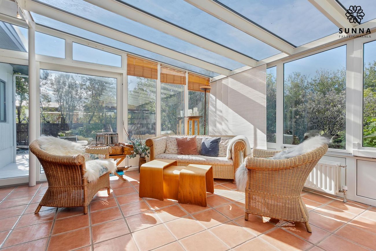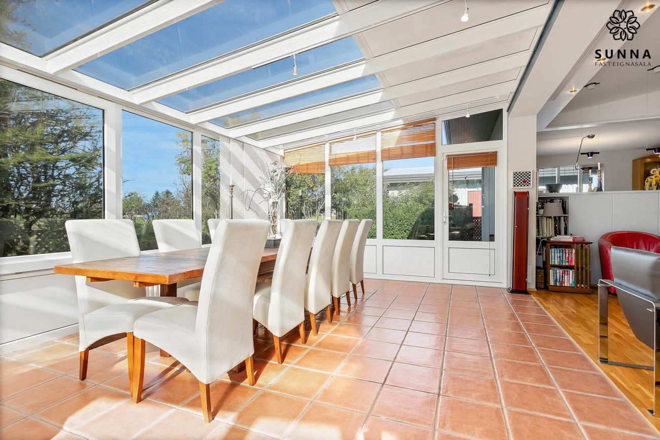 Sólstofa (42 fm) byggð 1999 með gólfhita. Rennihurð/gönguhurð. Svissvæði í bílskúr (~8 fm) hægt að breyta í herbergi.