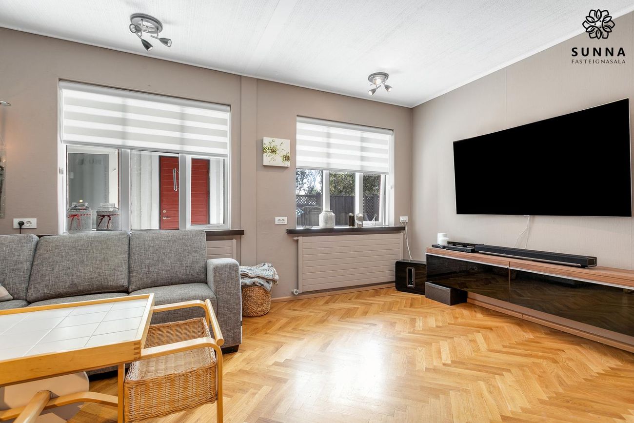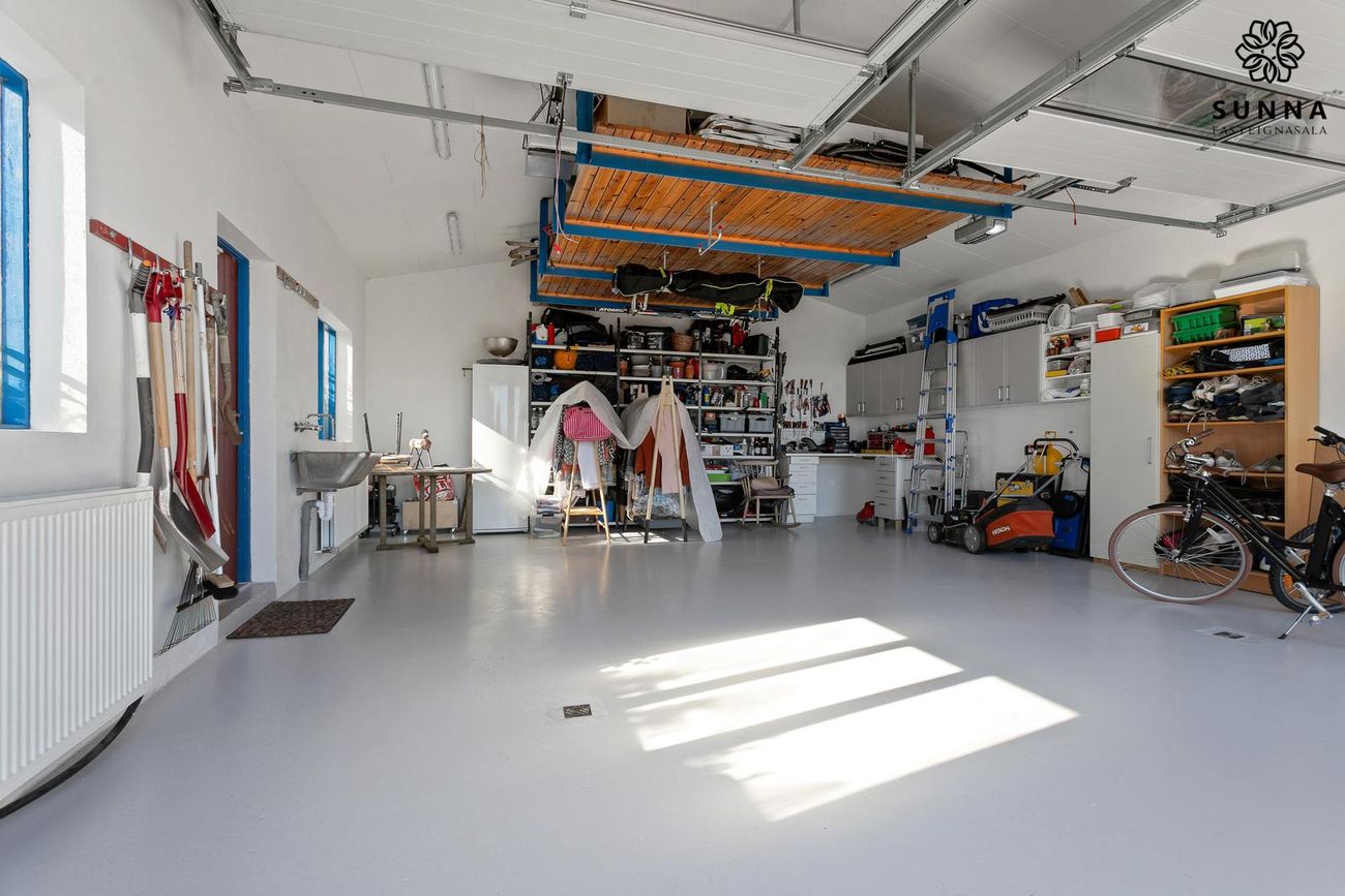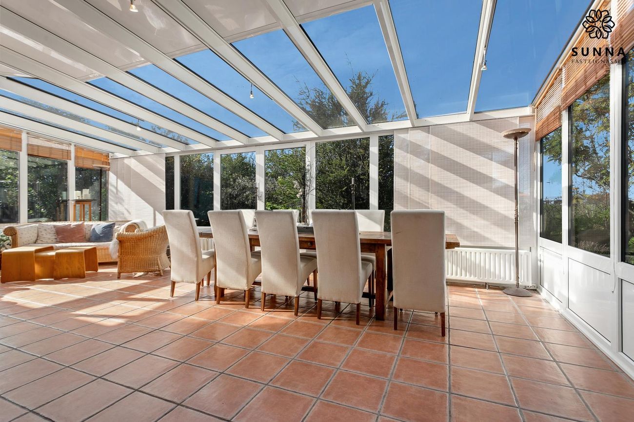 Sólstofa (42 fm) byggð 1999 með gólfhita. Rennihurð/gönguhurð. Svissvæði í bílskúr (~8 fm) hægt að breyta í herbergi.