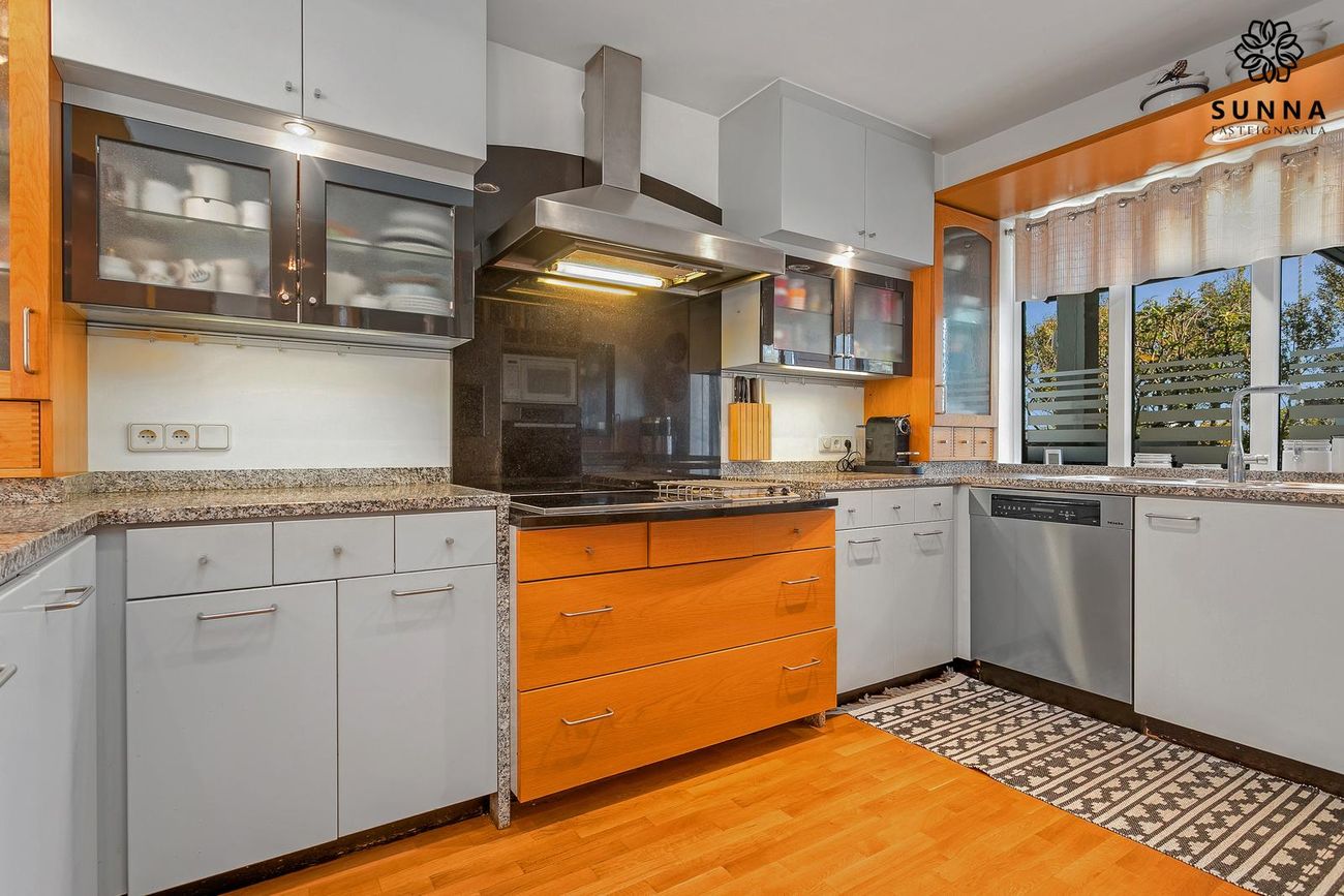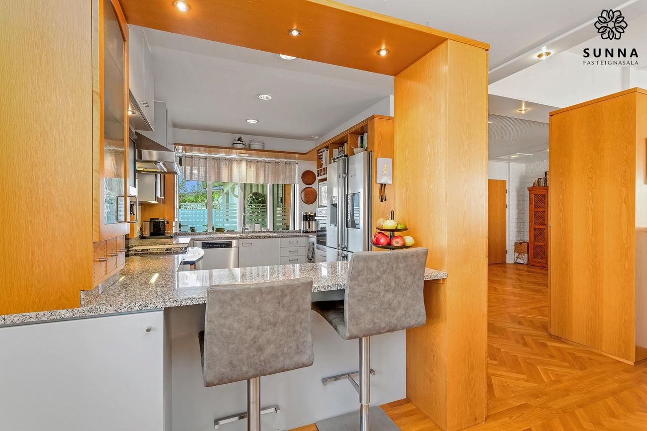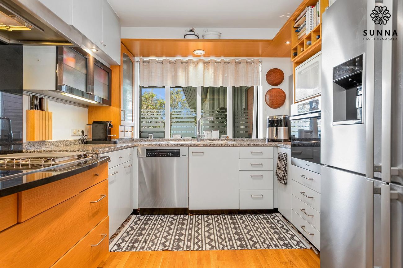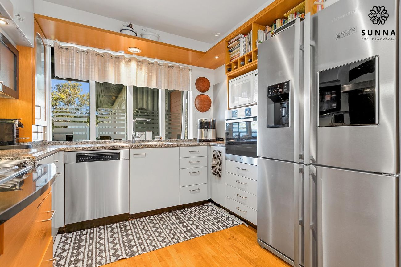 Með borðplötu úr steini. Nýlega skipt út Miele-tæki: uppþvottavél og helluborð (~1 ár), bökunarofn (~3 ár). Tvöfaldur ísskápur frá Bloomberg. Tvær gashellur við helluborð.